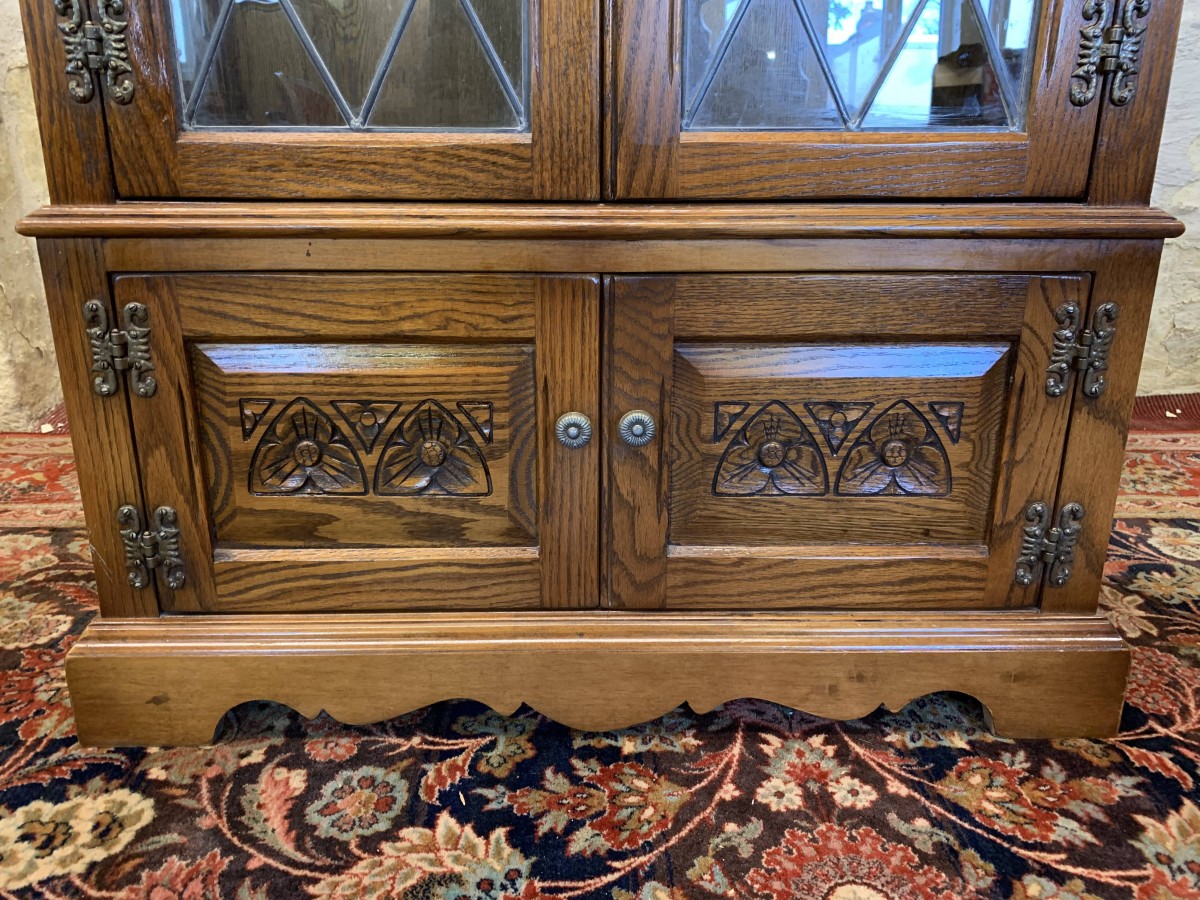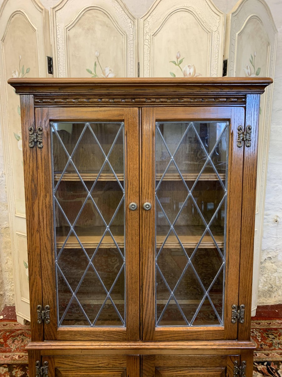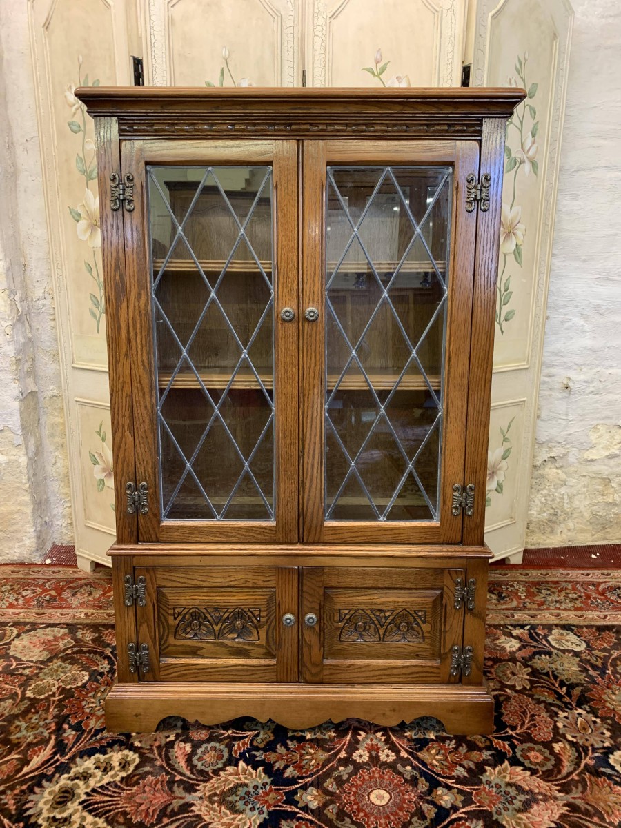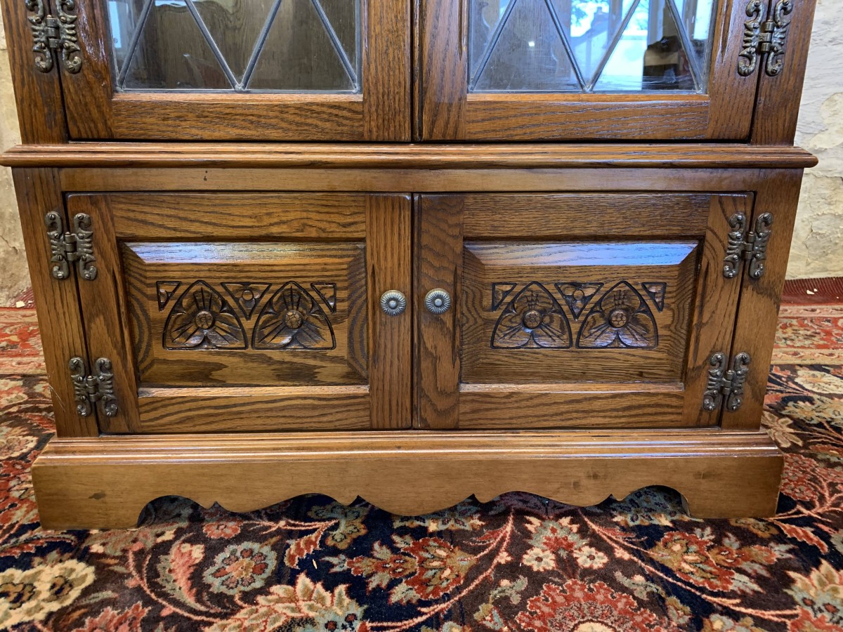 This super bookcase is in excellent condition and was made by the renowned Old Charm furniture company. The oversailing top sits above two glazed doors, the doors having leaded decoration, decorative hinges and turned handle. The doors open to reveal two adjustable and removable shelves. Below are a pair of carved recessed panelled doors, each door having decorative hinges and turned handle. The doors open to reveal a good sized storage space. Shaped skirt to the front, this super bookcase stands on bracket feet.