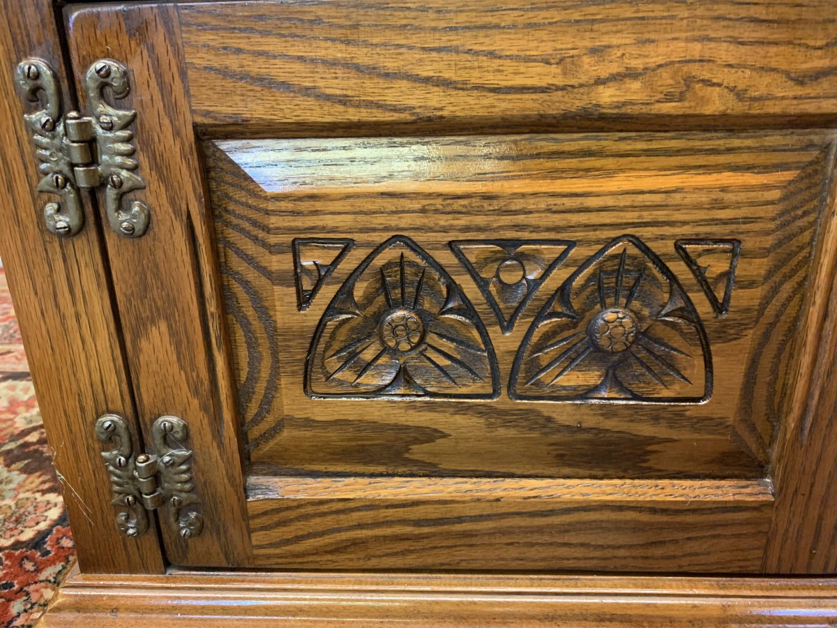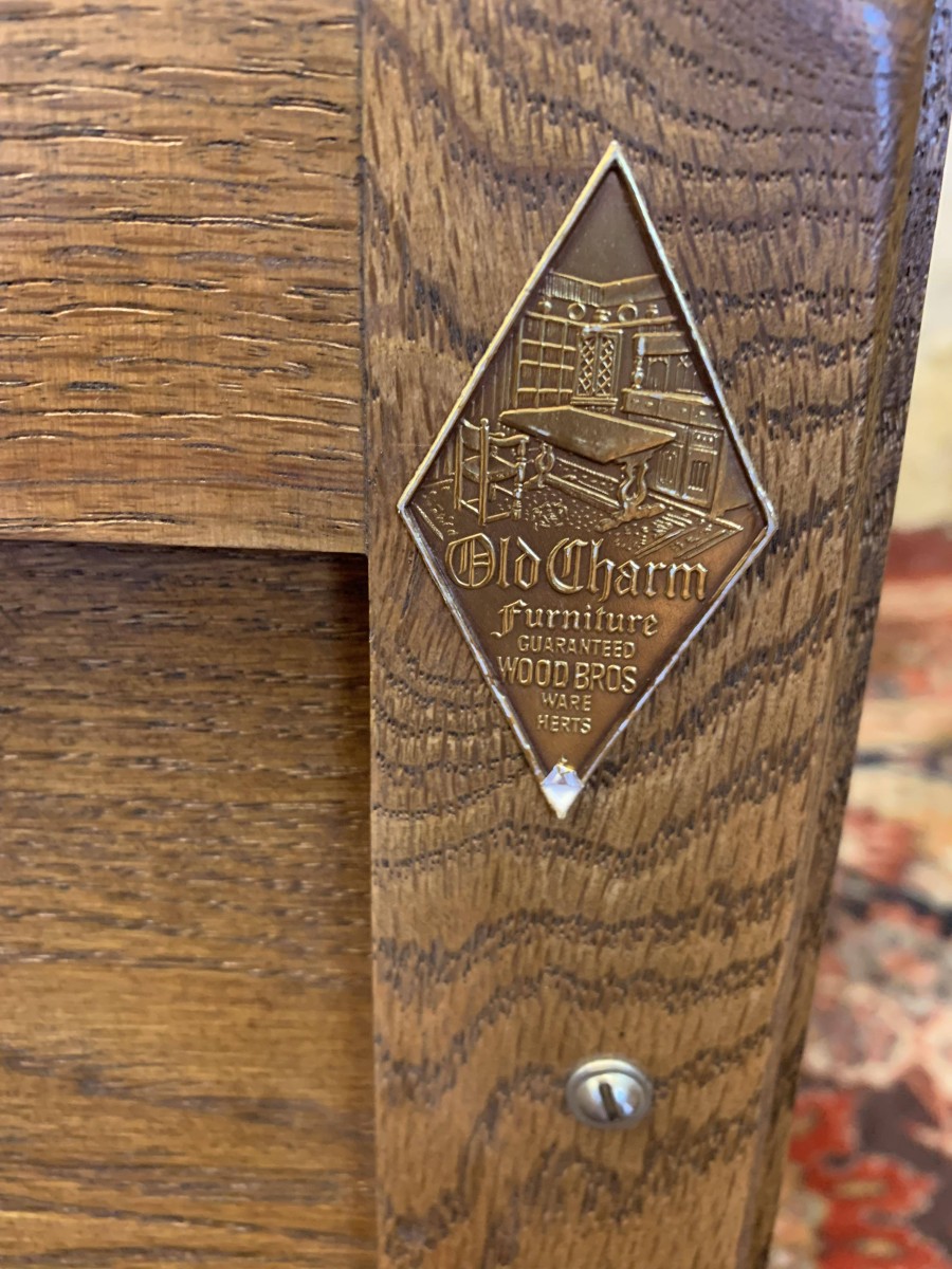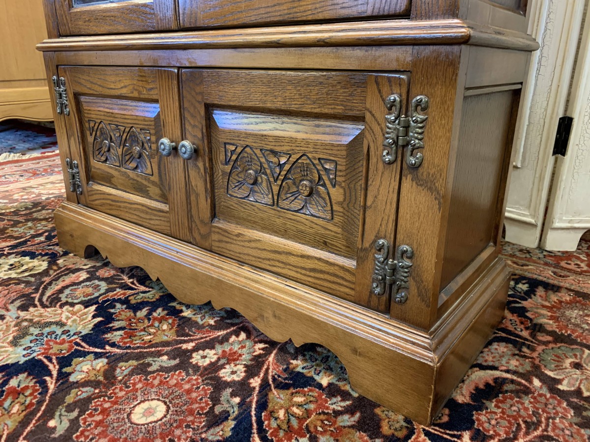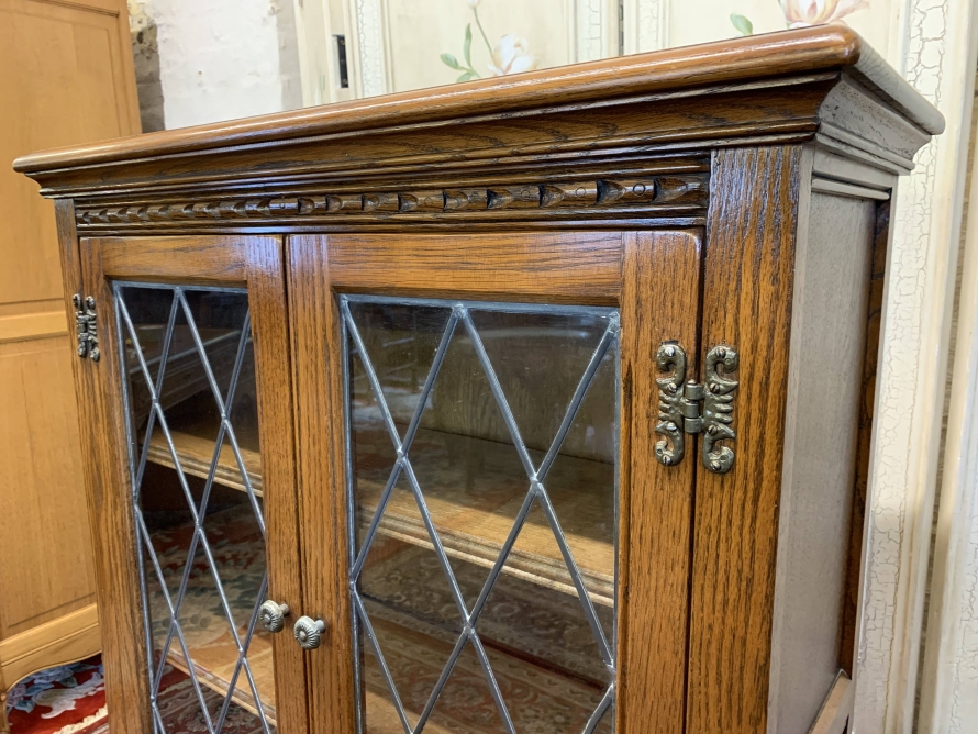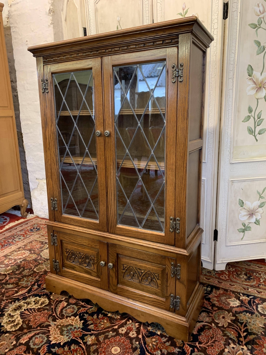 This super bookcase is in excellent condition and was made by the renowned Old Charm furniture company. The oversailing top sits above two glazed doors, the doors having leaded decoration, decorative hinges and turned handle. The doors open to reveal two adjustable and removable shelves. Below are a pair of carved recessed panelled doors, each door having decorative hinges and turned handle. The doors open to reveal a good sized storage space. Shaped skirt to the front, this super bookcase stands on bracket feet.