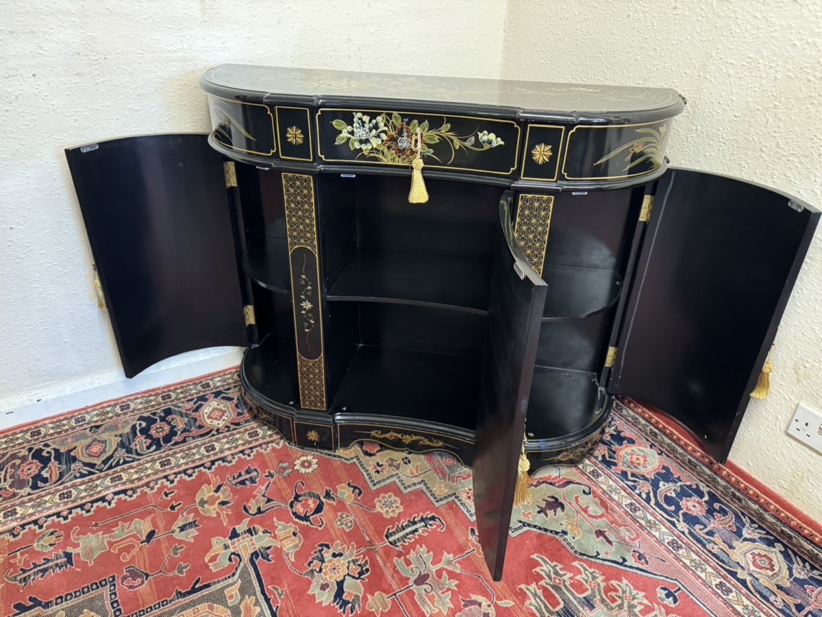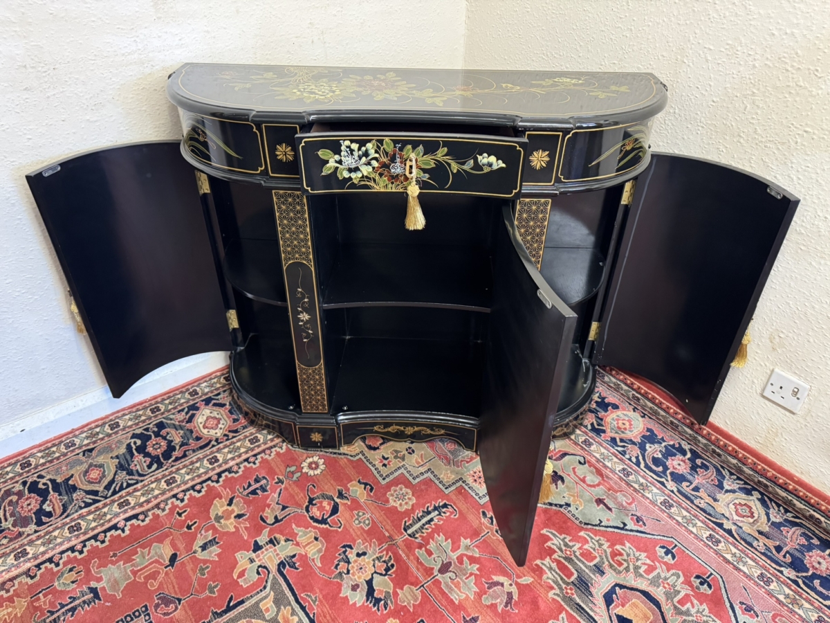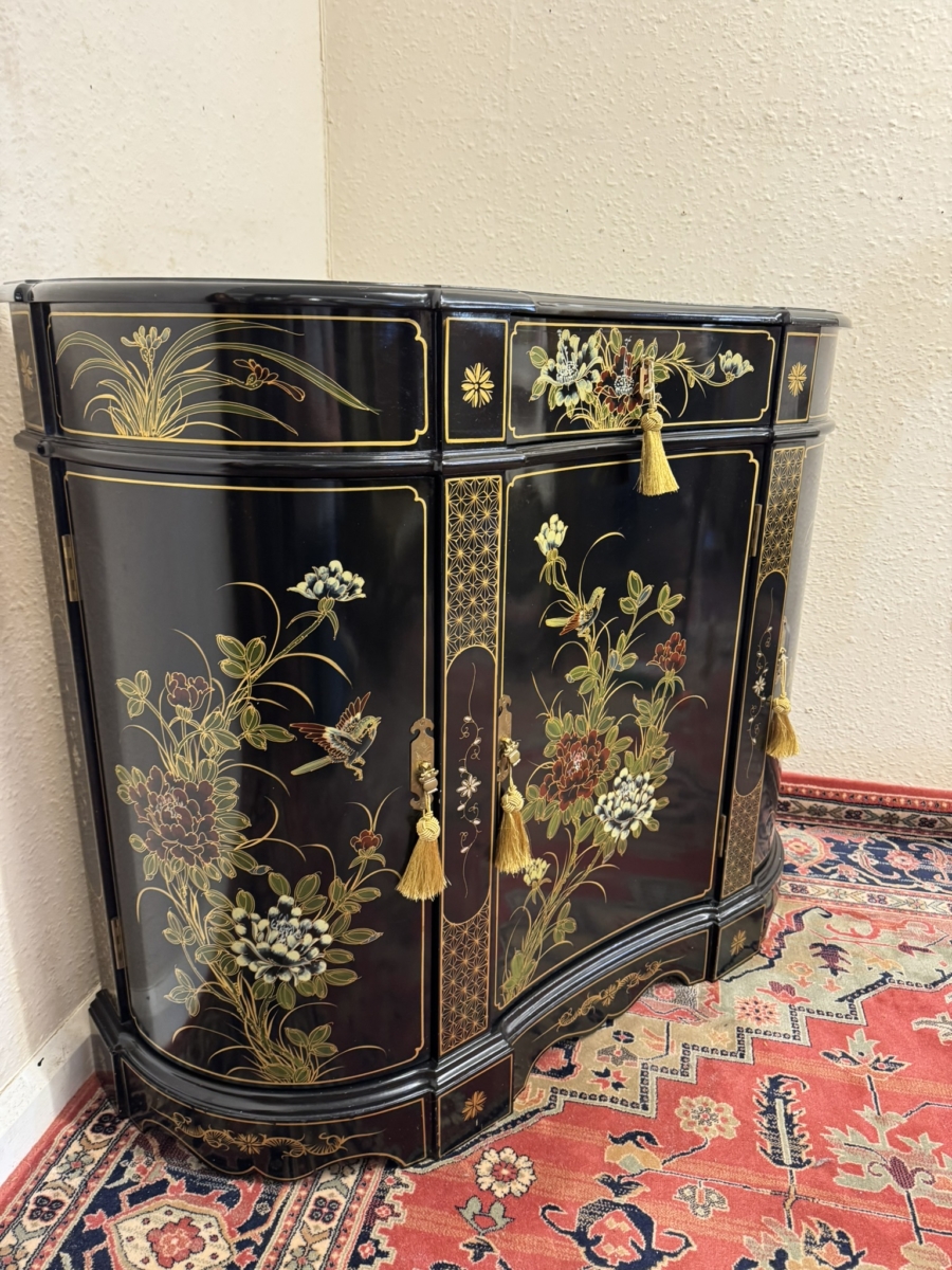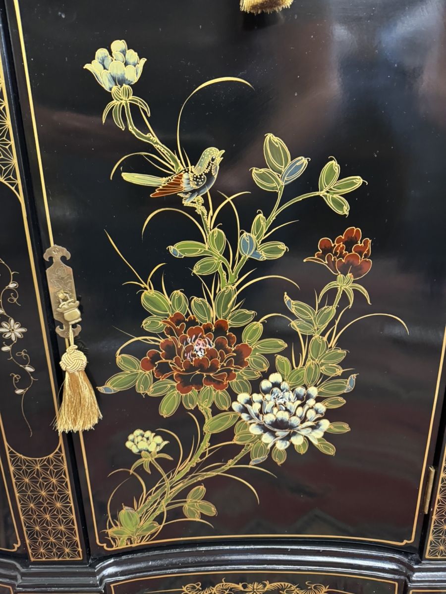 Black lacquered cabinet is in excellent condition. The curved top sits above a central drawer, below is a curved central door flanked by a pair of curved doors each door opens to reveal removable shelves. The cabinet is profusely decorated with striking scenes depicting flowers and birds with gold accents throughout, the credenza sits on a shaped plinth base.