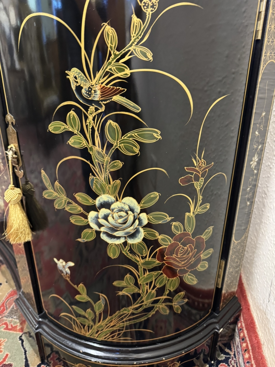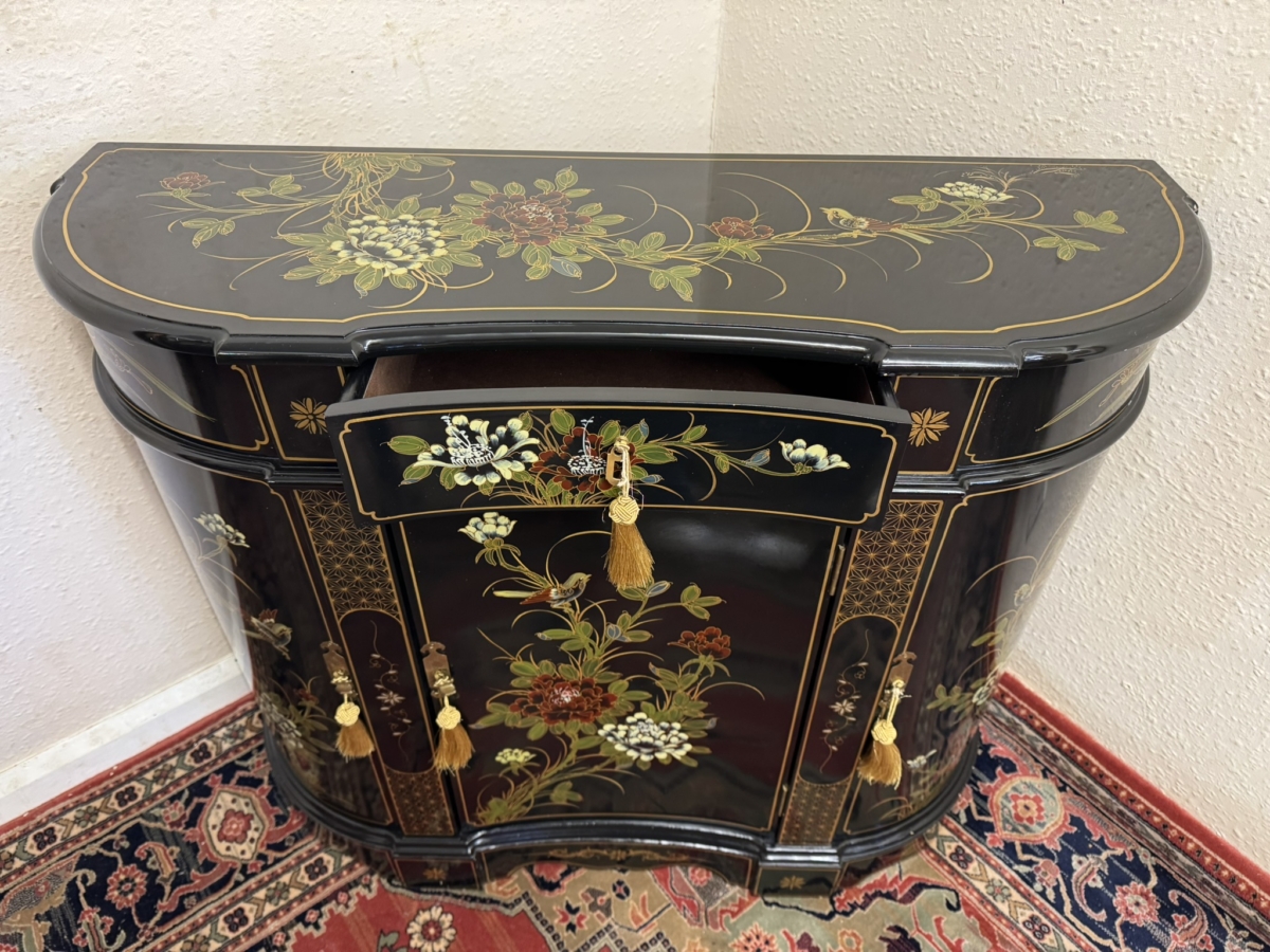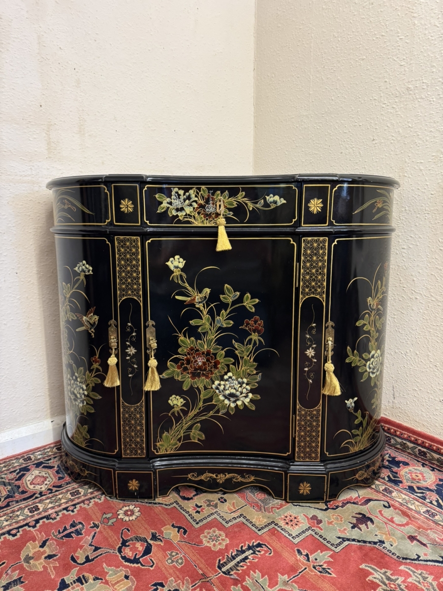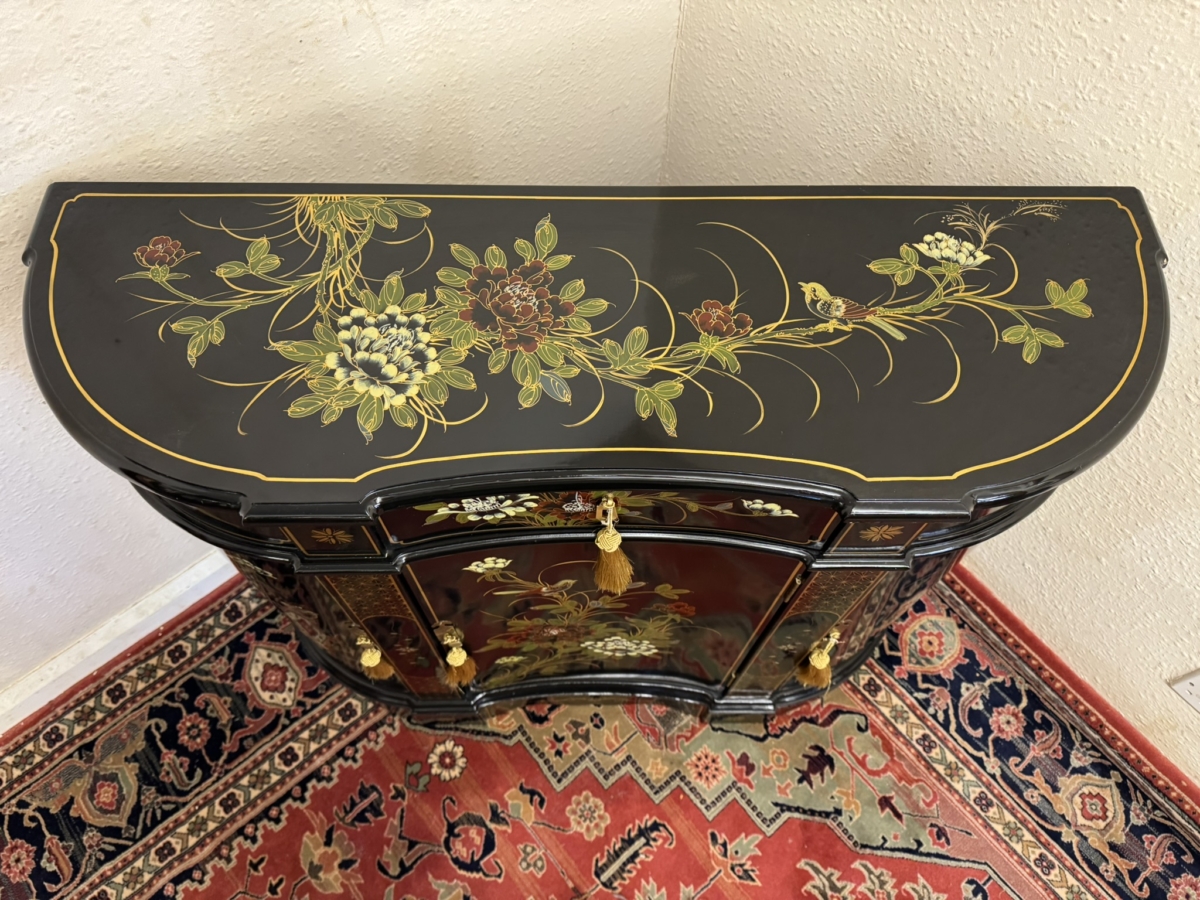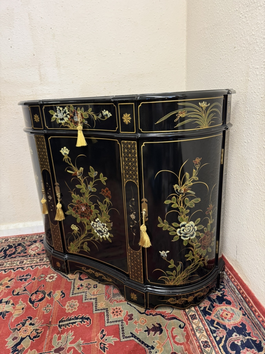 Black lacquered cabinet is in excellent condition. The curved top sits above a central drawer, below is a curved central door flanked by a pair of curved doors each door opens to reveal removable shelves. The cabinet is profusely decorated with striking scenes depicting flowers and birds with gold accents throughout, the credenza sits on a shaped plinth base.