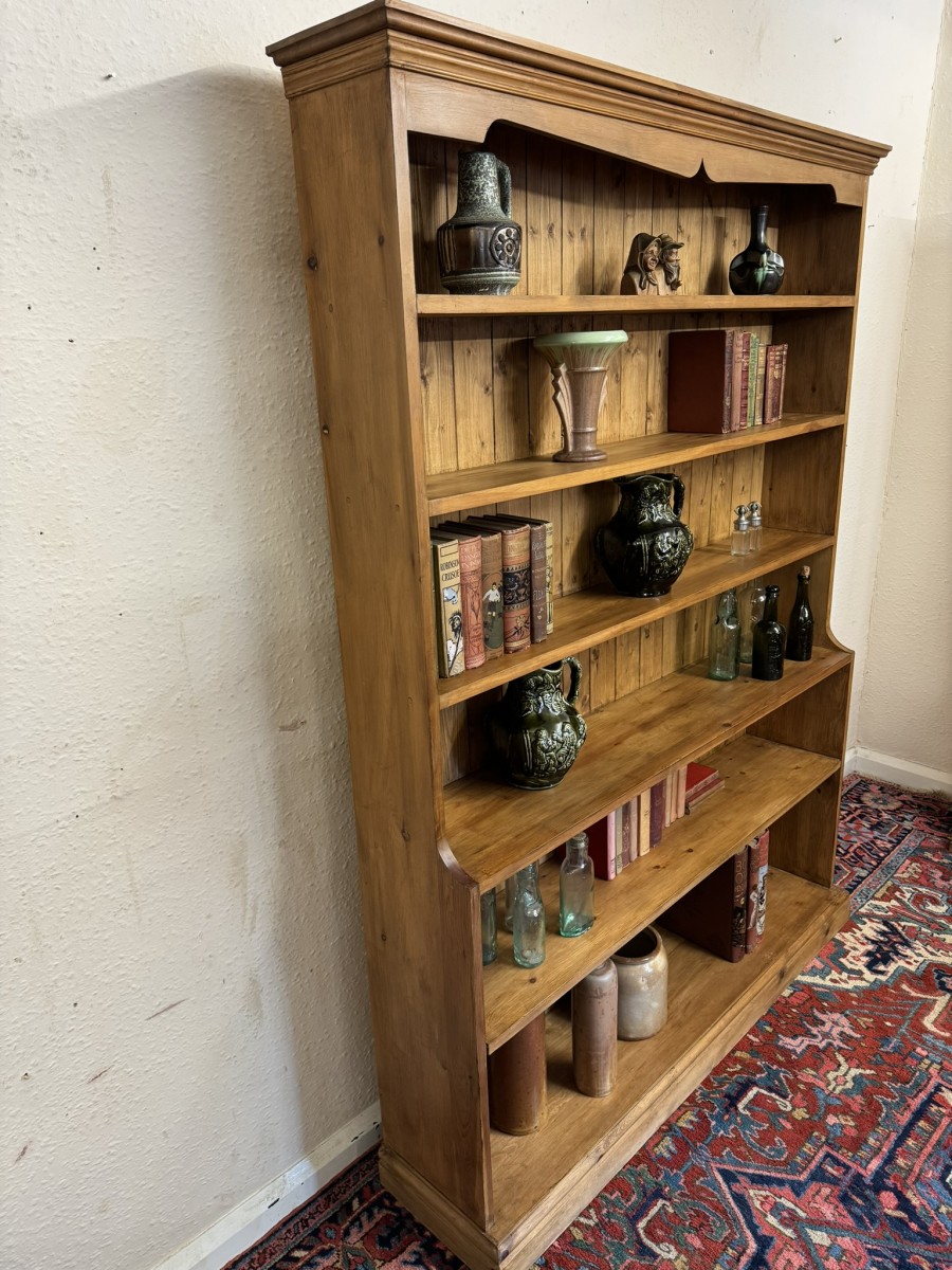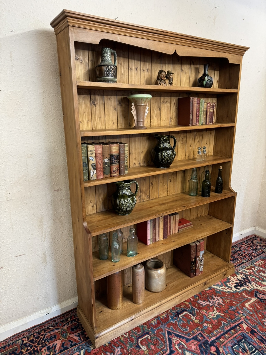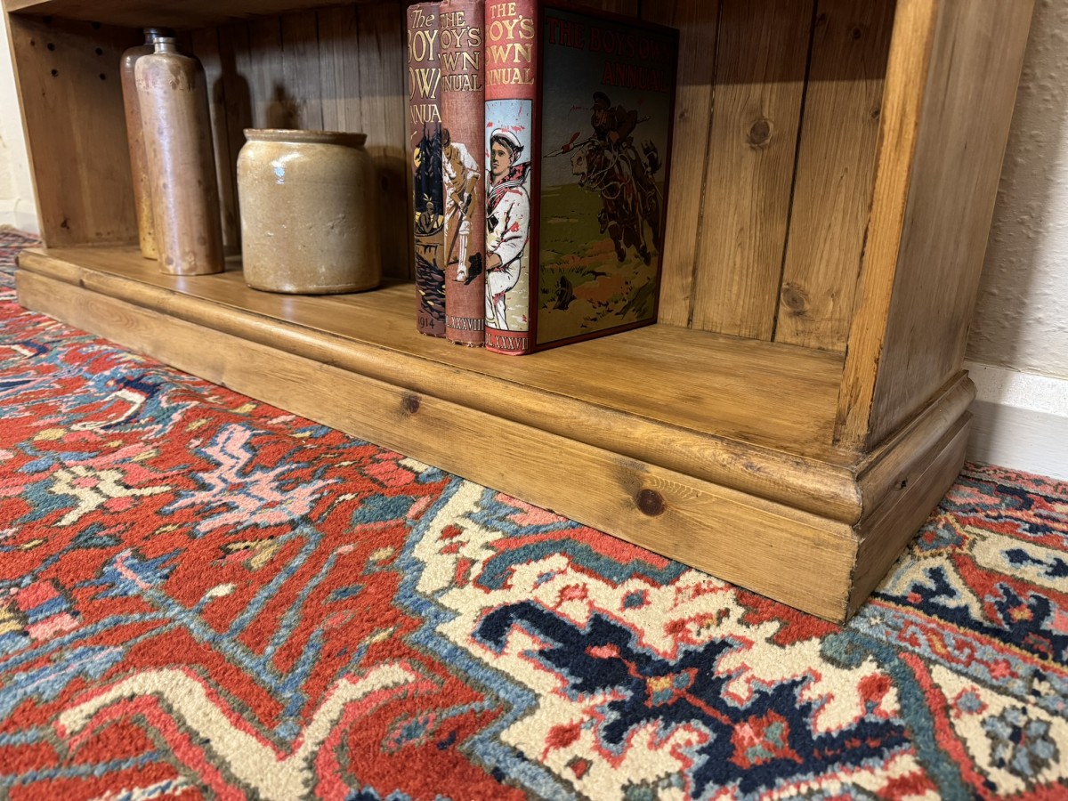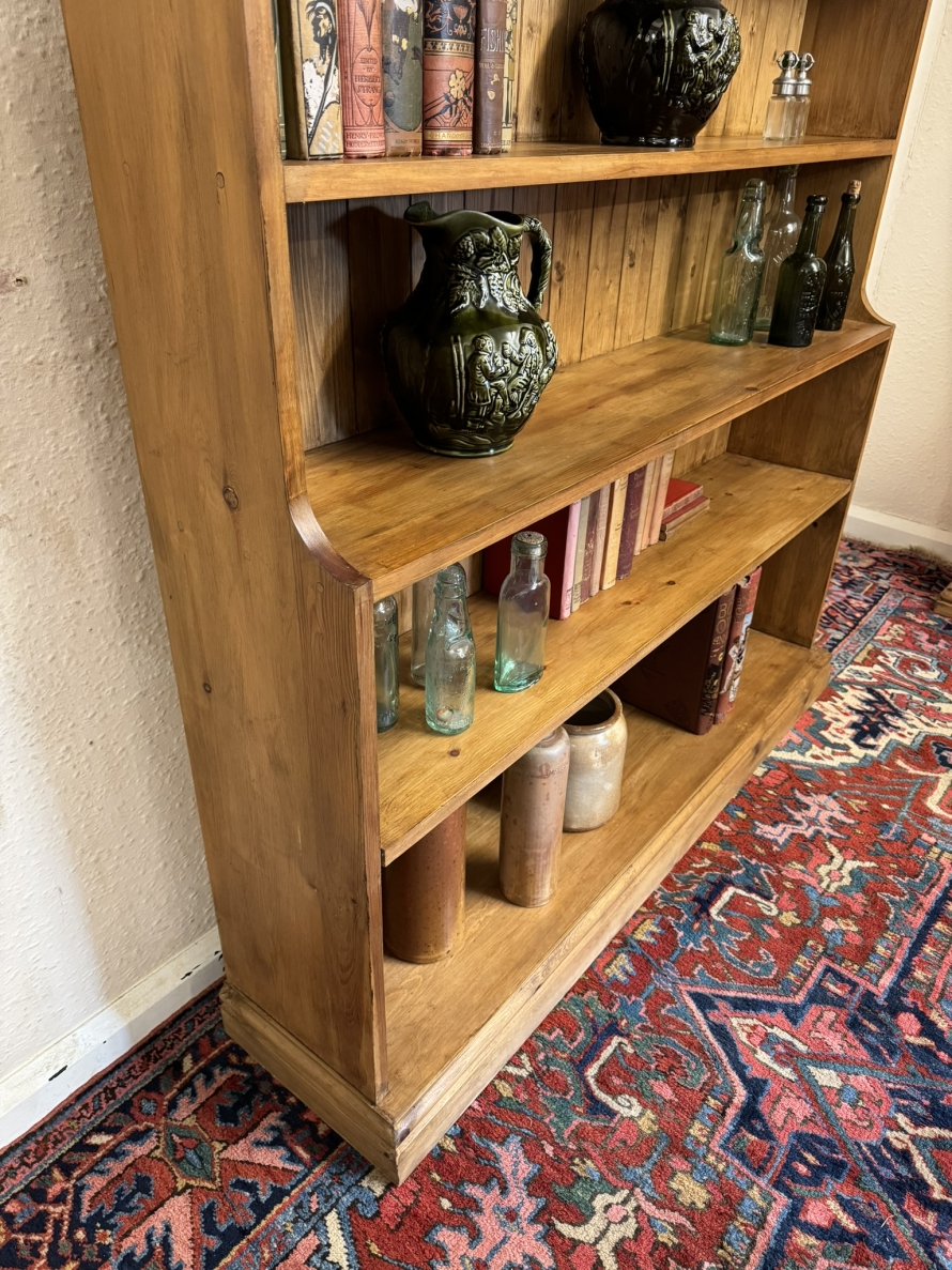 The oversailing top sits above five fixed shelves. Boarded back and sitting on a plinth base.