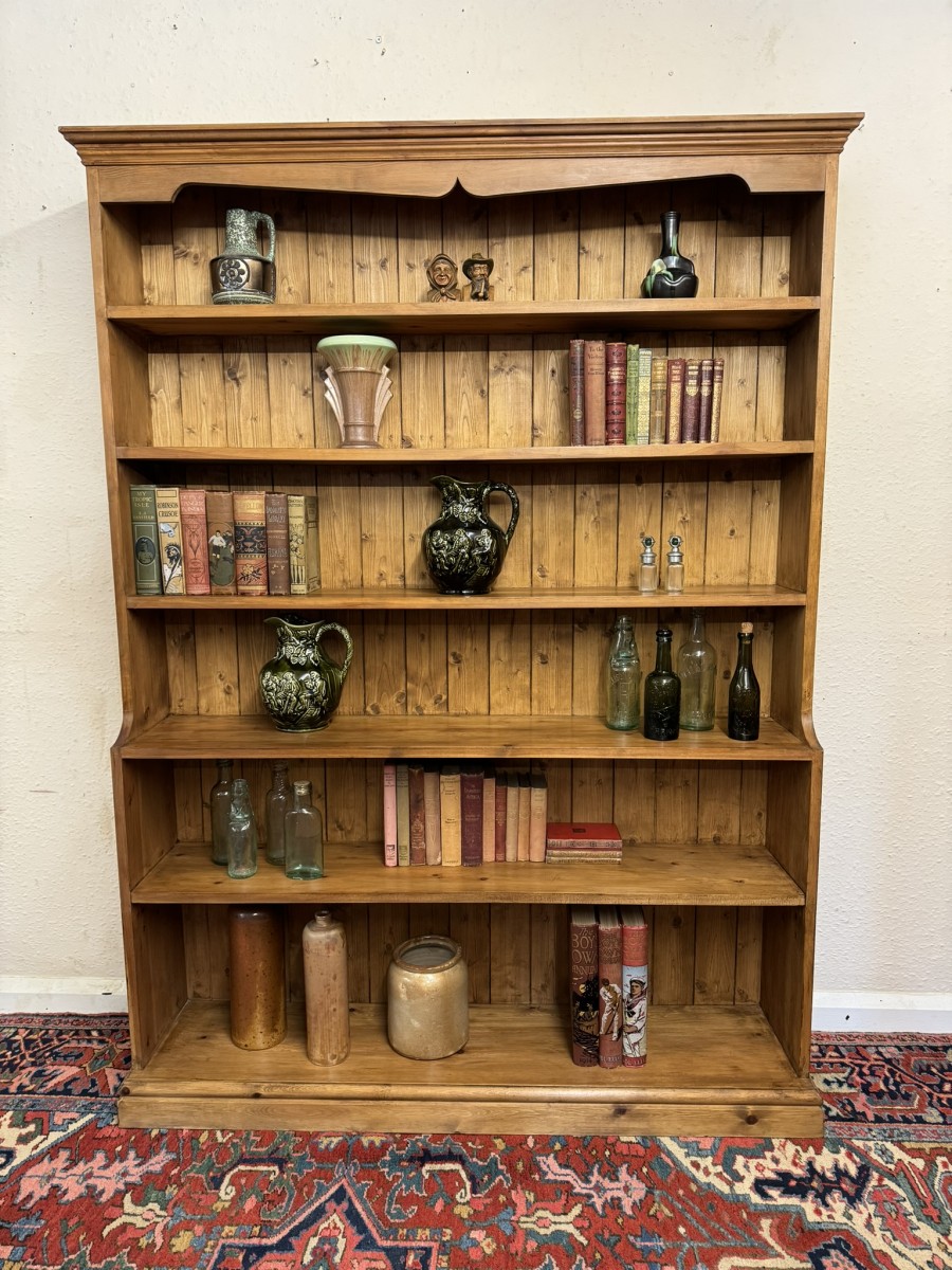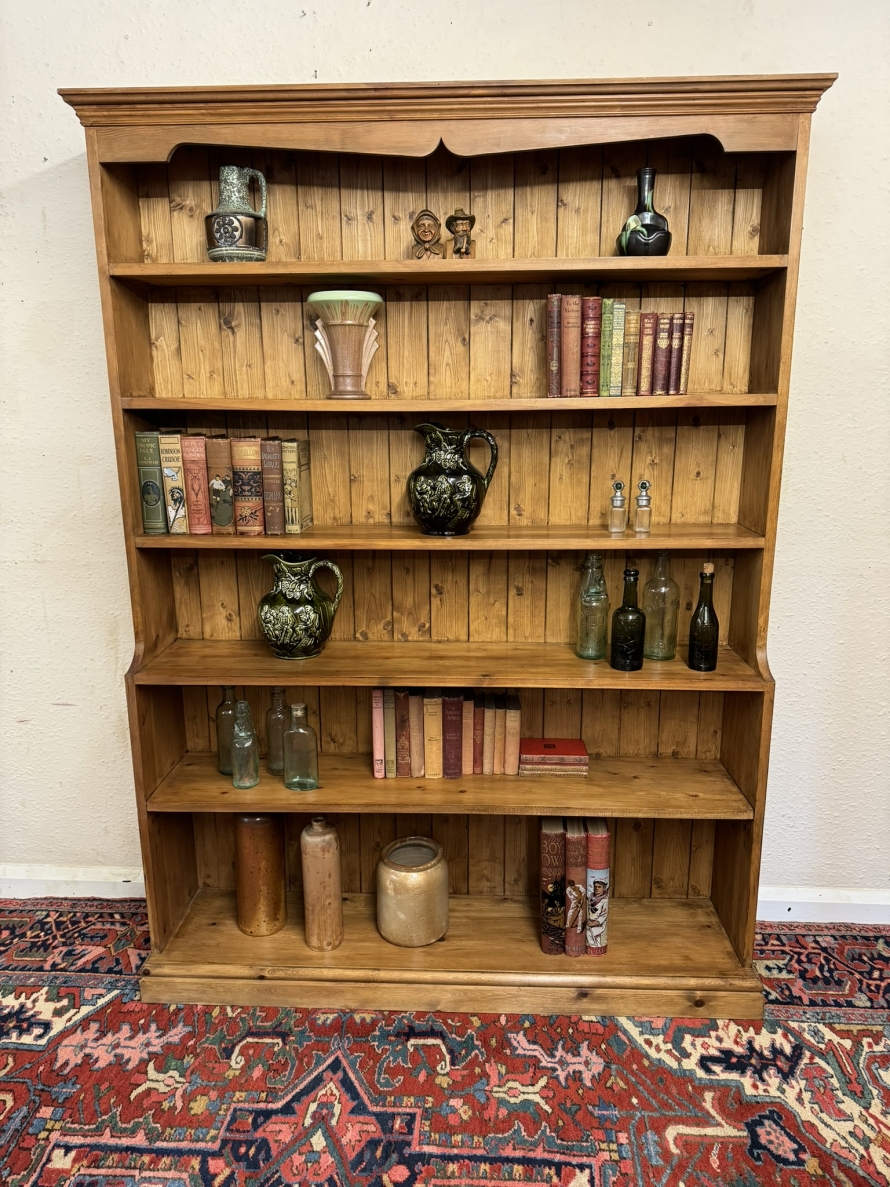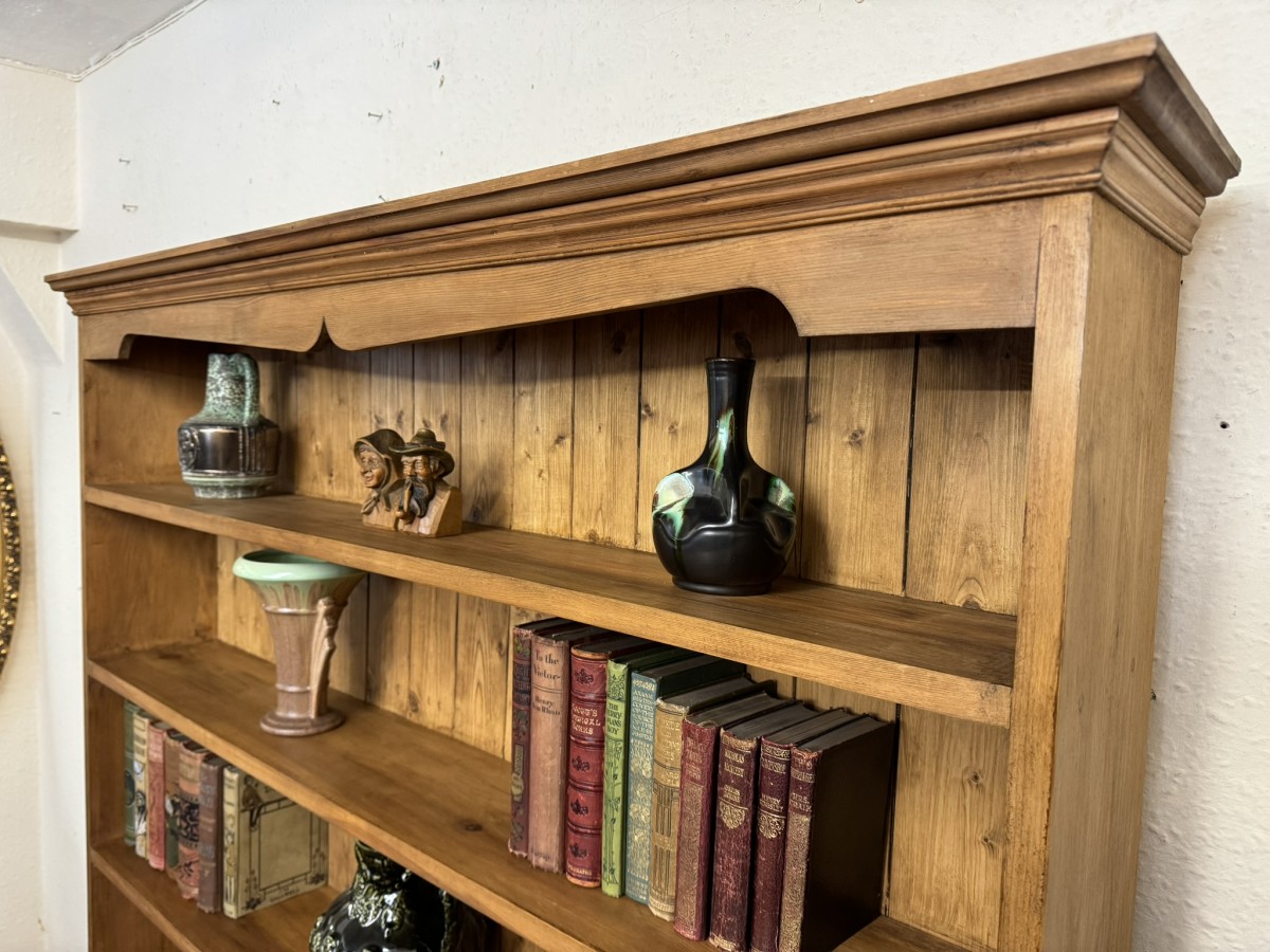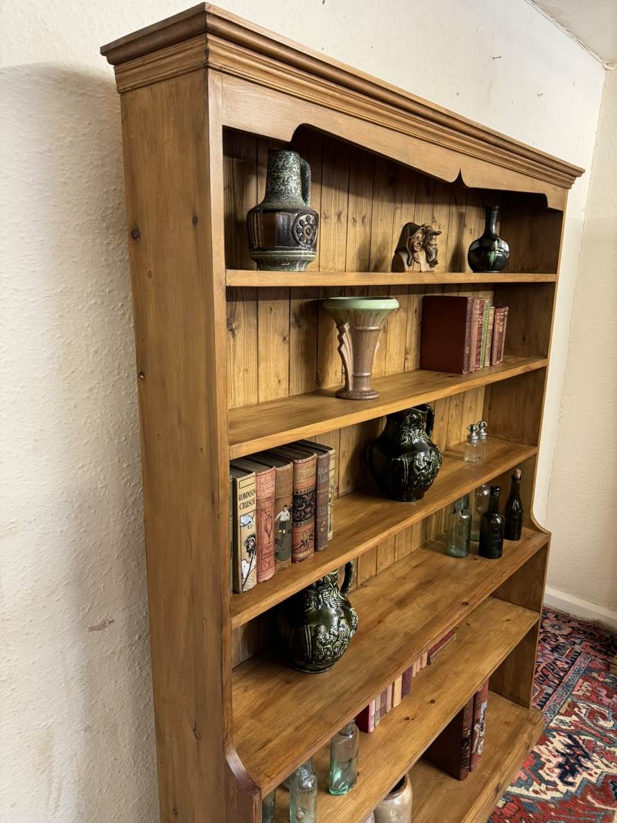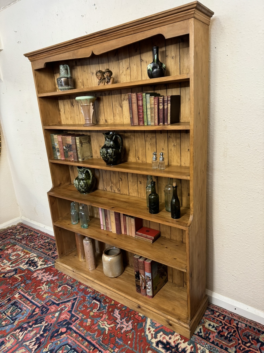 The oversailing top sits above five fixed shelves. Boarded back and sitting on a plinth base.