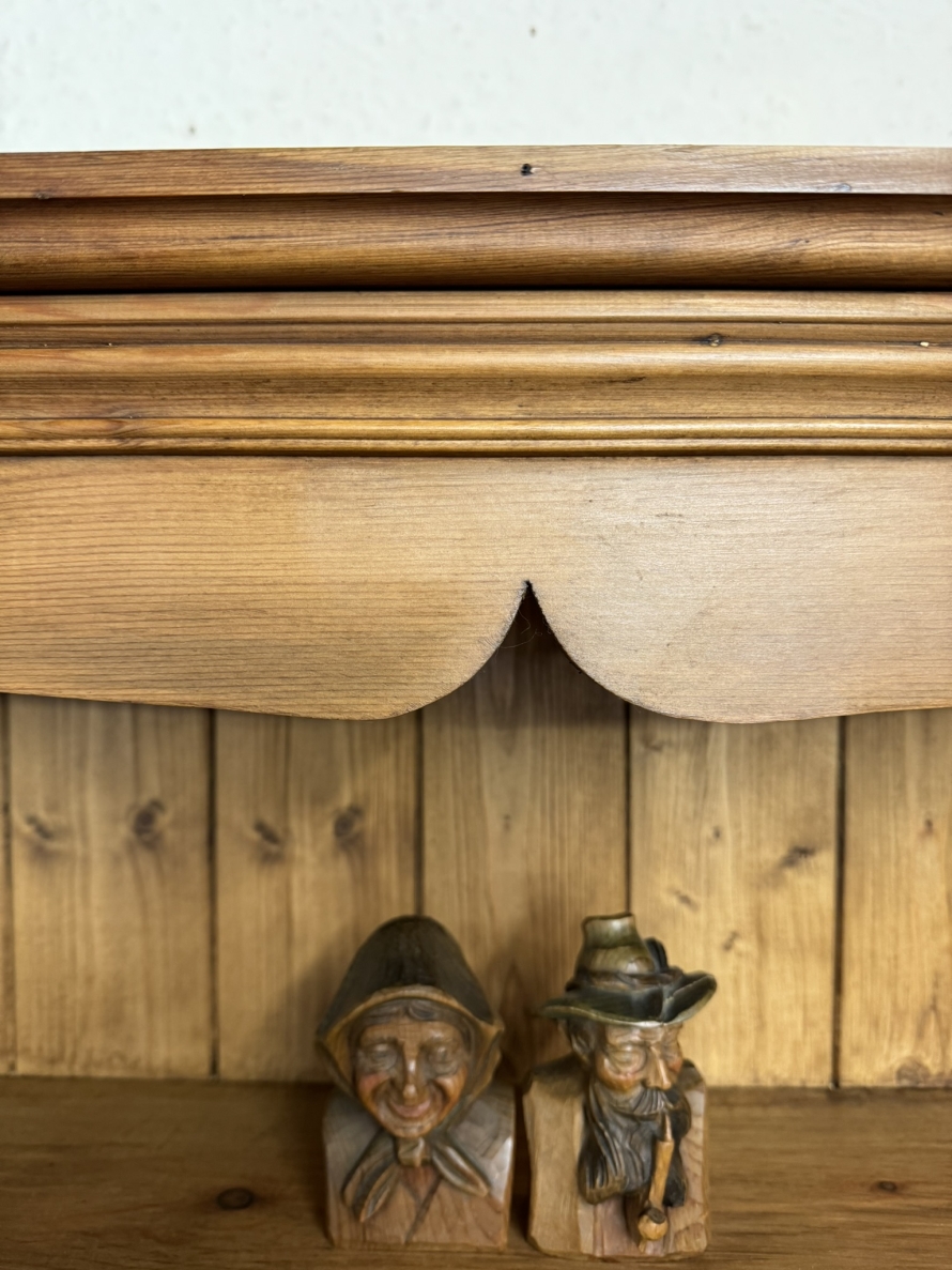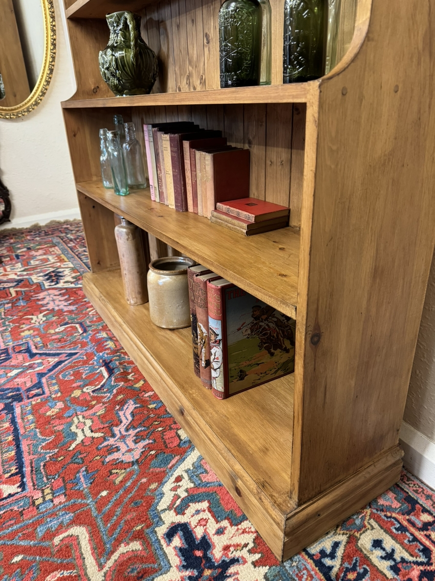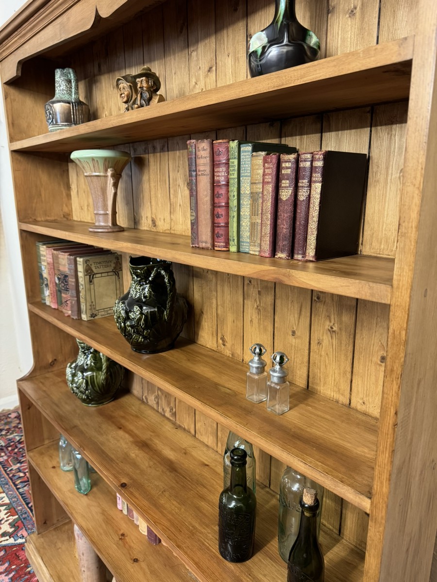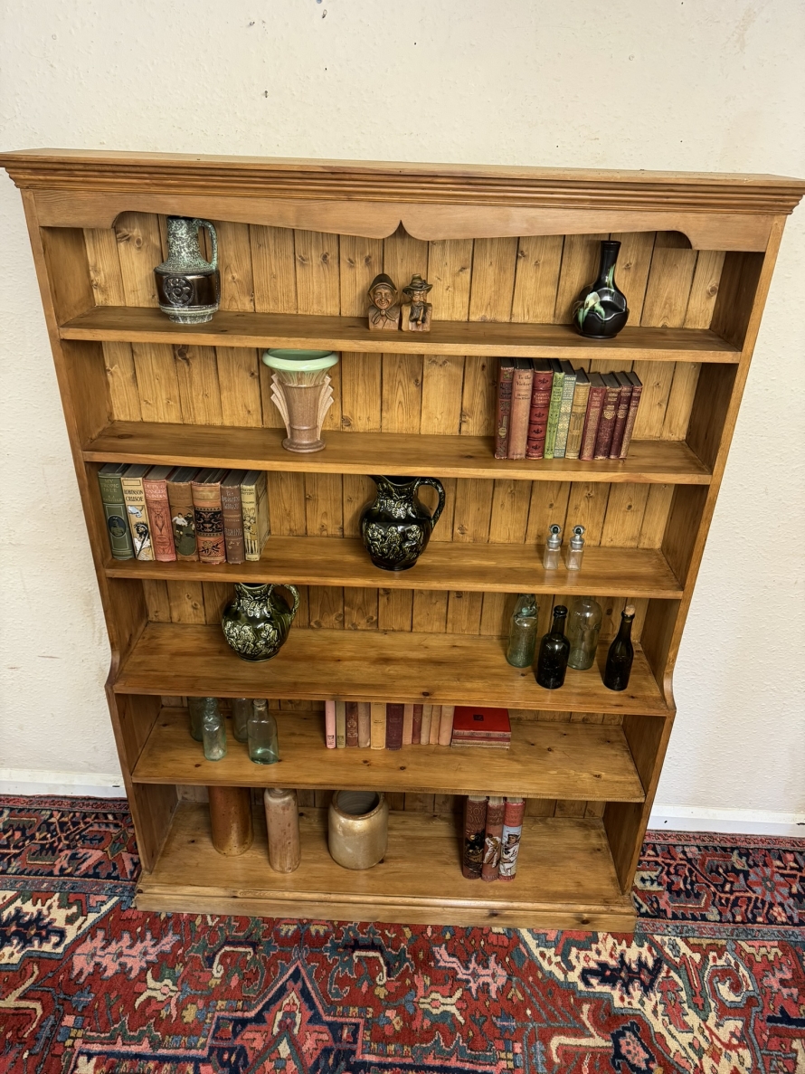 The oversailing top sits above five fixed shelves. Boarded back and sitting on a plinth base.