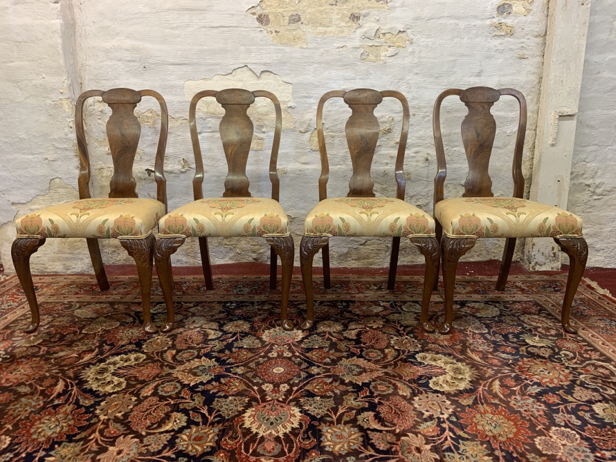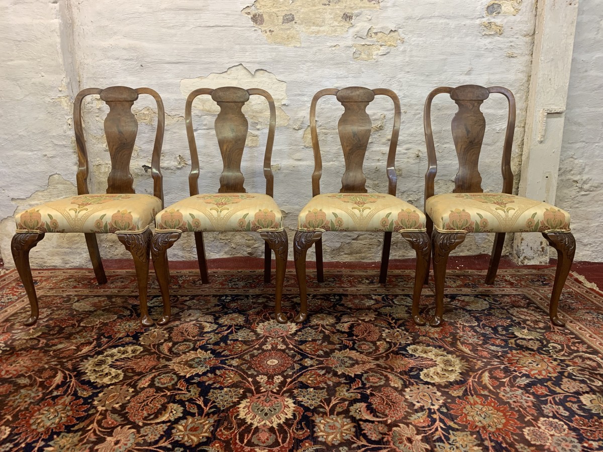 The set of chairs are made in striking walnut and are in excellent condition. Having a shaped back with central shaped back rest and standing on elegant carved cabriole shaped legs to the front. The chairs are upholstered in a fabulous organic William Morris fabric.
