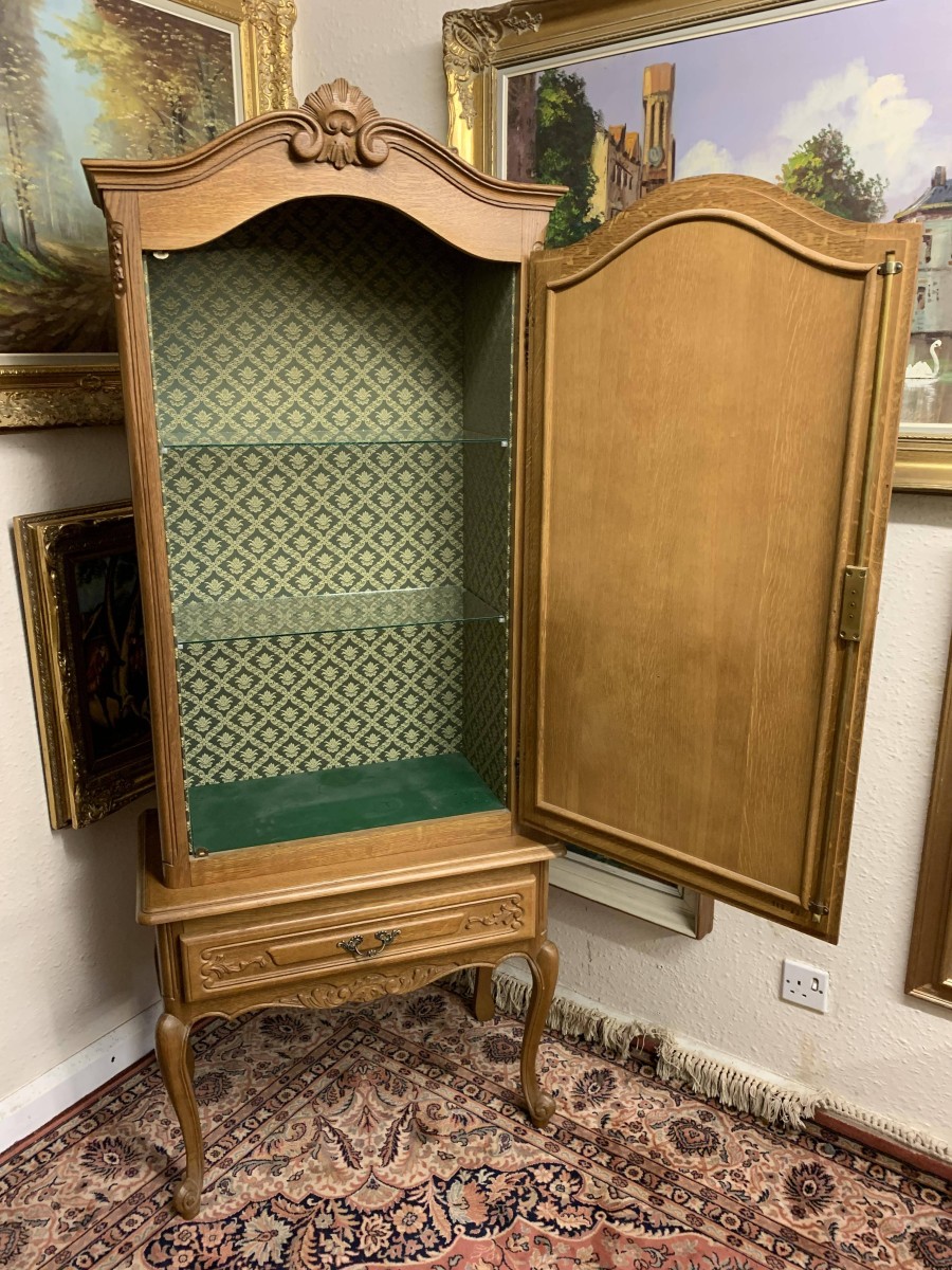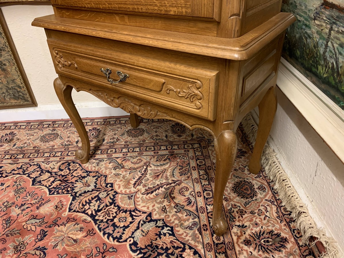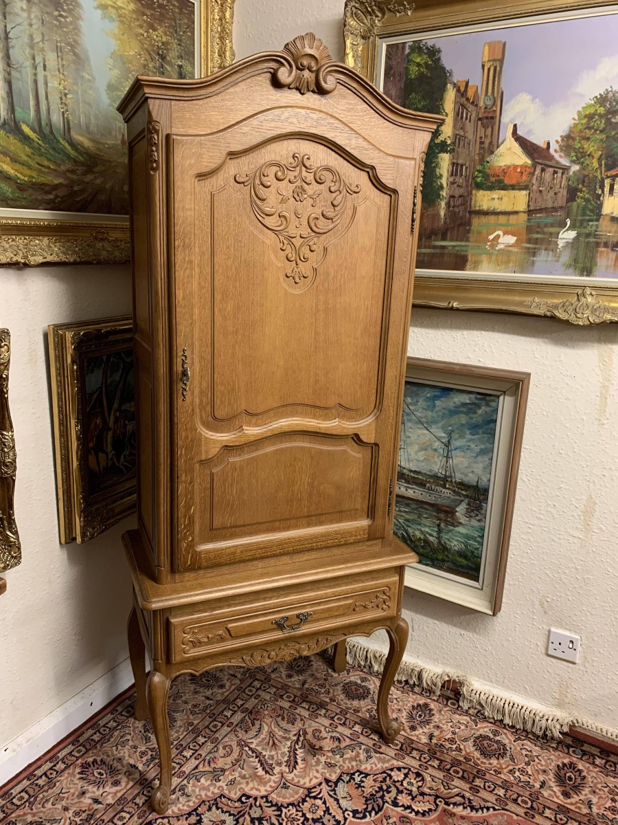 The shaped oversailing top rises to a decorative central carving. Below is a shaped carved recessed panelled lockable oak door, the door having brass hinges, ornate brass escutcheon and key. The door opens to reveal two glass removable shelves. Below is a carved recessed panelled drawer, the drawer having ornate brass handle. Recessed panelled sides, shaped skirt decorative central carving – this super cabinet stands on carved cabriole shaped legs to the front.