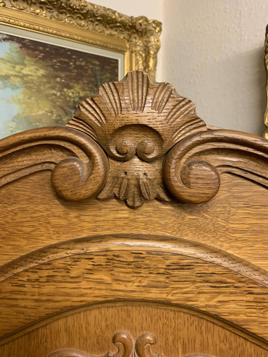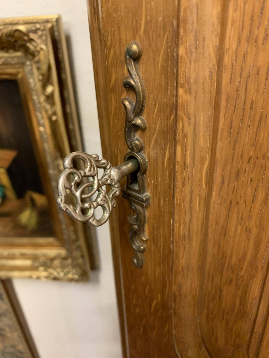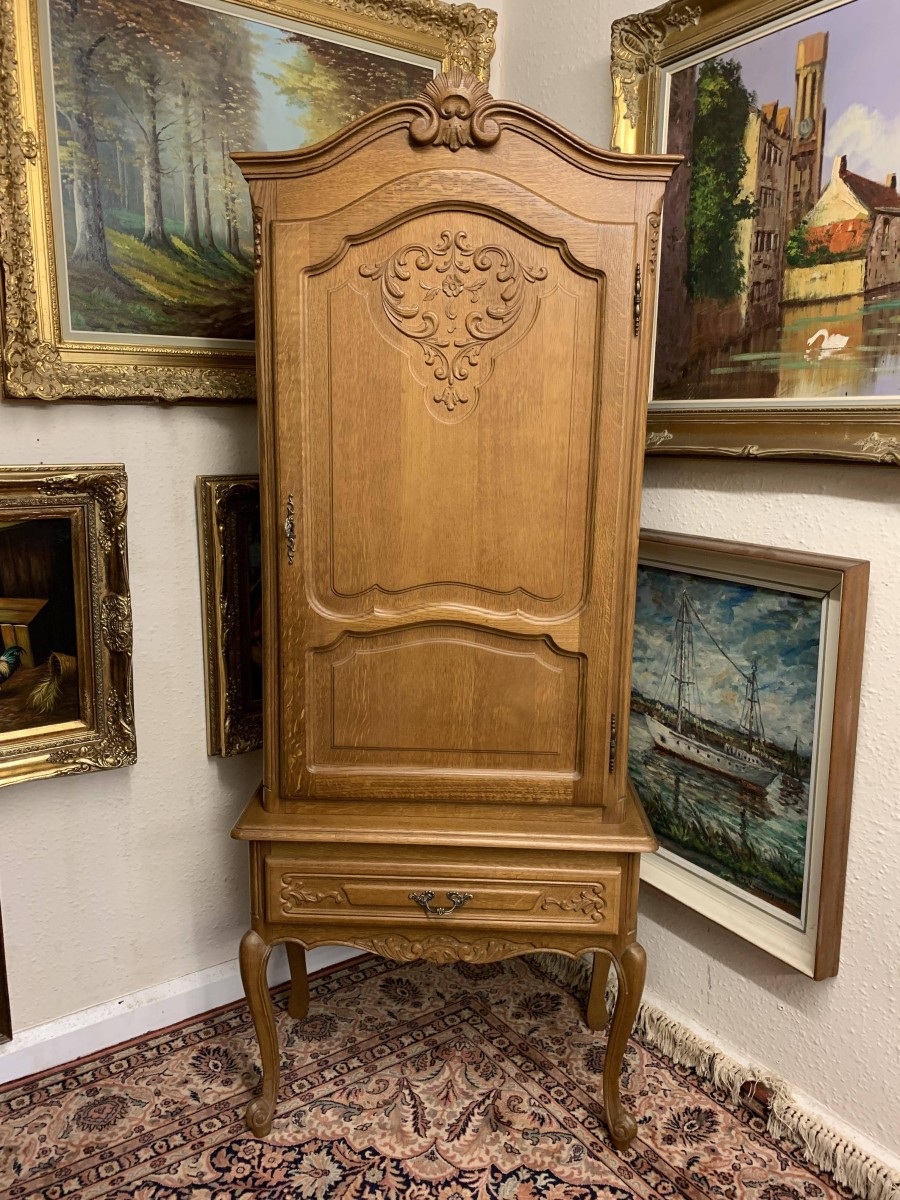 The shaped oversailing top rises to a decorative central carving. Below is a shaped carved recessed panelled lockable oak door, the door having brass hinges, ornate brass escutcheon and key. The door opens to reveal two glass removable shelves. Below is a carved recessed panelled drawer, the drawer having ornate brass handle. Recessed panelled sides, shaped skirt decorative central carving – this super cabinet stands on carved cabriole shaped legs to the front.