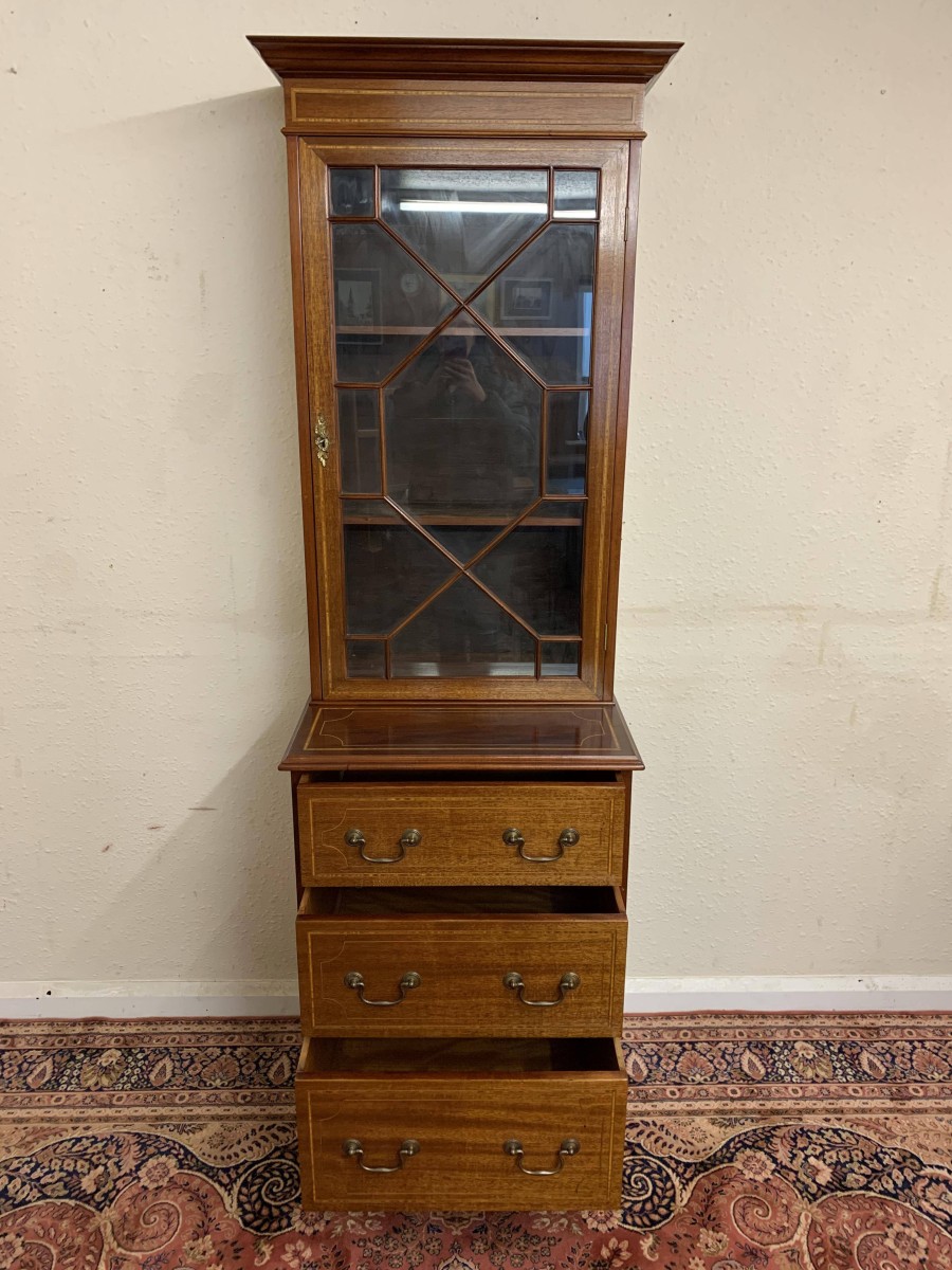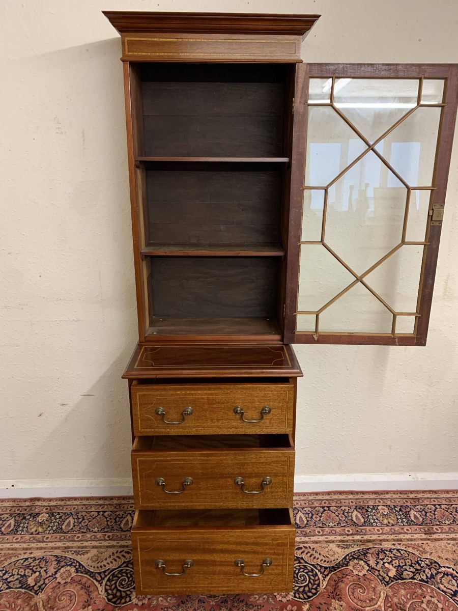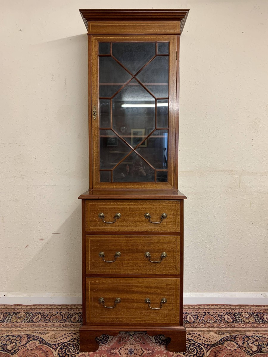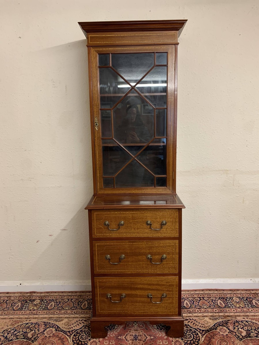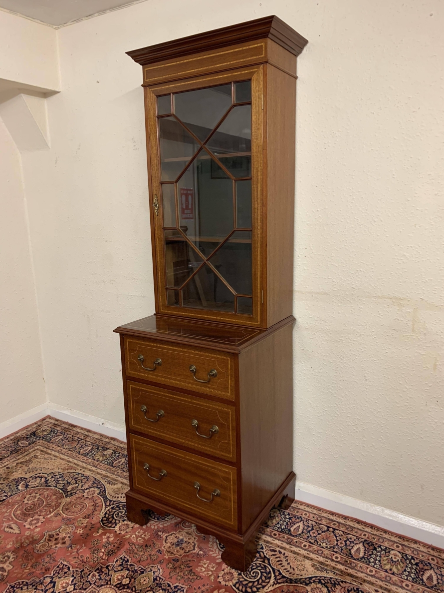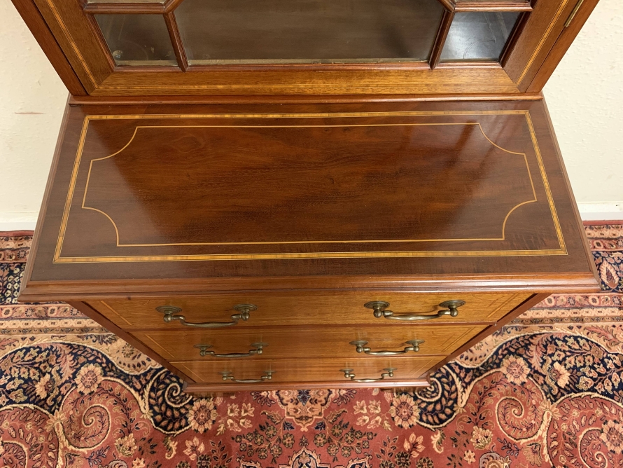 The oversailing top sits above a lockable glazed door, the door having wood barring, string inlay decoration, brass escutcheon and key. The door opens to reveal two fixed shelves. The base has a decorative inlaid top. Below are three inlaid graduated drawers, each drawer having a pair of brass handles. This quality item stands on four bracket feet.