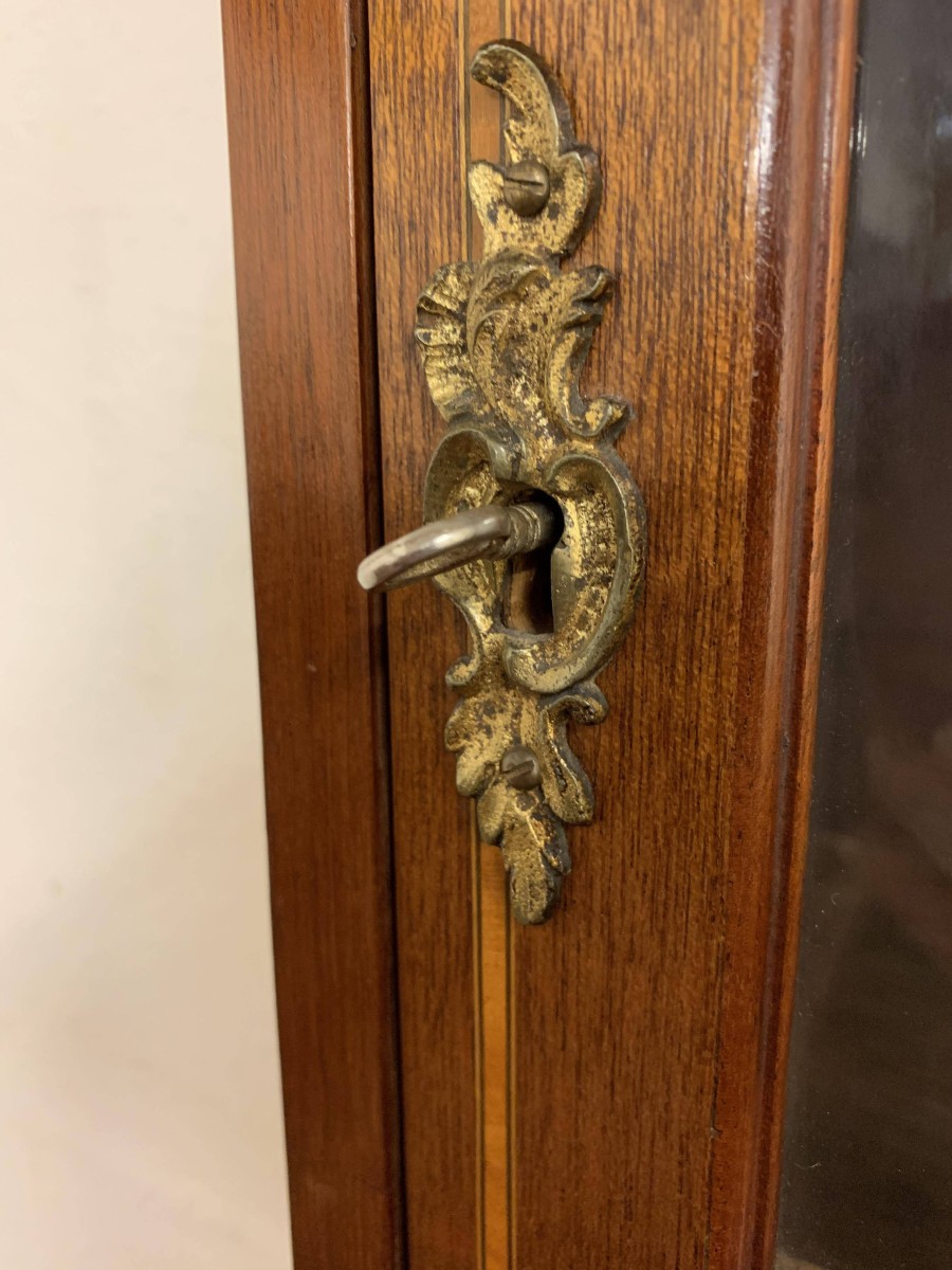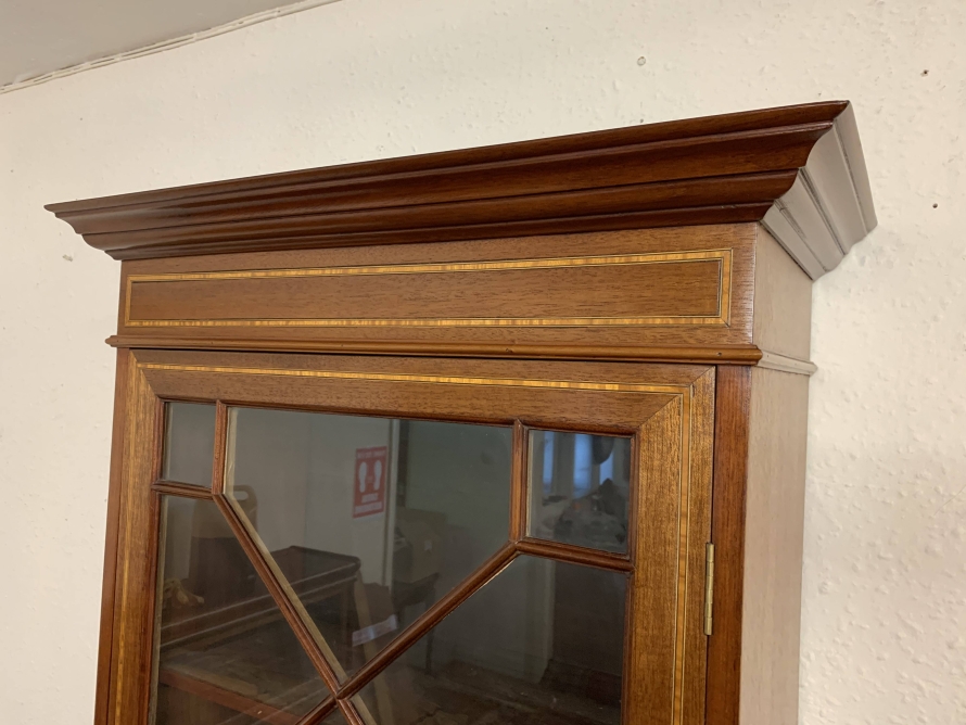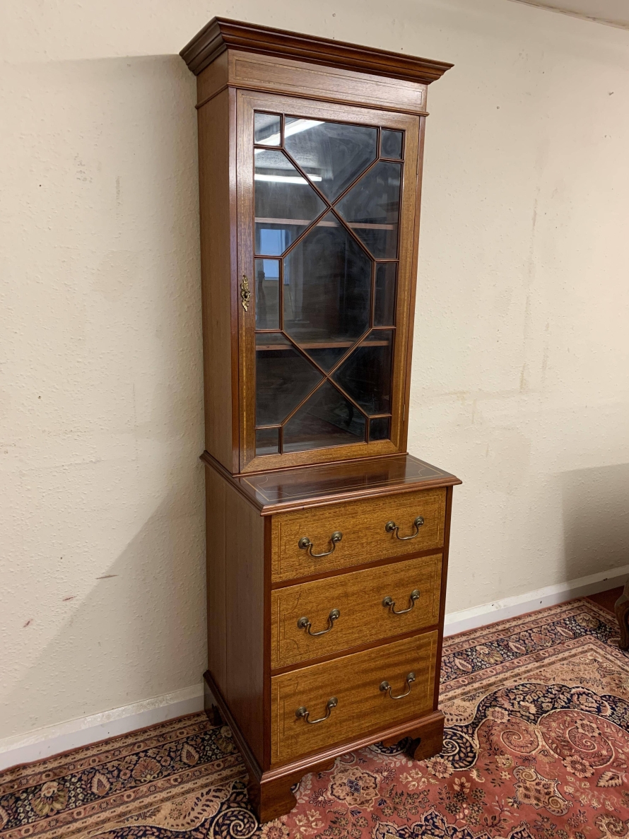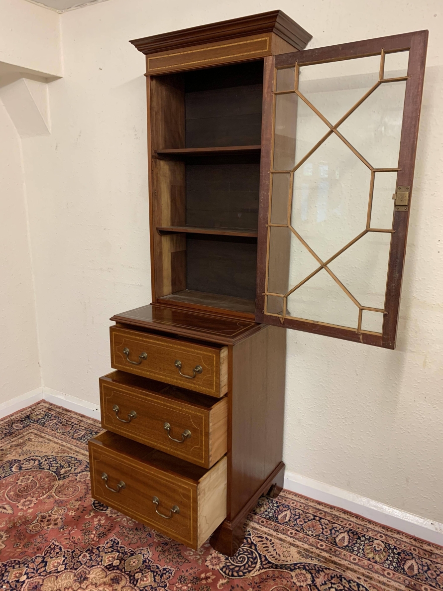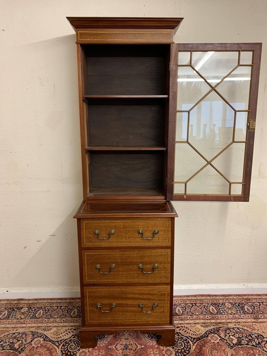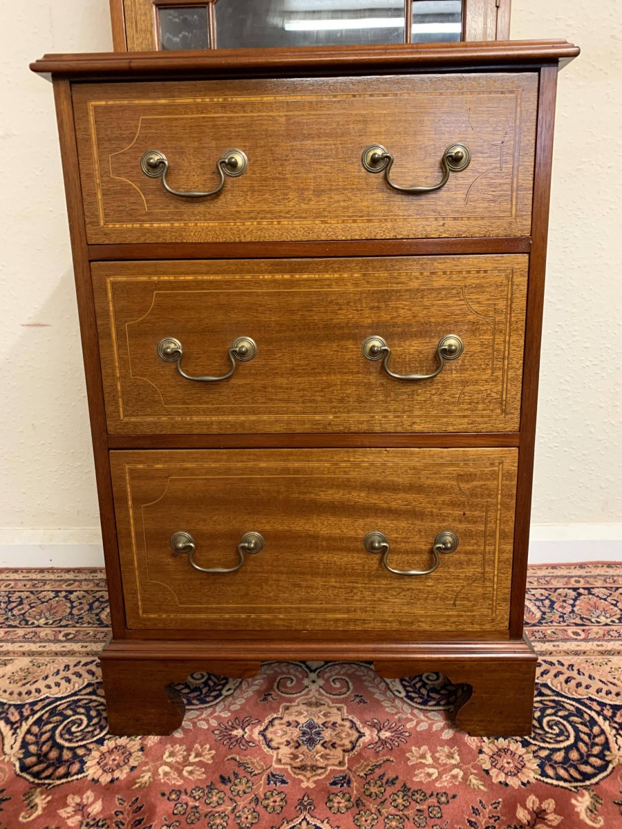 The oversailing top sits above a lockable glazed door, the door having wood barring, string inlay decoration, brass escutcheon and key. The door opens to reveal two fixed shelves. The base has a decorative inlaid top. Below are three inlaid graduated drawers, each drawer having a pair of brass handles. This quality item stands on four bracket feet.