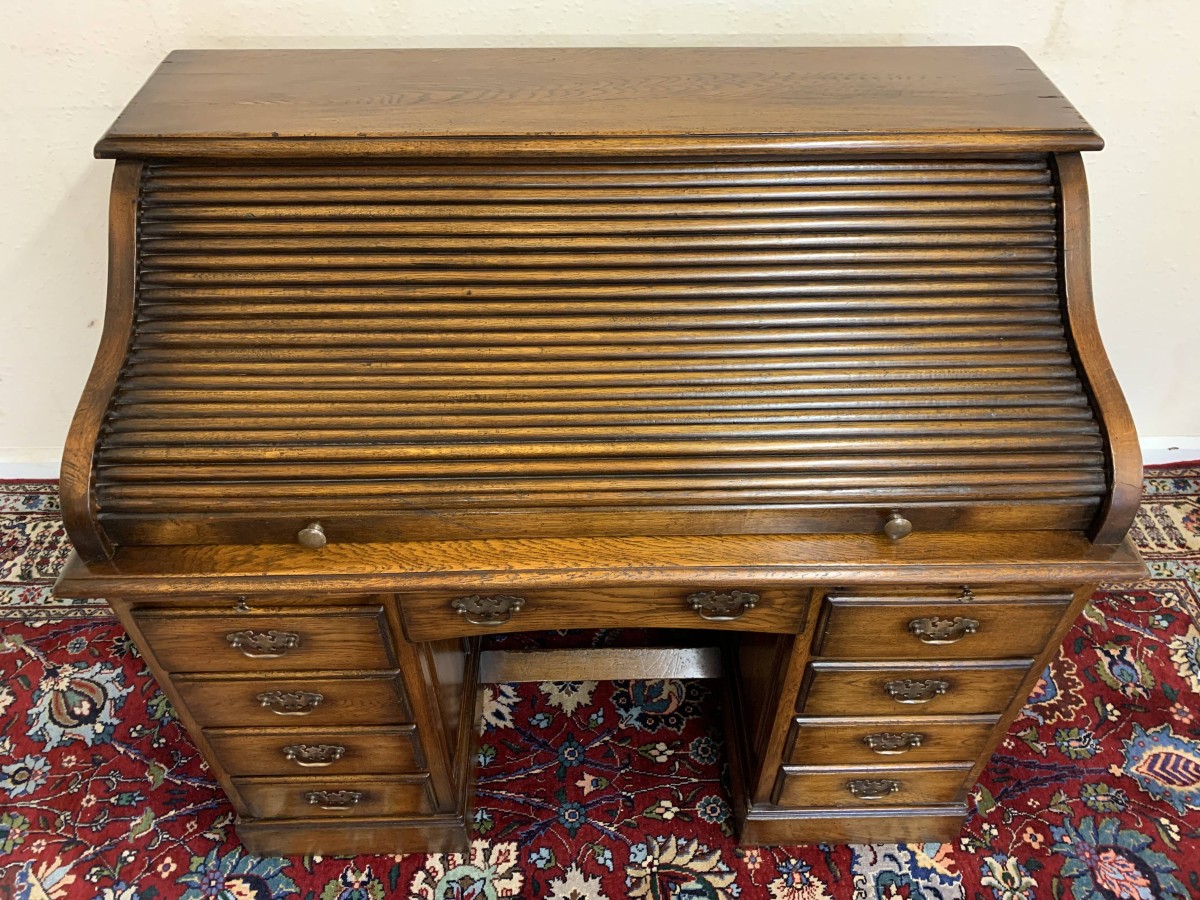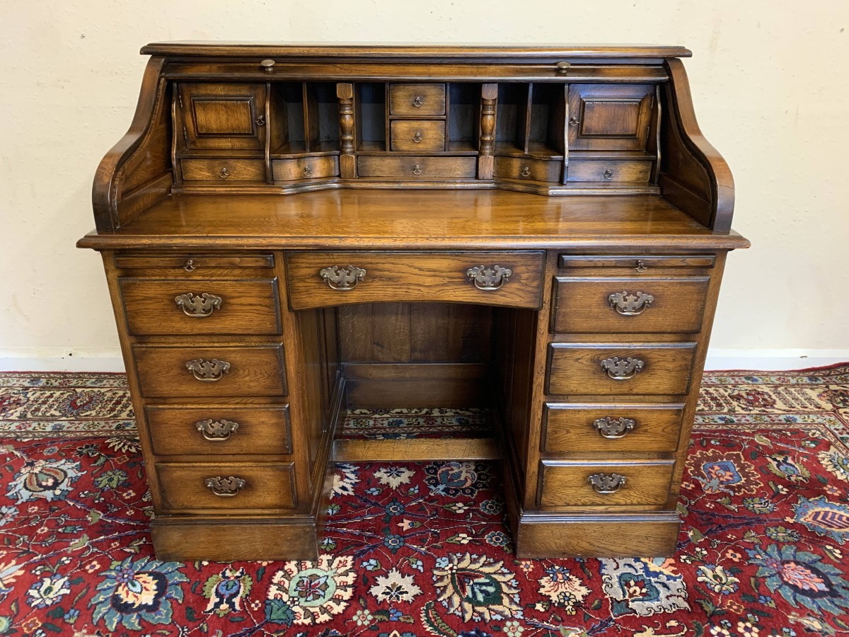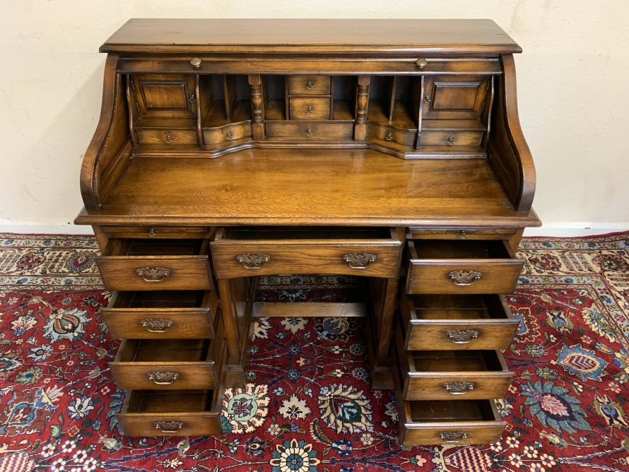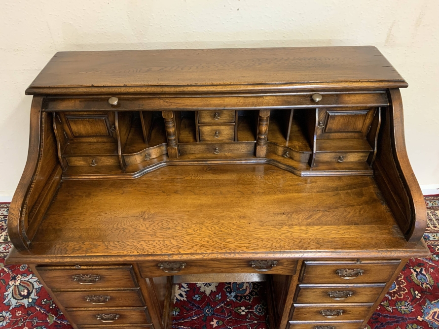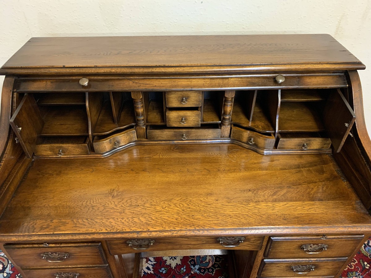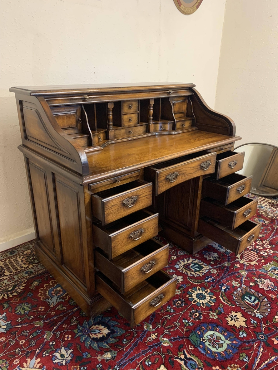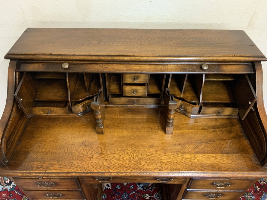 The rolltop tambour front opens to reveal an array of drawers, pigeonholes and two secret compartments. Below is a central knee hole drawer, the drawer having a pair of brass handles. The central drawer is flanked by a pair of retractable rests above a bank of four drawers, each drawer having a brass handle. There is a foot rest below the central drawer. Fielded panelled sides this super desk sits on a platform base.