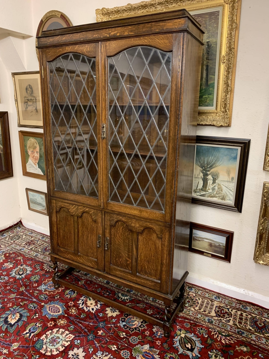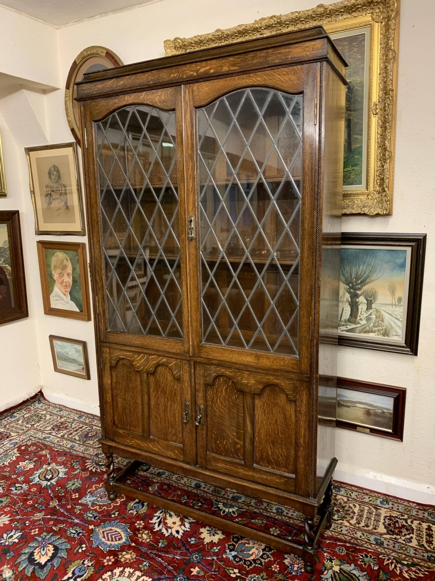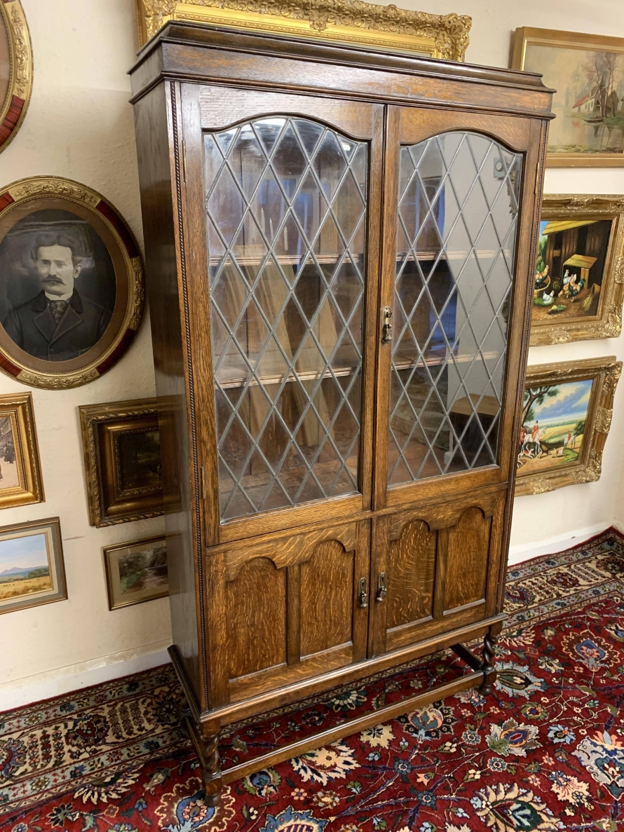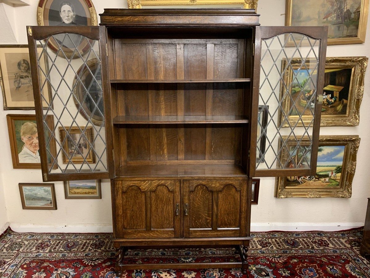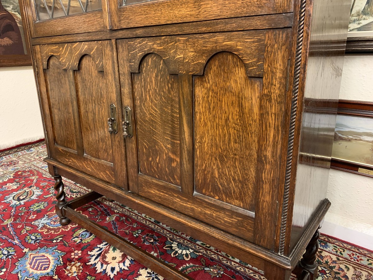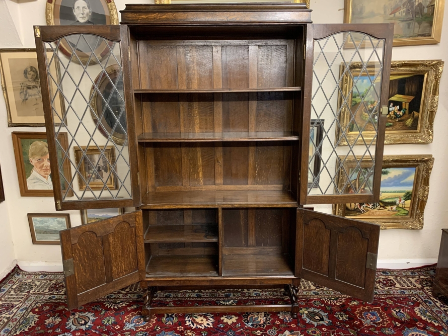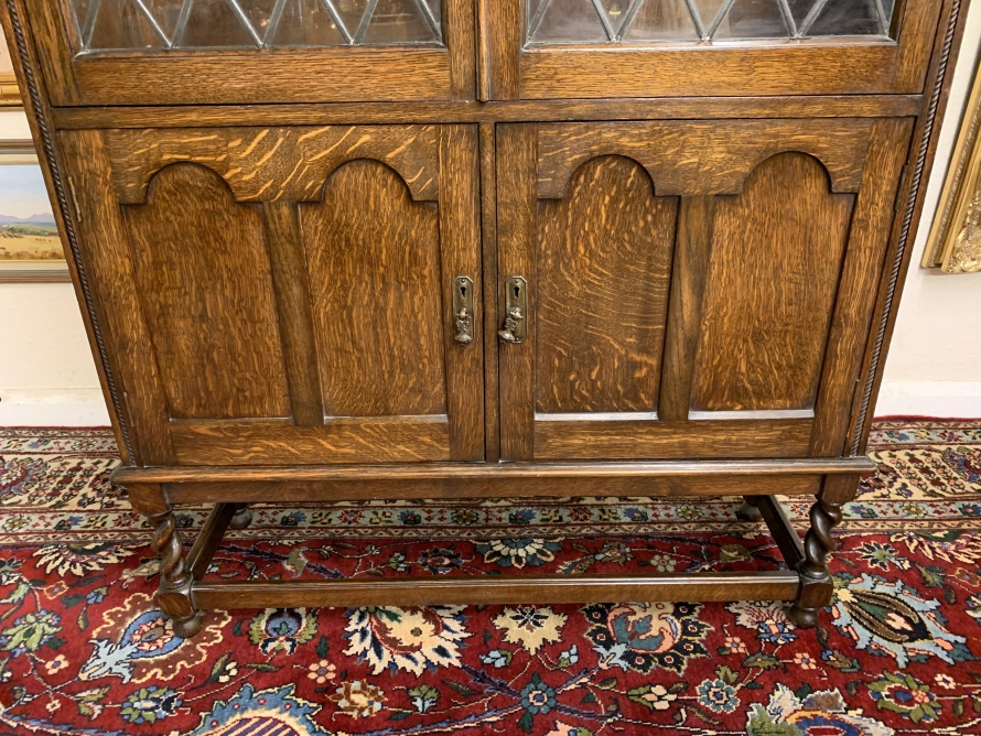 The bookcase dates circa 1925. The bookcase has two lockable leaded glazed doors. The doors open to reveal two adjustable and removable shelves. Below are a pair of recessed panelled cupboard doors, the doors open to reveal good storage with shelf. There is carved decoration to the sides of the doors. This super bookcase stands on four barley twist legs which have stretcher supports.