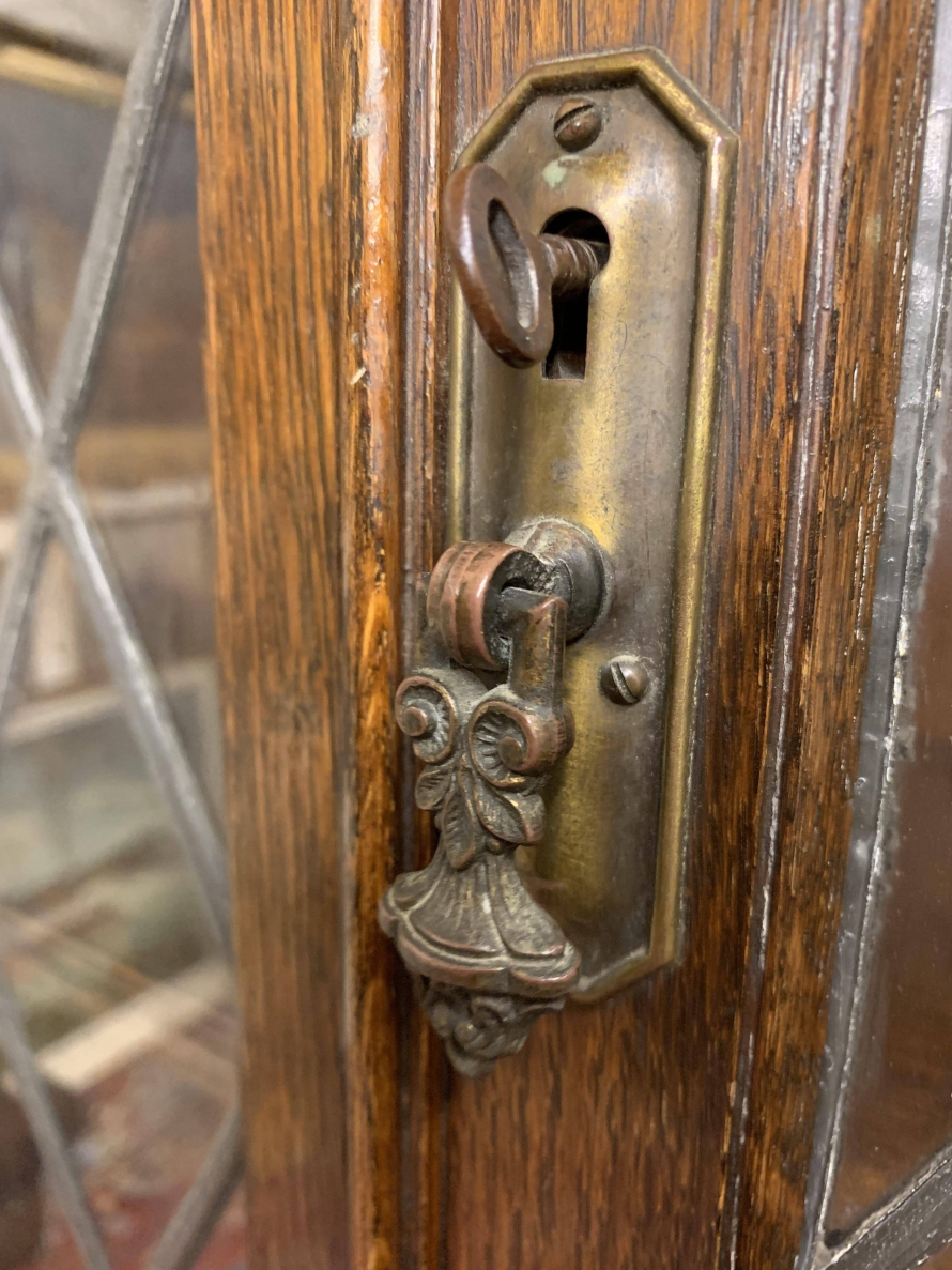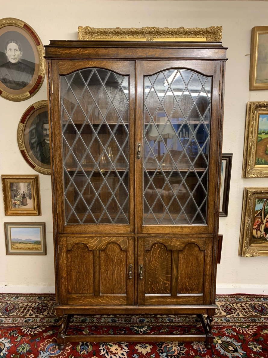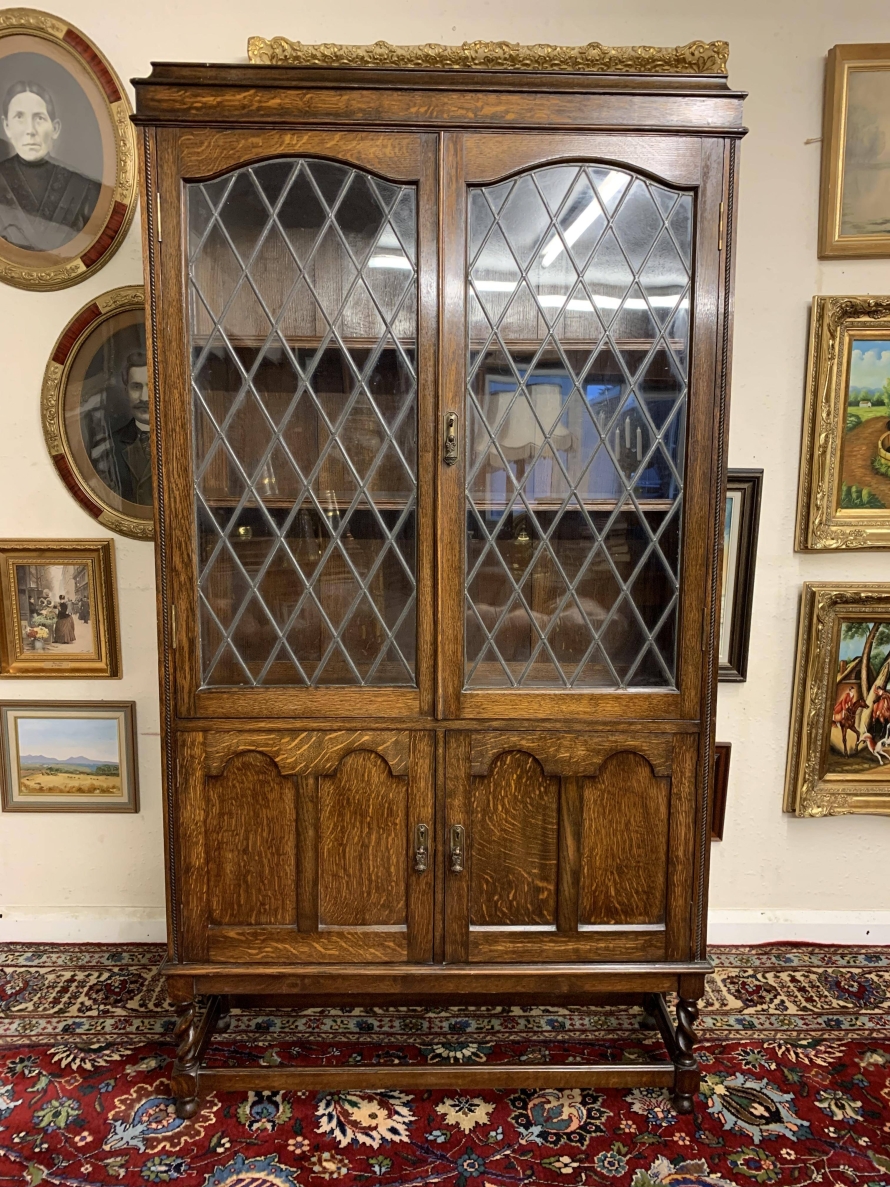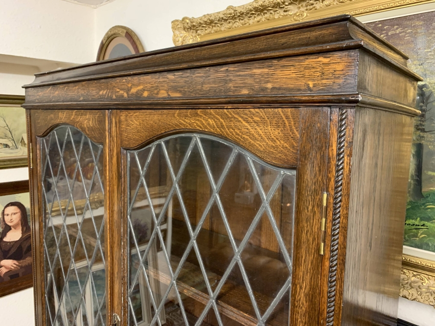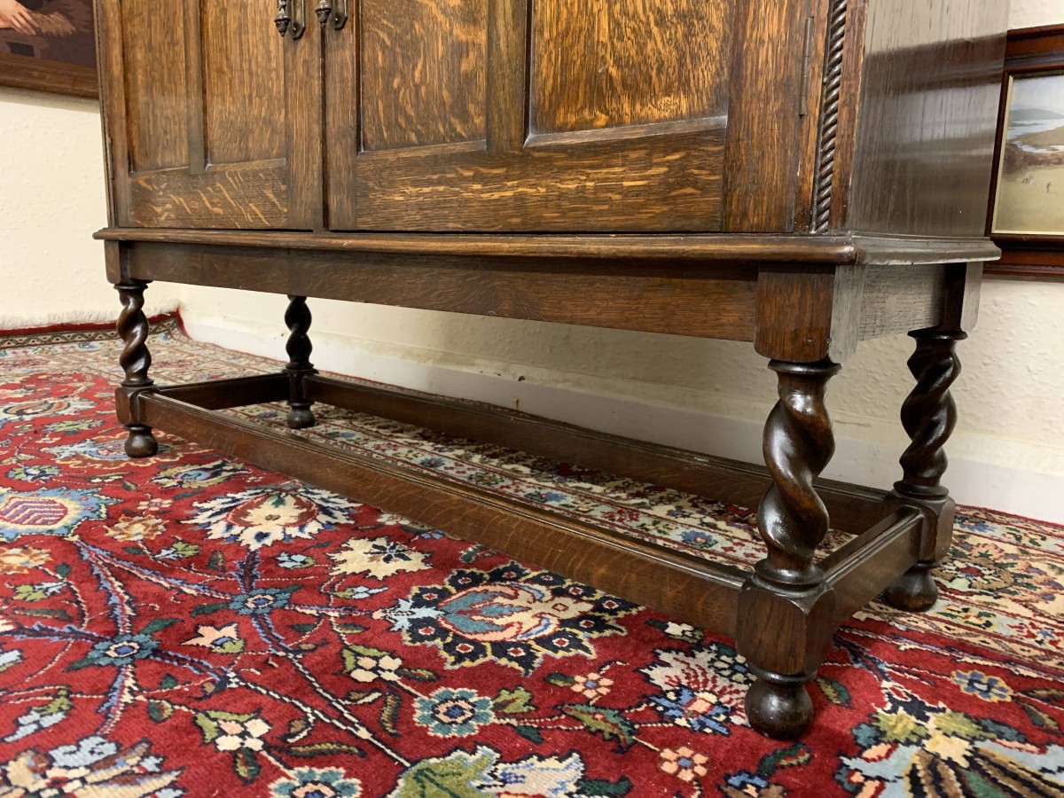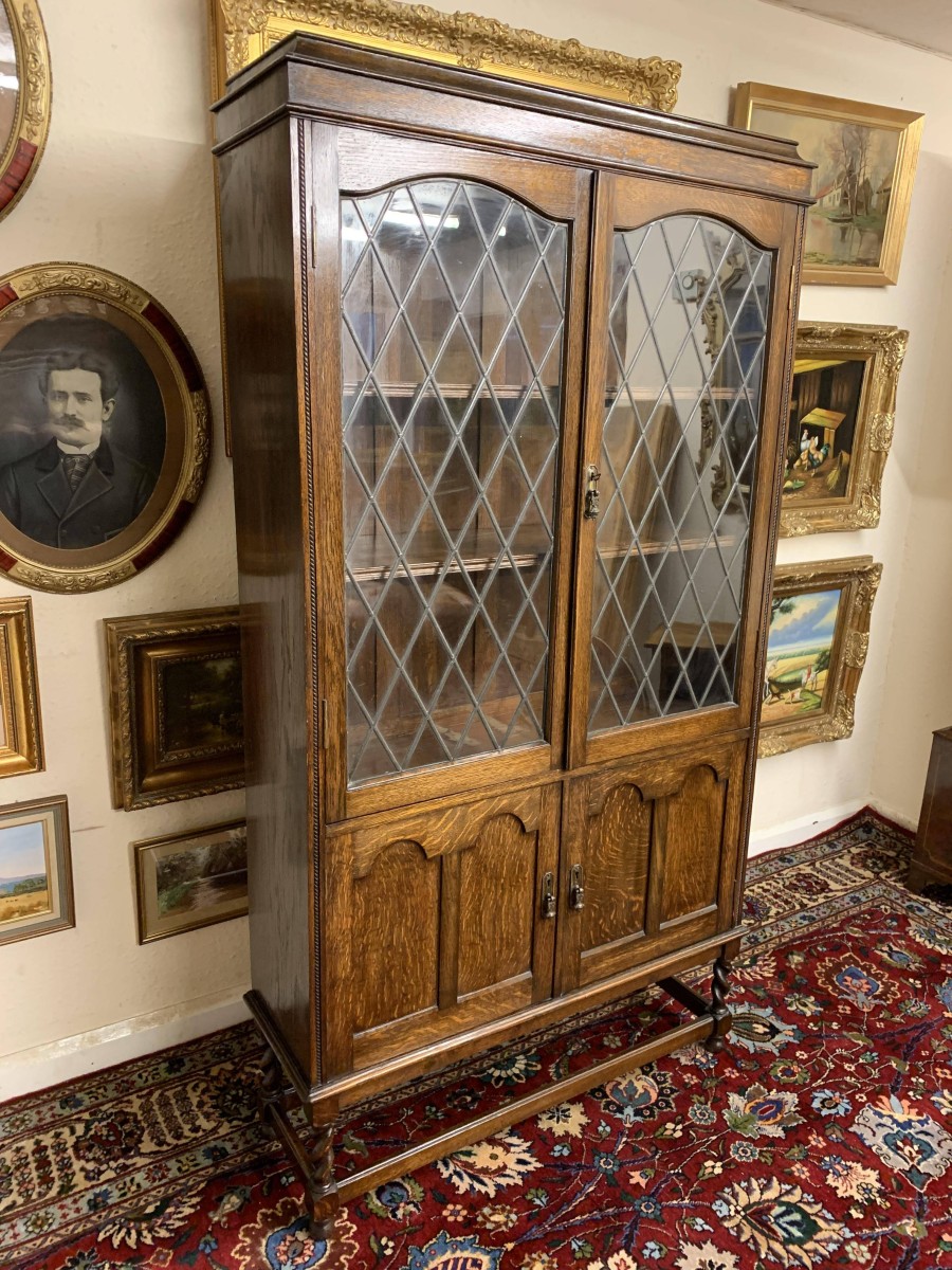 The bookcase dates circa 1925. The bookcase has two lockable leaded glazed doors. The doors open to reveal two adjustable and removable shelves. Below are a pair of recessed panelled cupboard doors, the doors open to reveal good storage with shelf. There is carved decoration to the sides of the doors. This super bookcase stands on four barley twist legs which have stretcher supports.