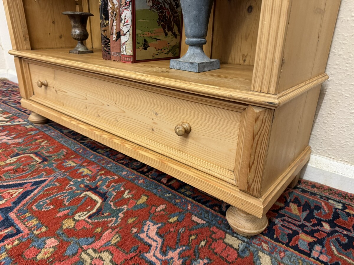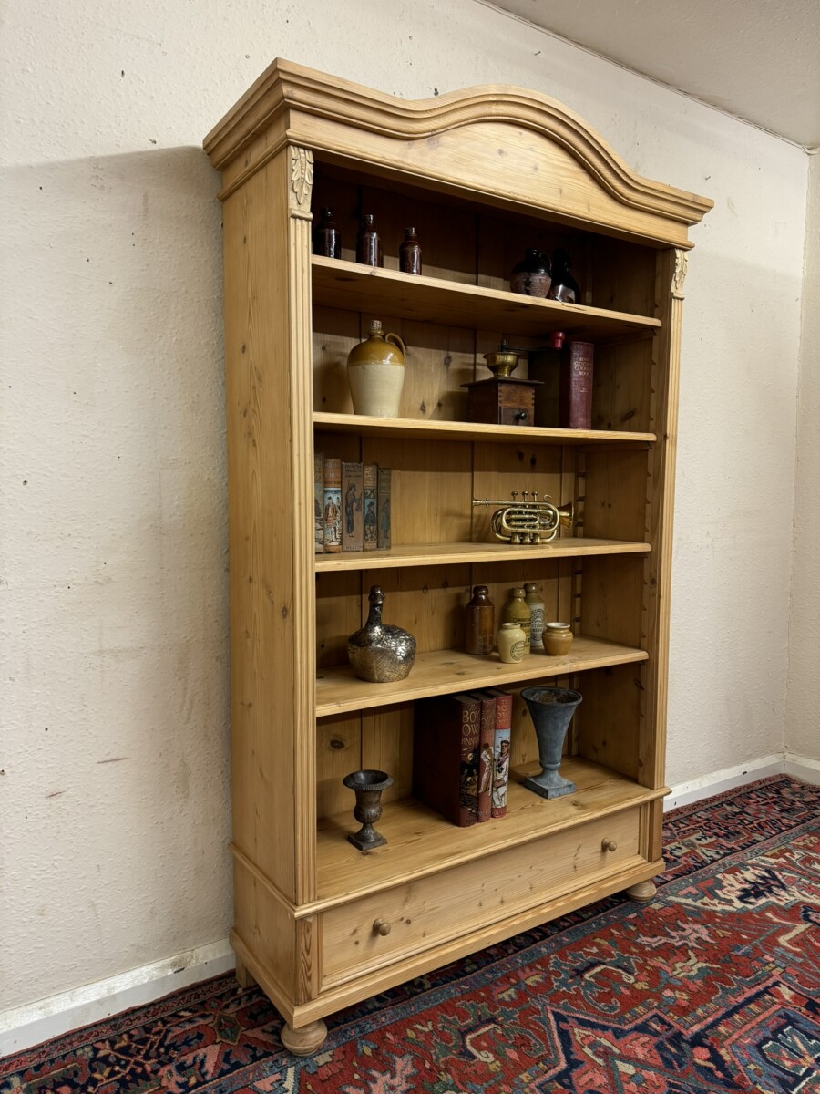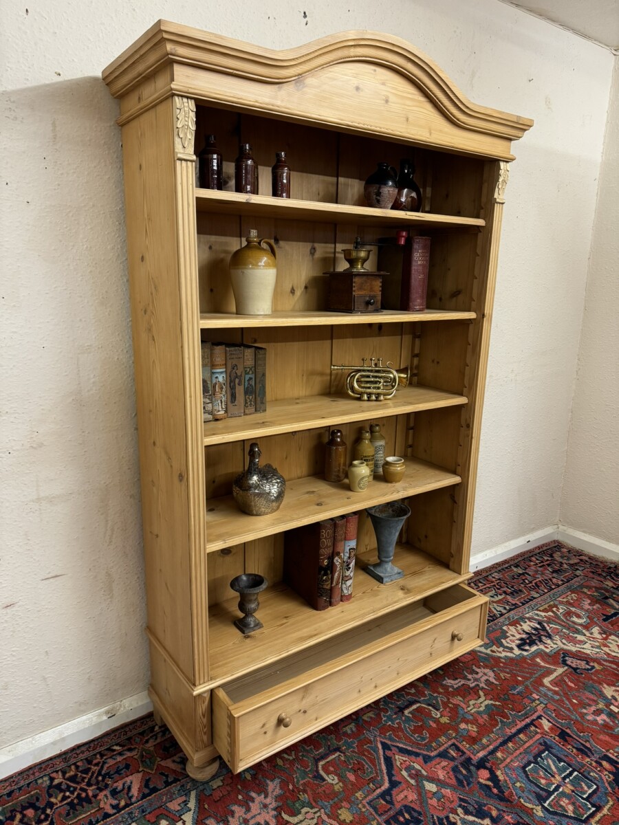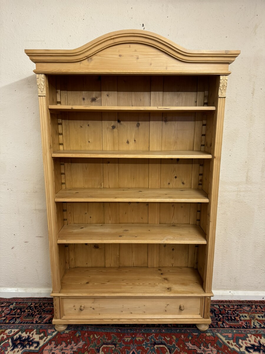 The arched top sits above an open bookcase of four adjustable and removable shelves. There is carved decoration to the sides. Usefull storage drawer below this fabulous bookcase stands on two turned feet to the front.