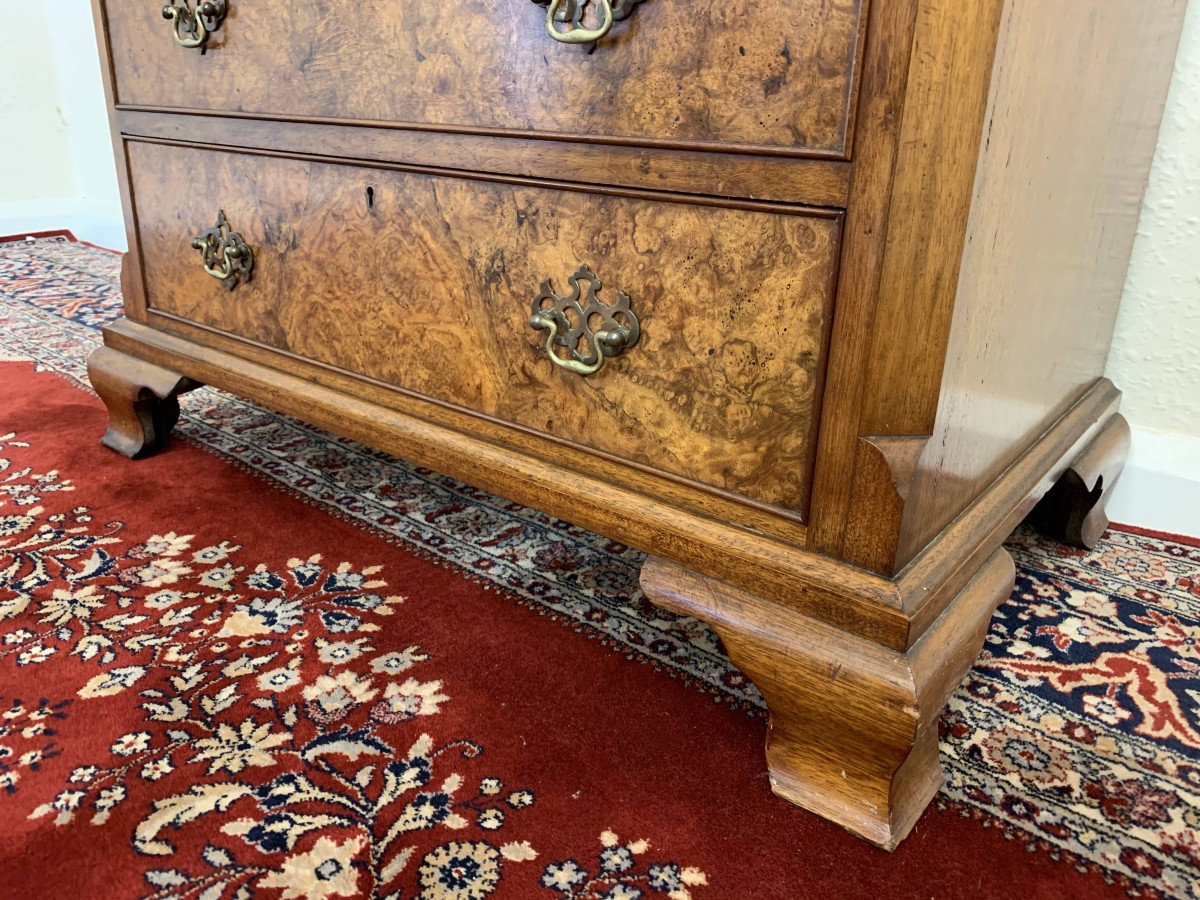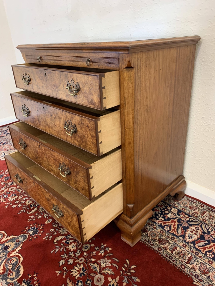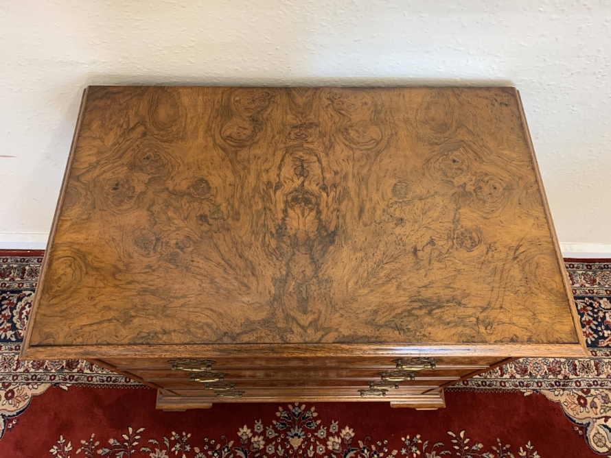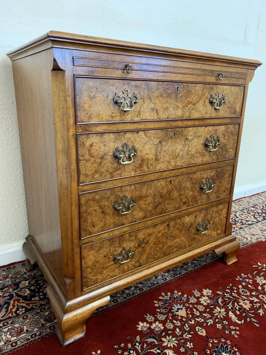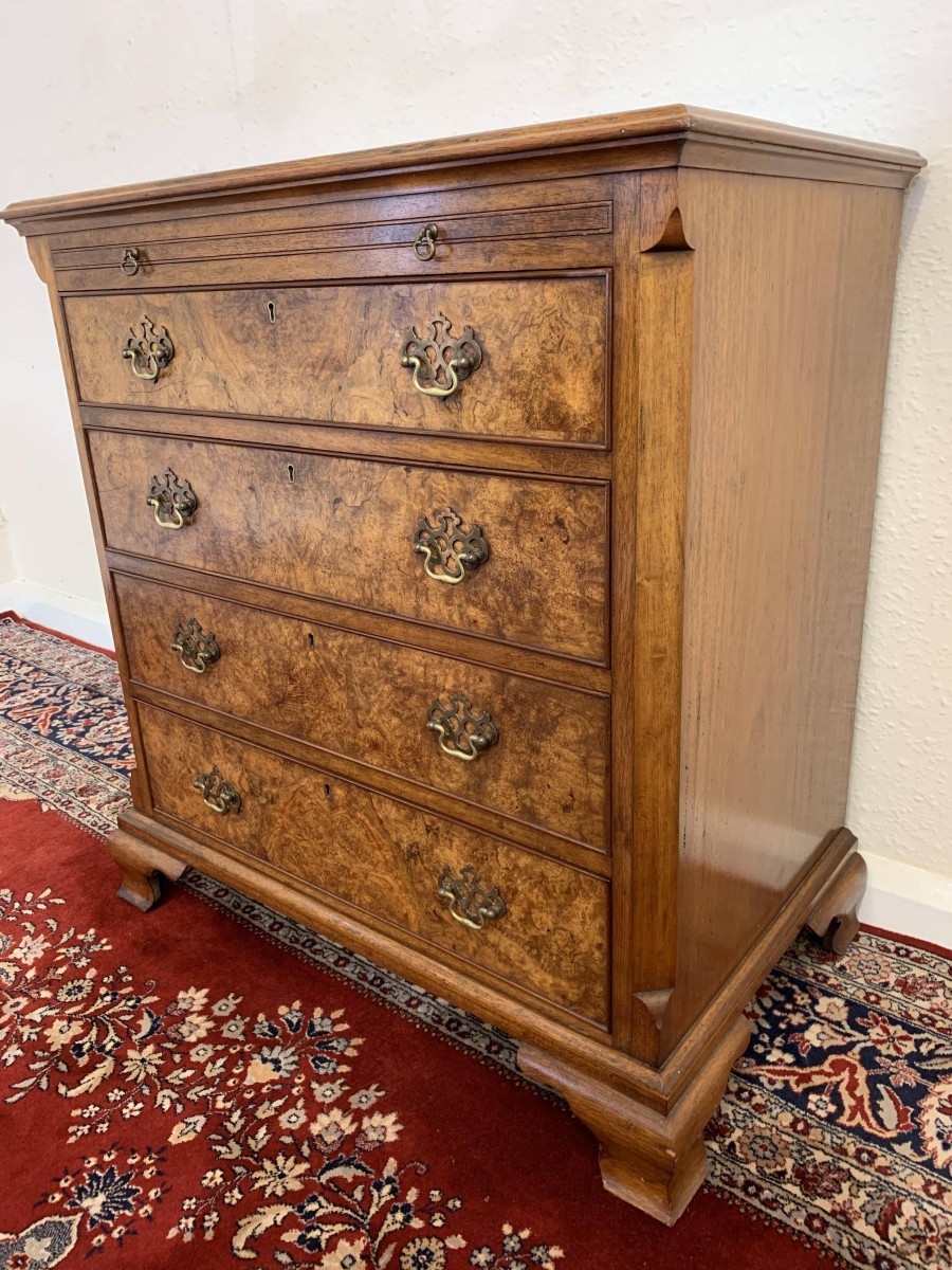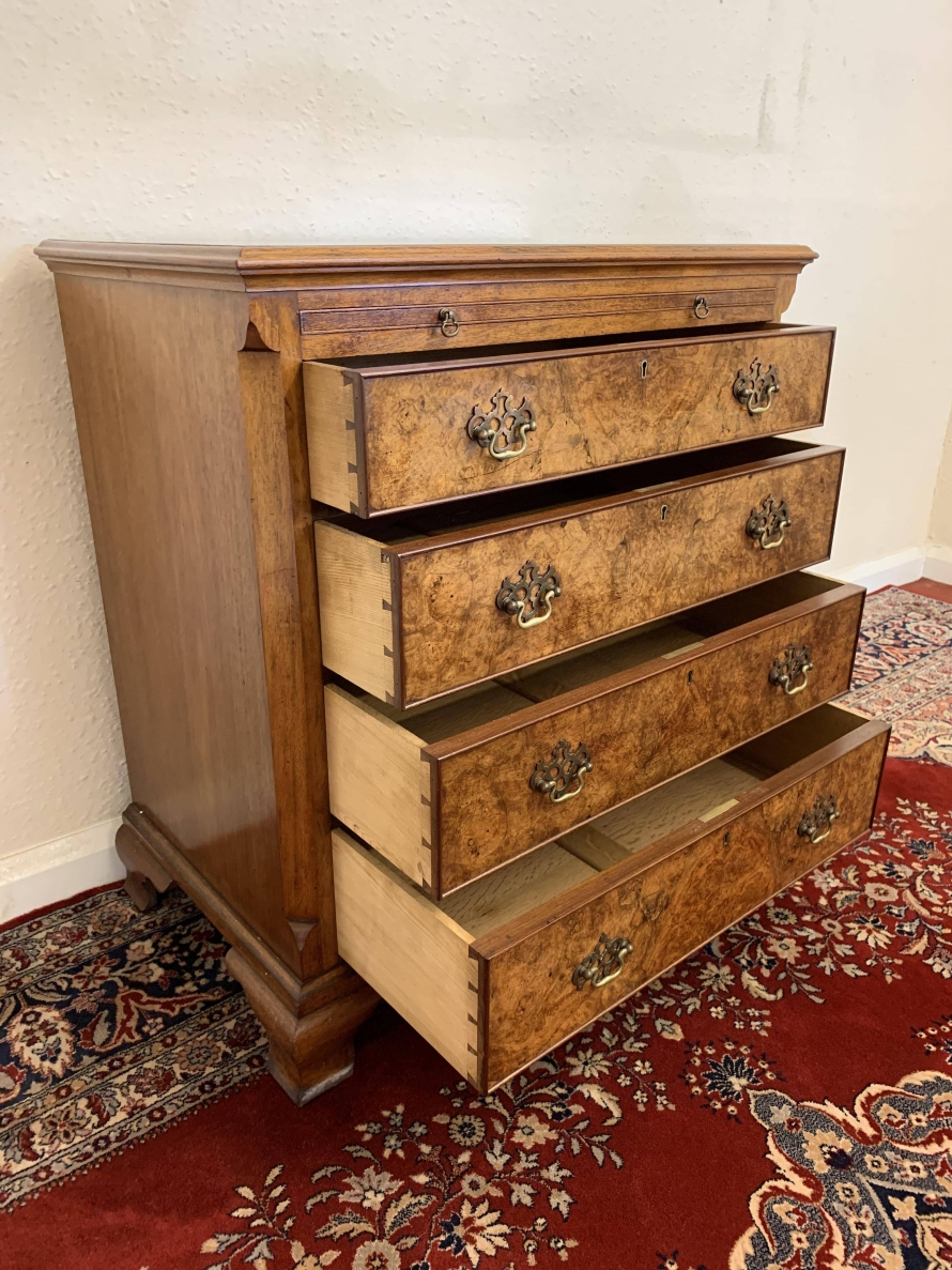 A top quality chest of drawers made in striking Burr Walnut. The oversailing top sits above a retractable brushing slide. Below are four graduated drawers, each drawer having a pair of decorative brass handles. With canted corners to the front this fabulous chest of drawers stands on four bracket feet.