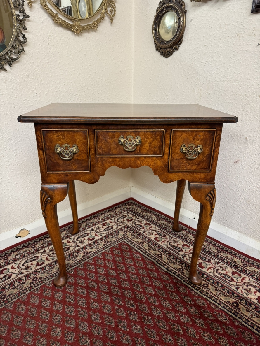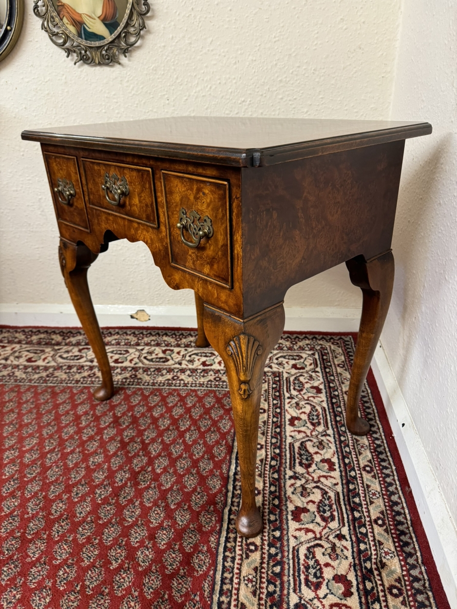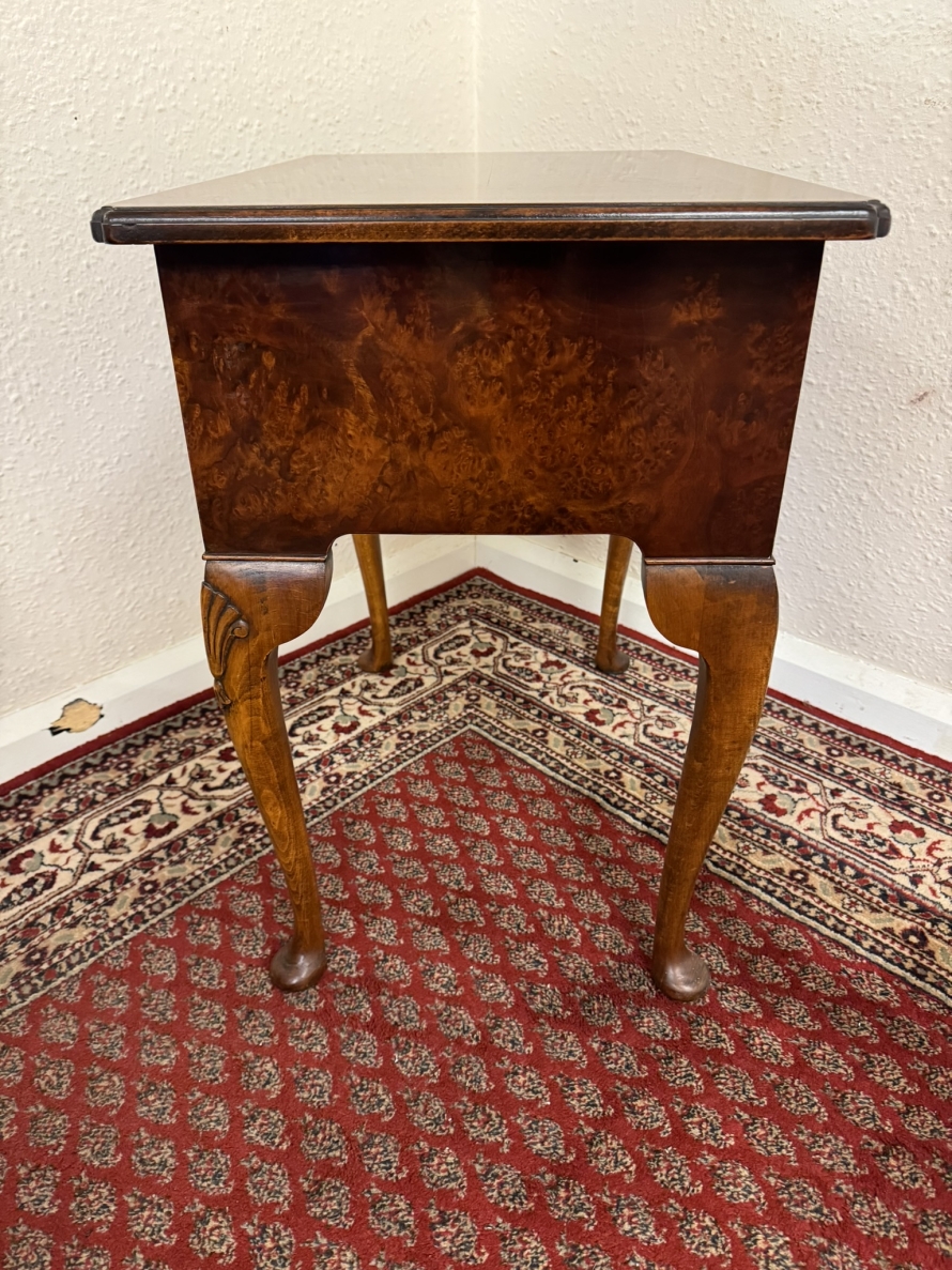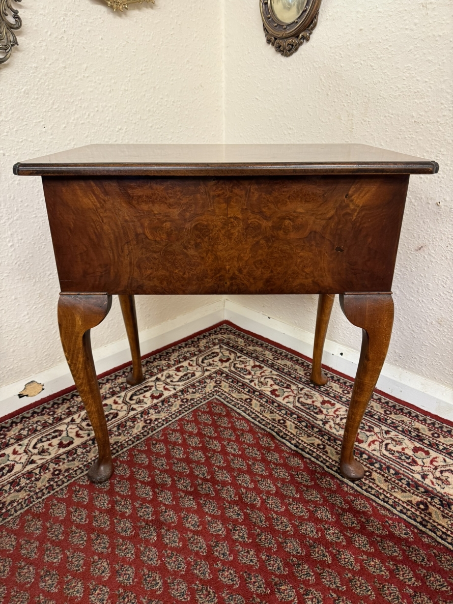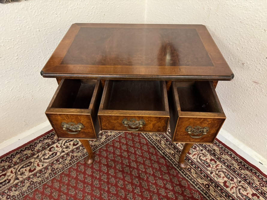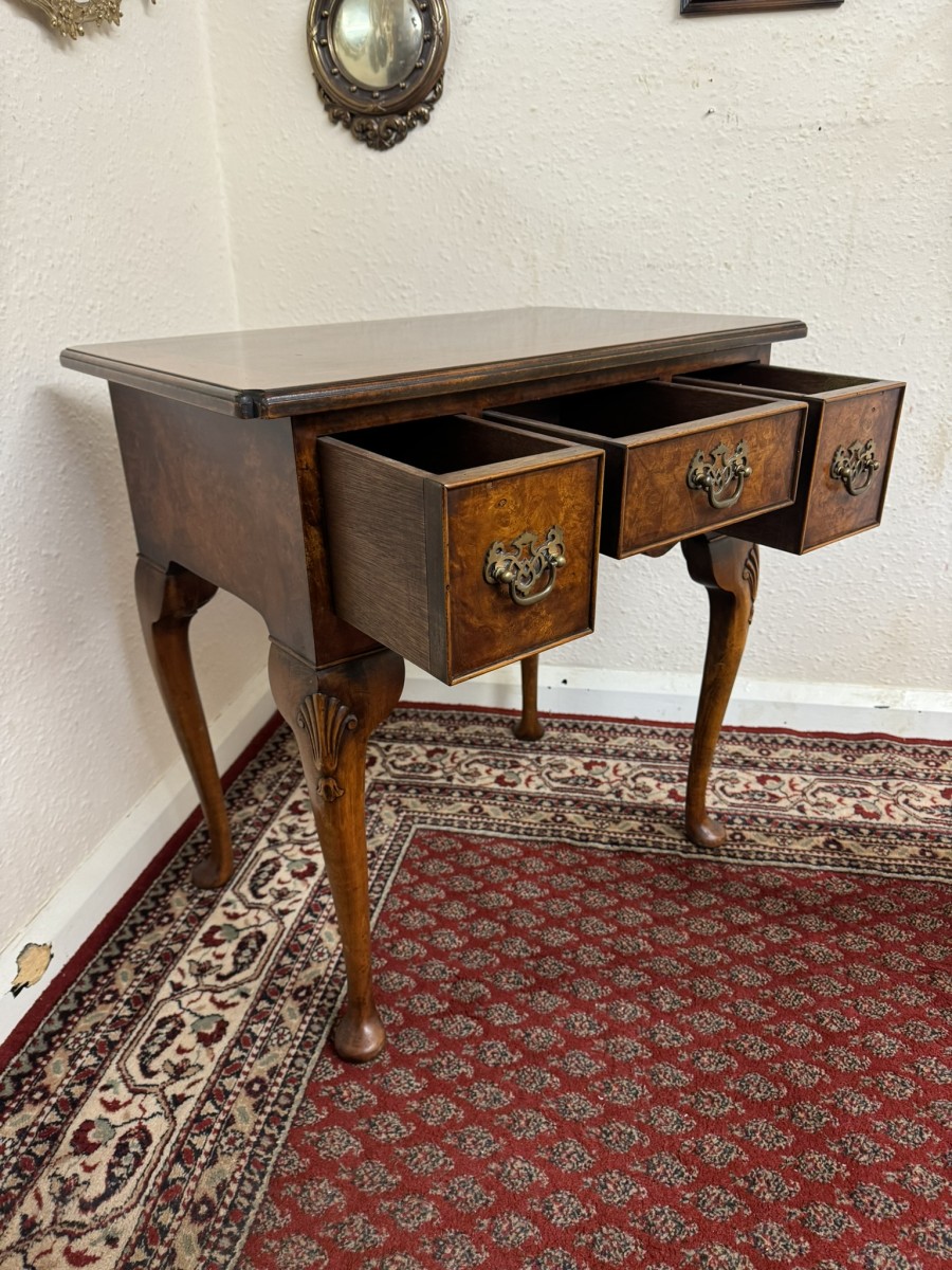 The lowboy is made in striking burr walnut. The oversailing top has a cross banded edging with herring bone inlaid decoration, below is a central drawer which is flanked by a pair of drawers, each drawer having a brass handle. The lowboy stands on four elegant cabriole shaped legs the front two legs having carved decoration.