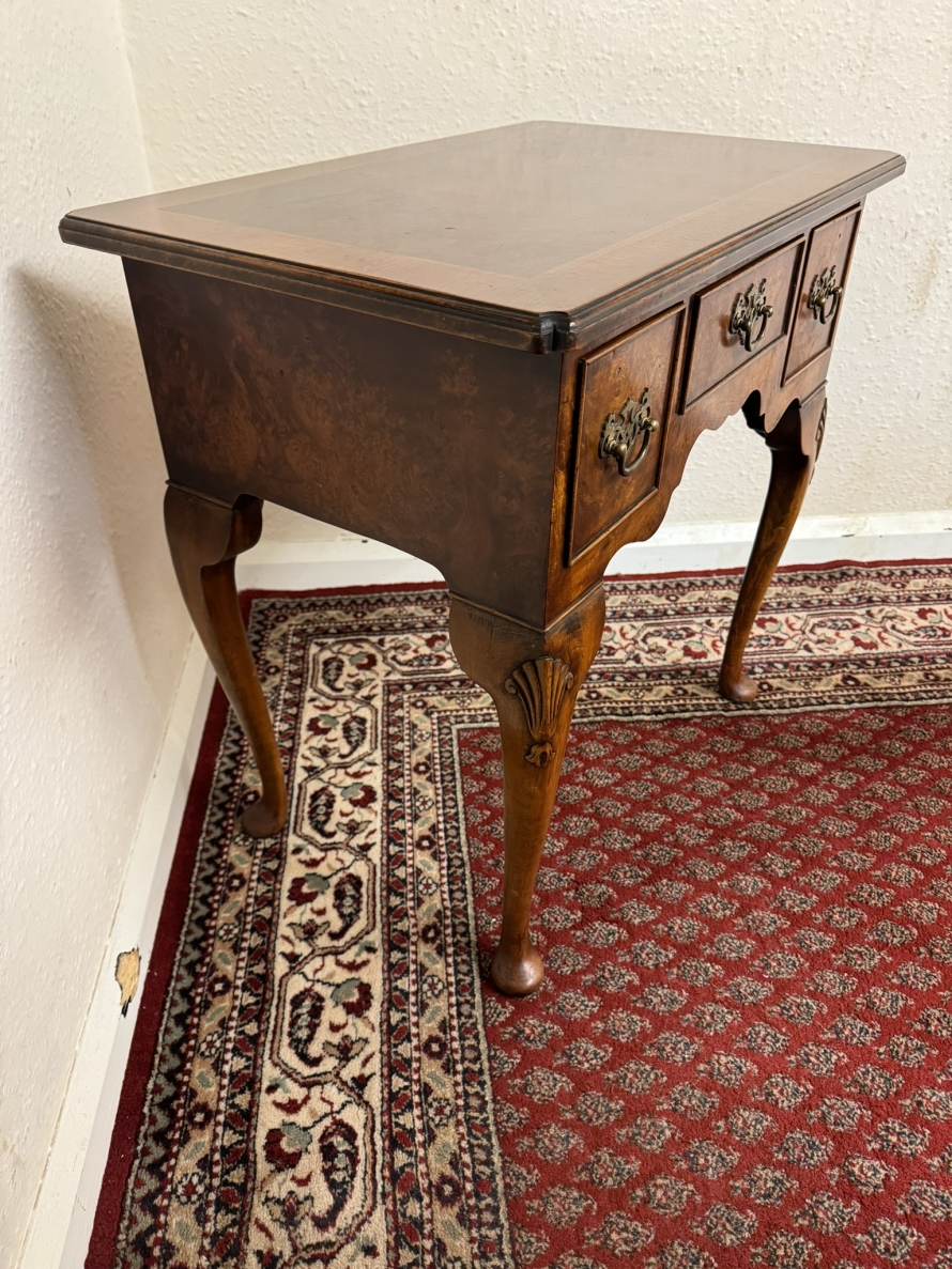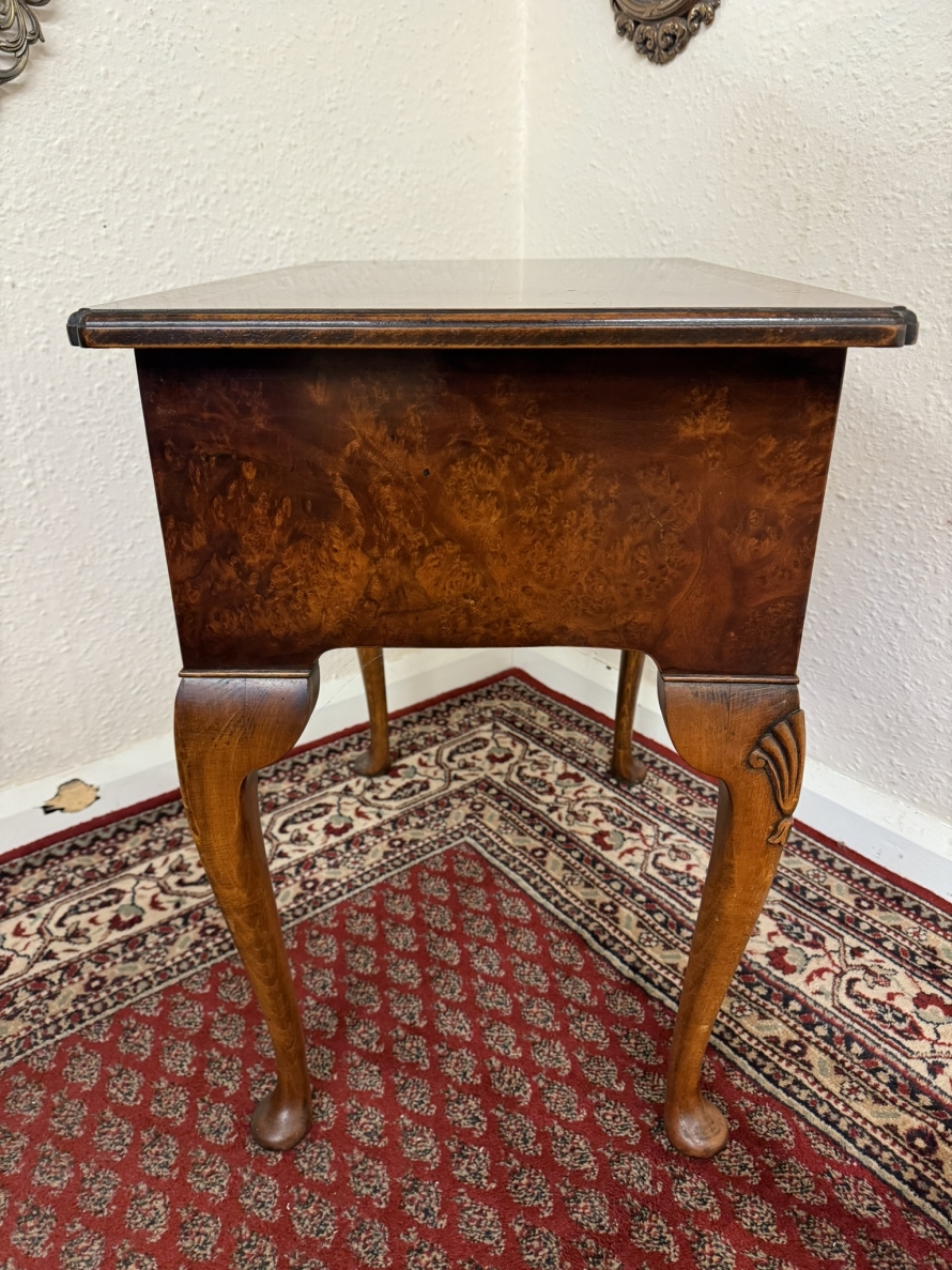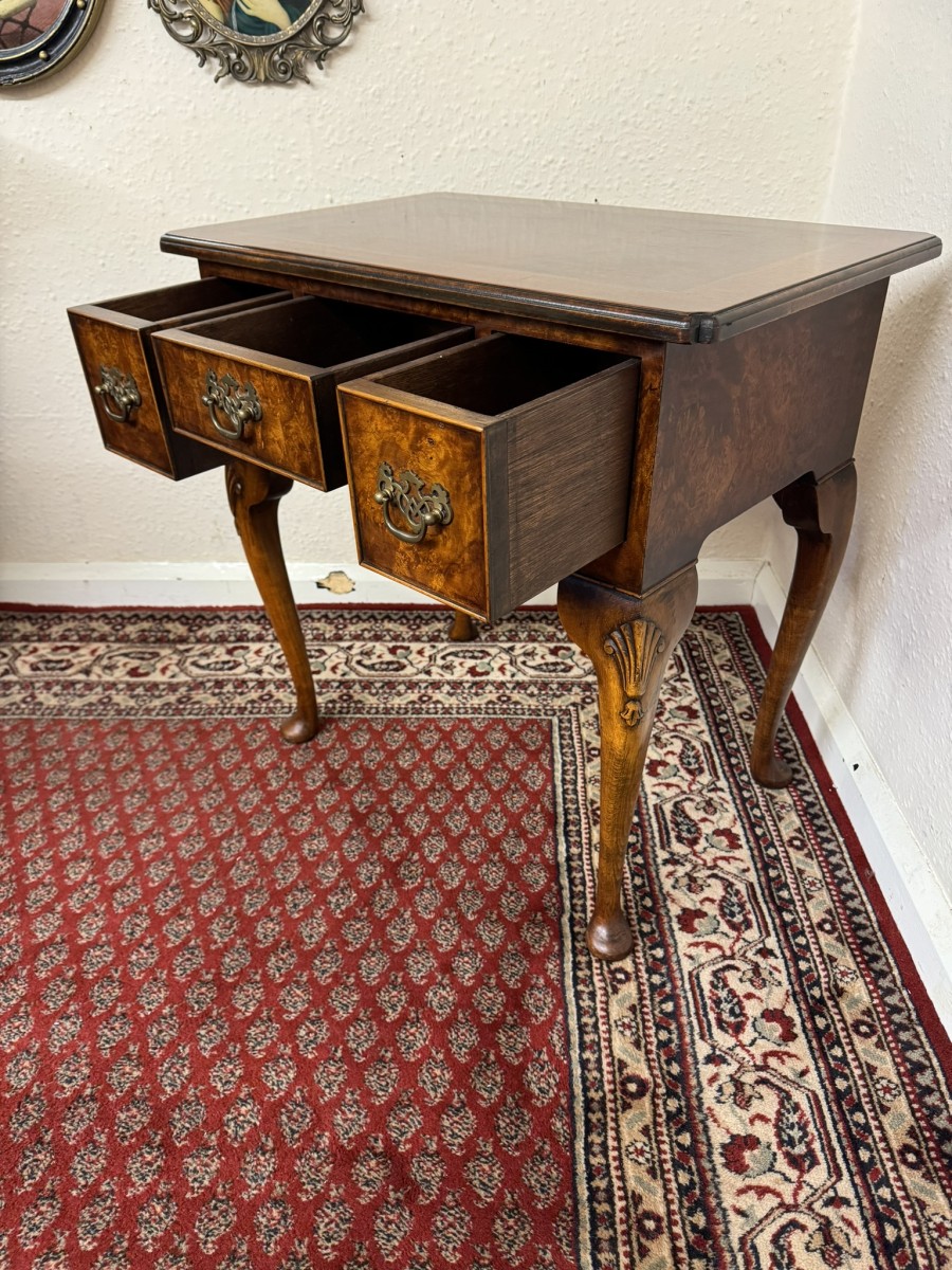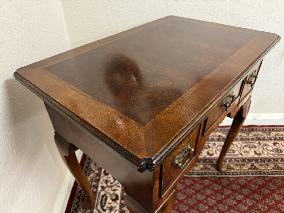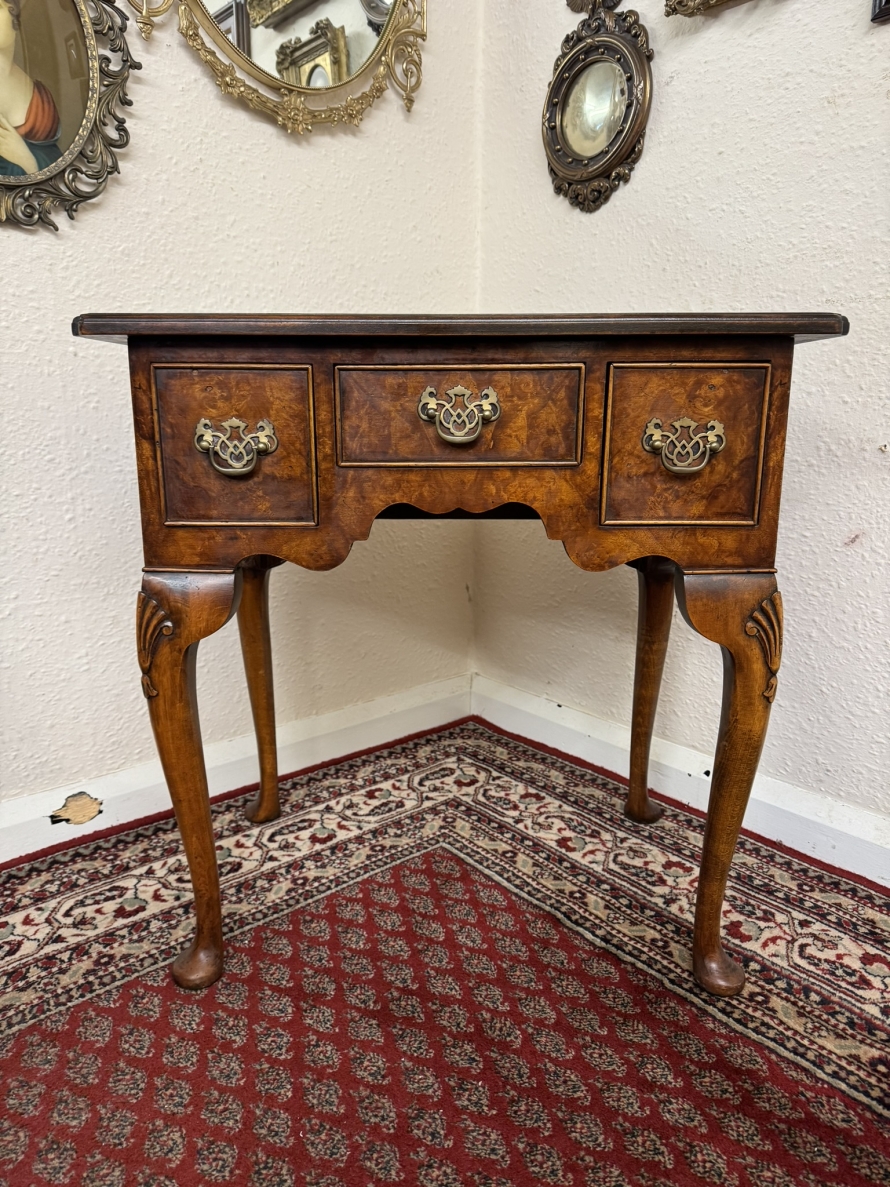 The lowboy is made in striking burr walnut. The oversailing top has a cross banded edging with herring bone inlaid decoration, below is a central drawer which is flanked by a pair of drawers, each drawer having a brass handle. The lowboy stands on four elegant cabriole shaped legs the front two legs having carved decoration.