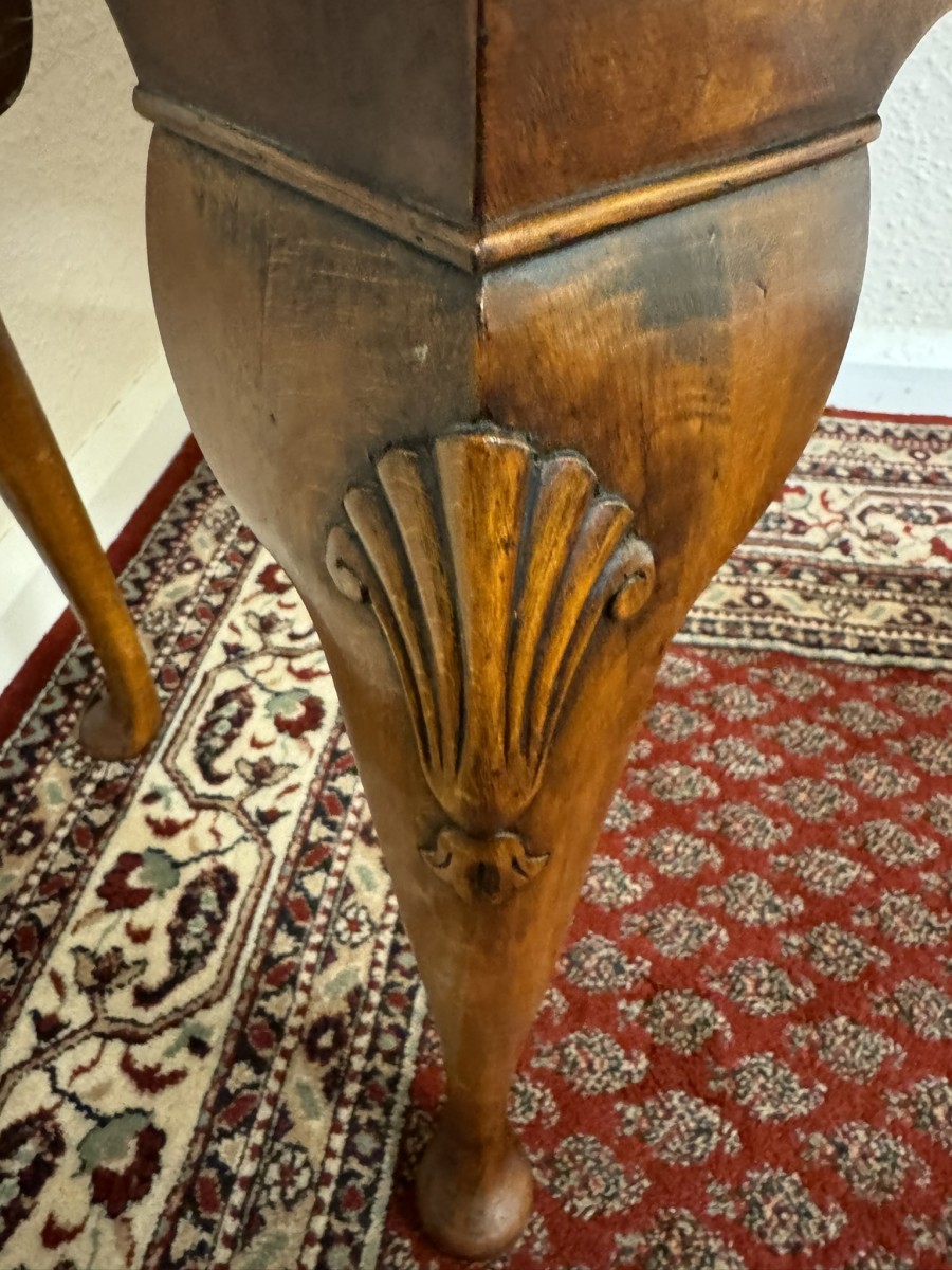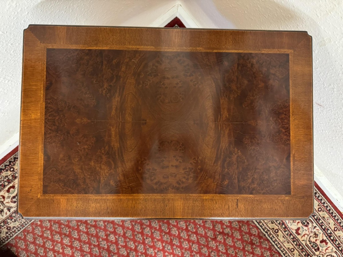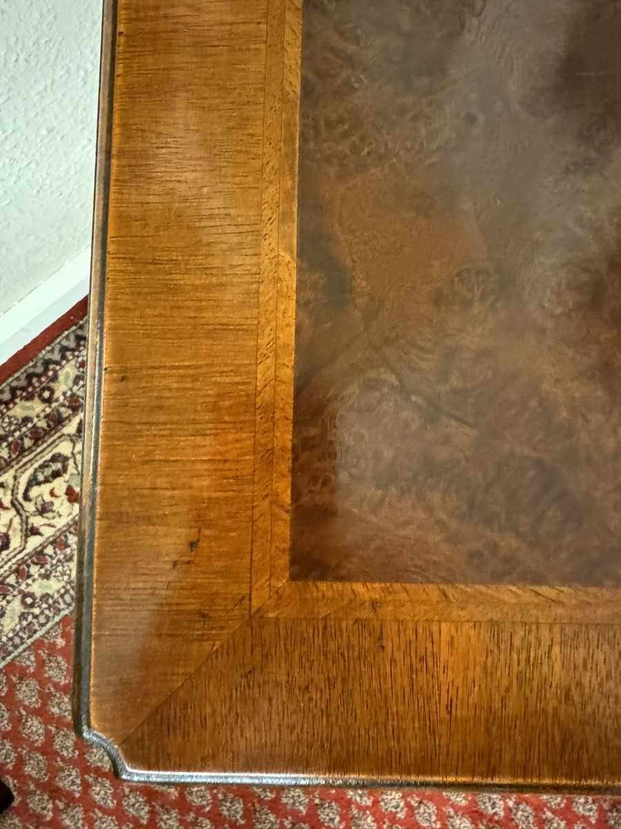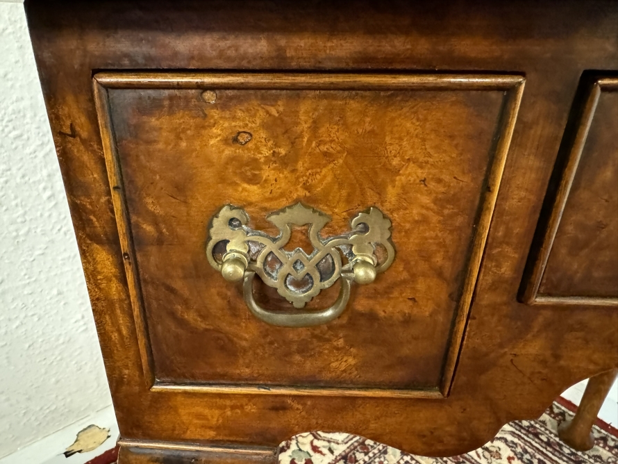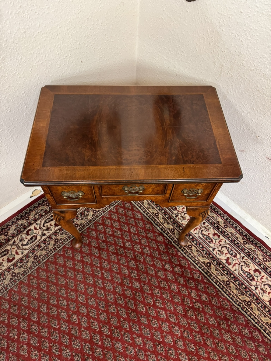 The lowboy is made in striking burr walnut. The oversailing top has a cross banded edging with herring bone inlaid decoration, below is a central drawer which is flanked by a pair of drawers, each drawer having a brass handle. The lowboy stands on four elegant cabriole shaped legs the front two legs having carved decoration.