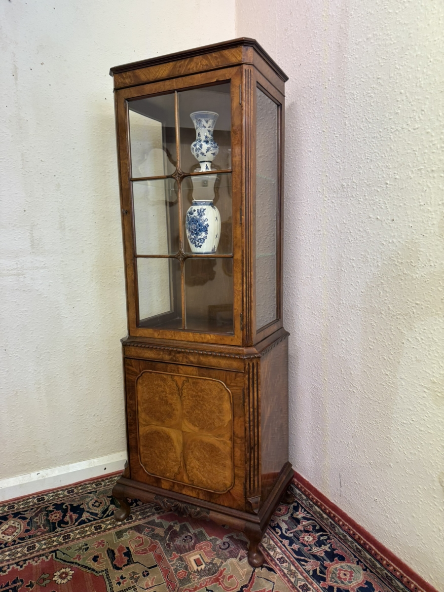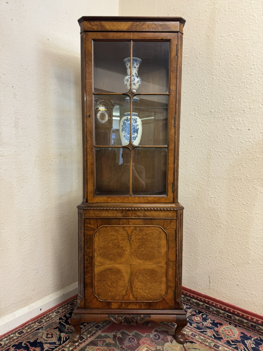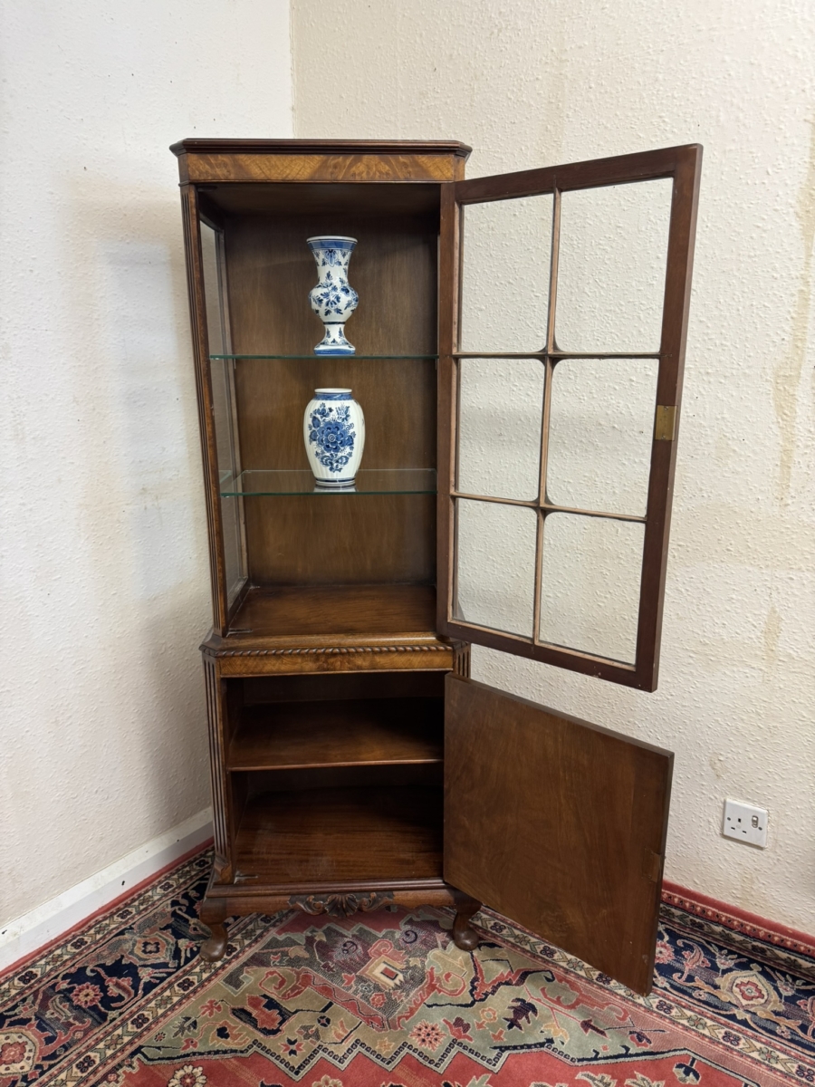 The cabinet dates circa 1930. Made in striking walnut and is in excellent condition. The over sailing top sits above a lockable glazed door, the door opens to reveal two removable glass shelves. The door has reeded carvings to the sides, below is a lockable cupboard door, the door opens to reveal a removable shelf. This door also has reeded carving to the sides. Shaped skirt with decorative central carving and standing on four cabriole shaped legs.