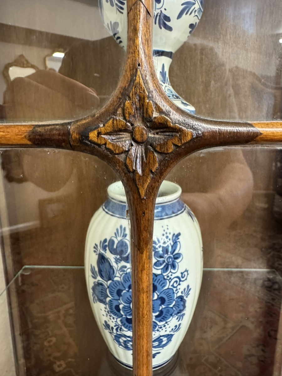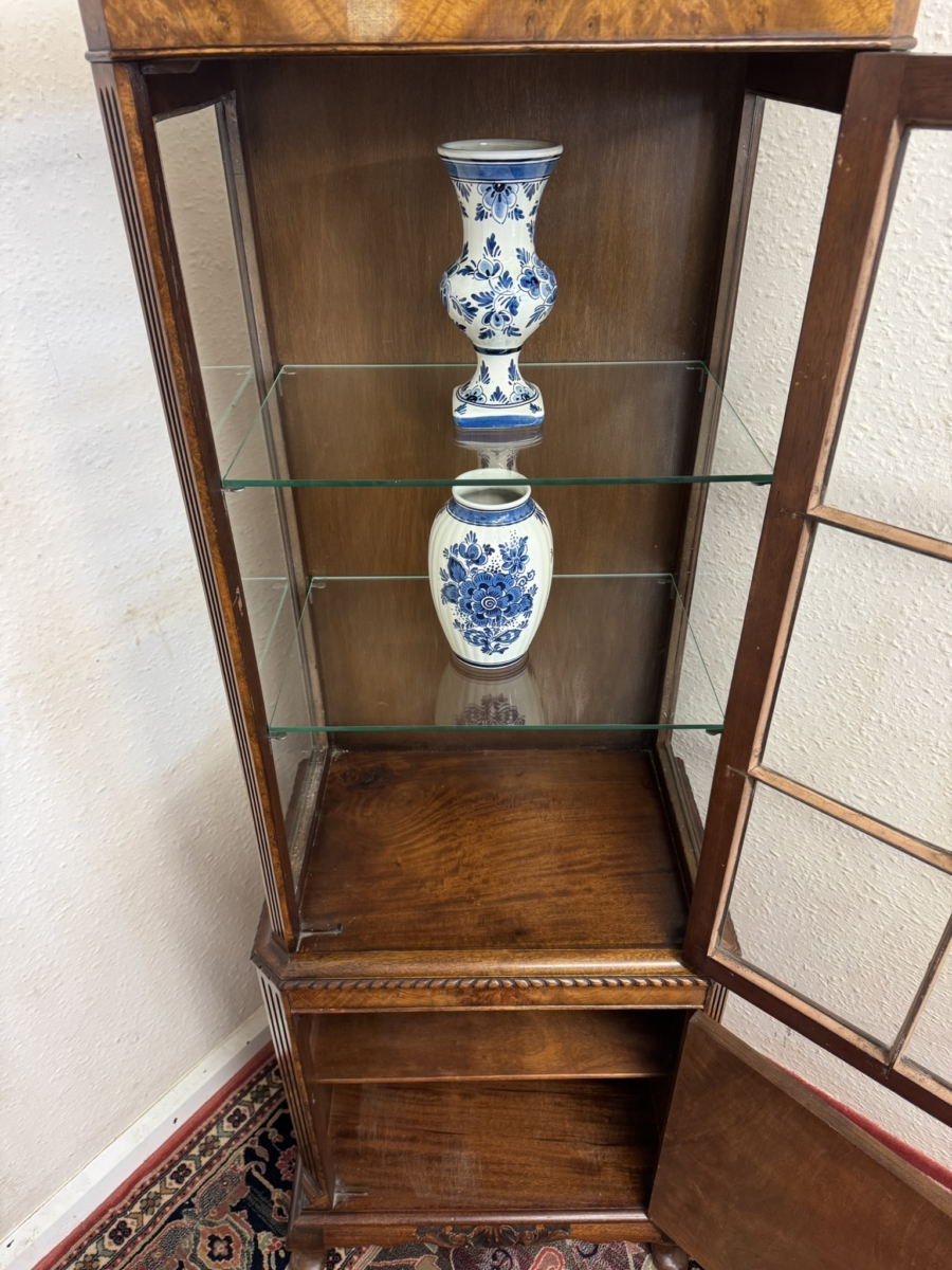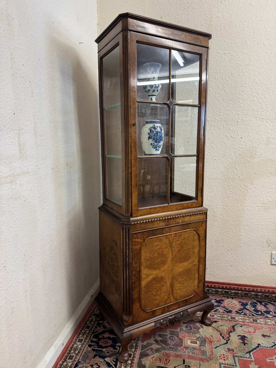 The cabinet dates circa 1930. Made in striking walnut and is in excellent condition. The over sailing top sits above a lockable glazed door, the door opens to reveal two removable glass shelves. The door has reeded carvings to the sides, below is a lockable cupboard door, the door opens to reveal a removable shelf. This door also has reeded carving to the sides. Shaped skirt with decorative central carving and standing on four cabriole shaped legs.
