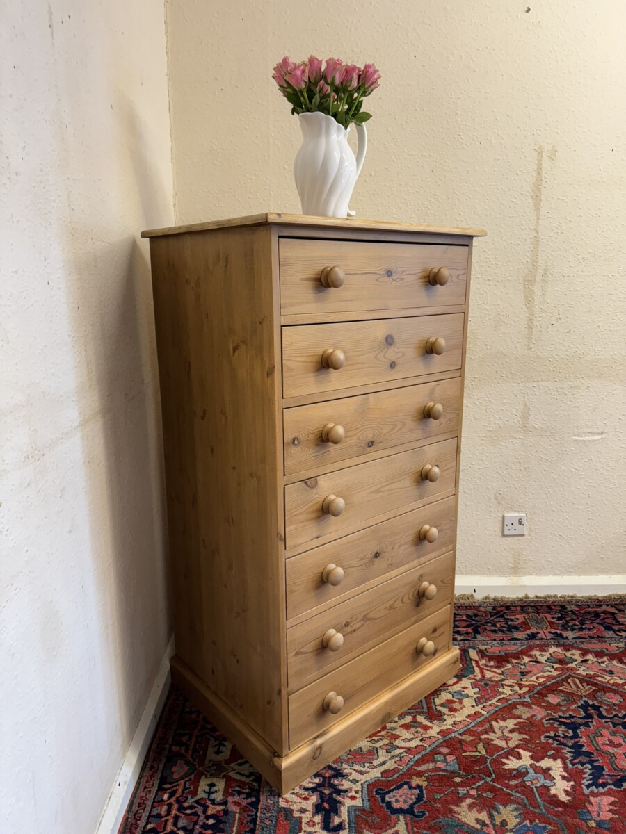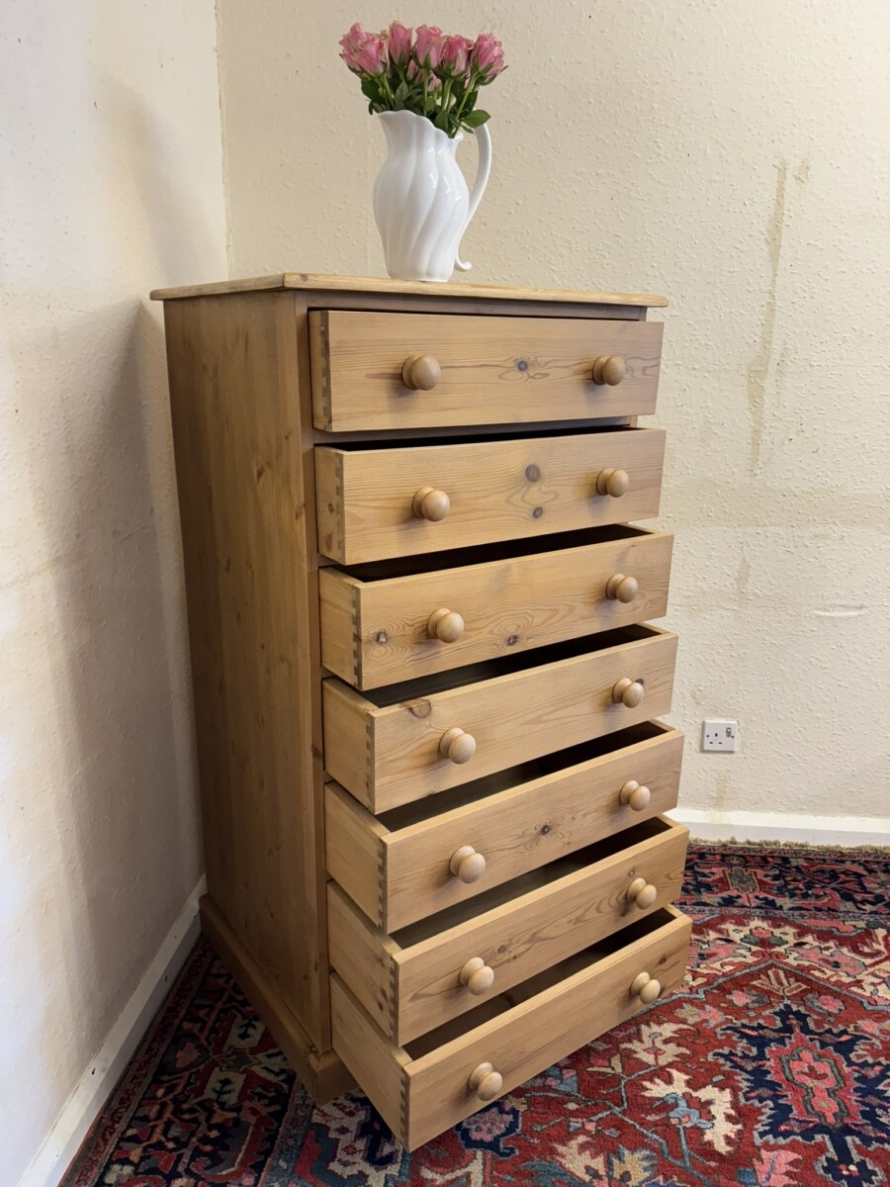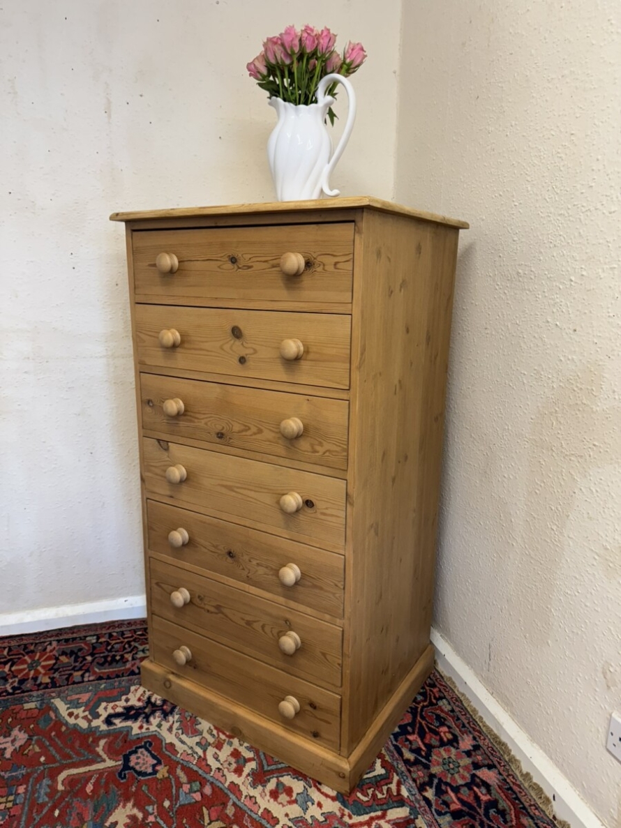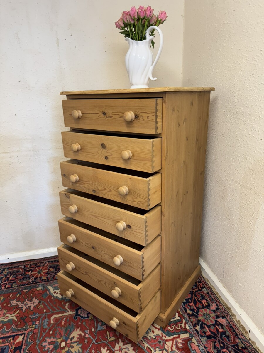 This great chest is in excellent condition. Oversailing top sits above seven drawers, each drawer having a pair of turned handles. The chest sits on a platform plinth.