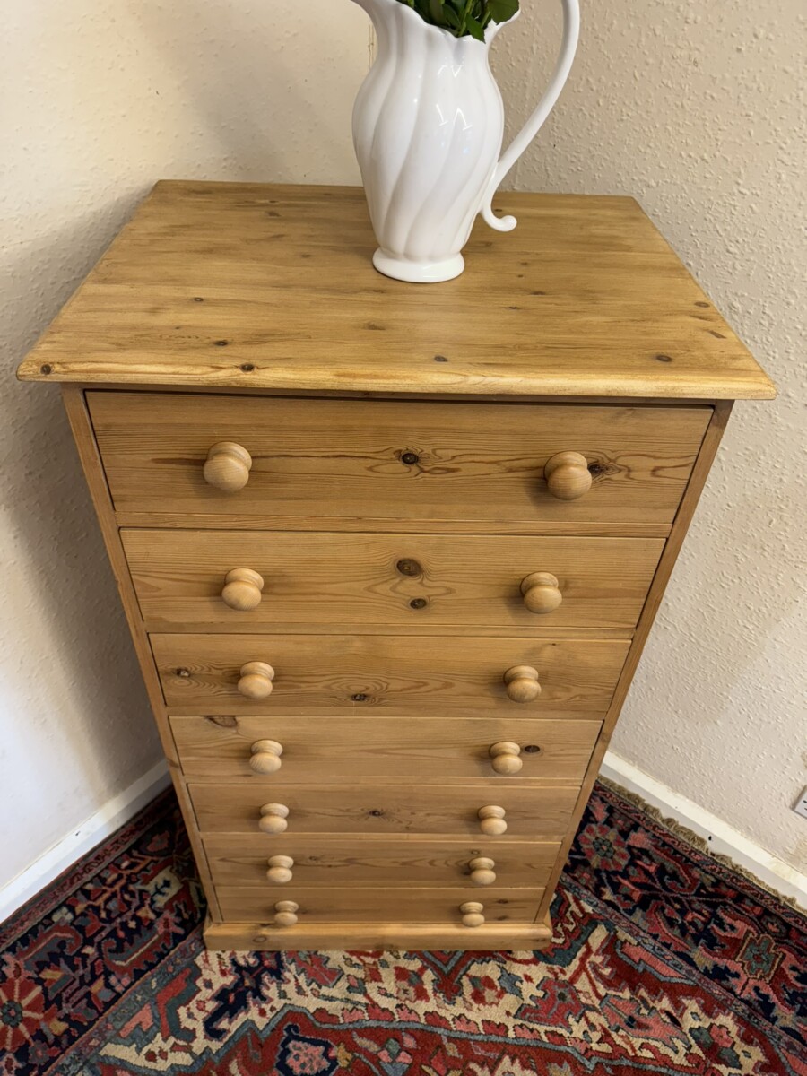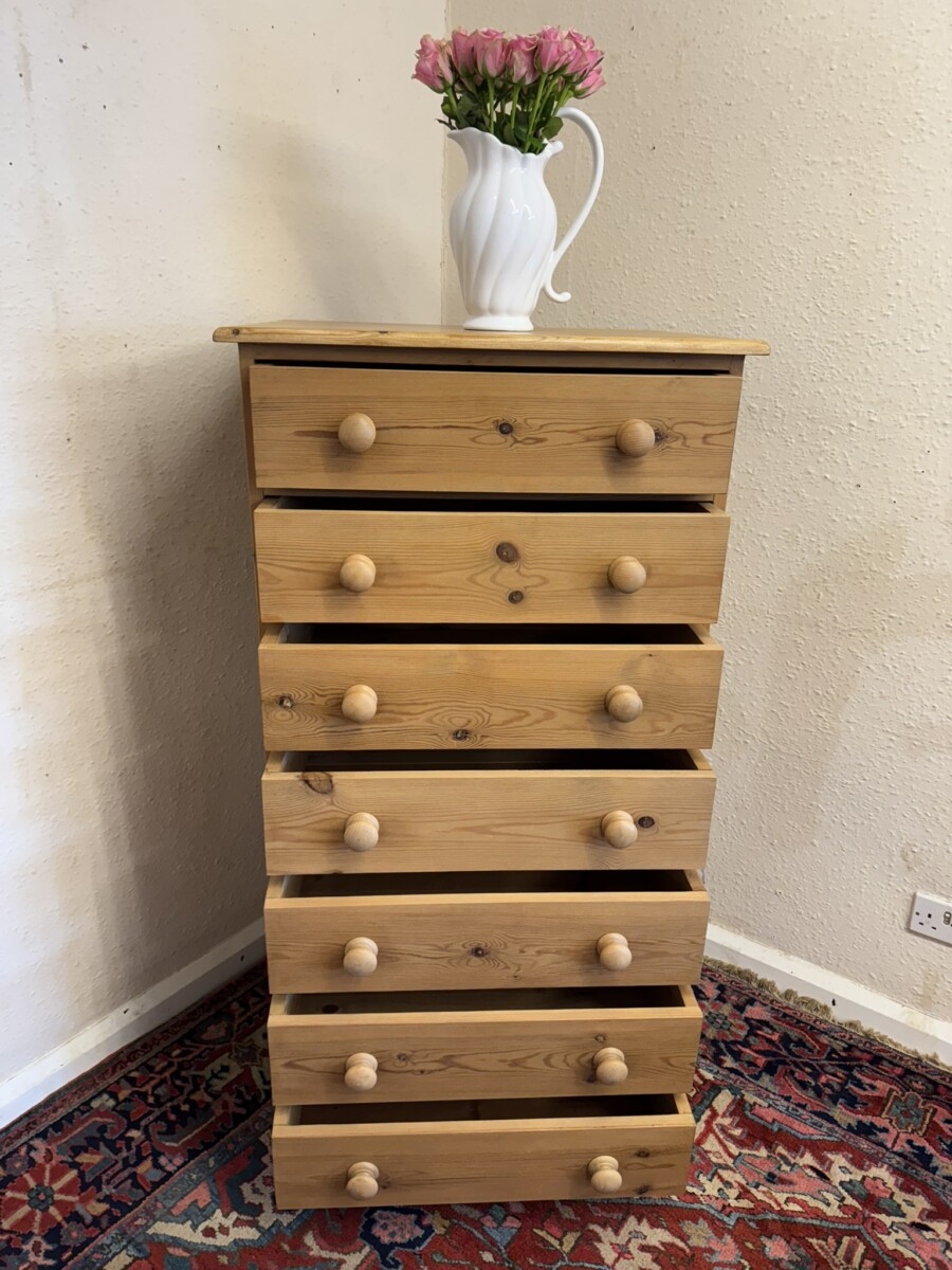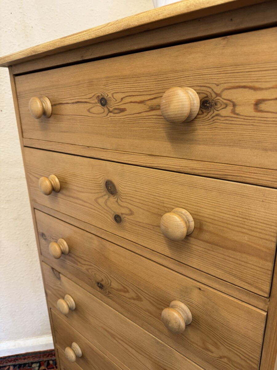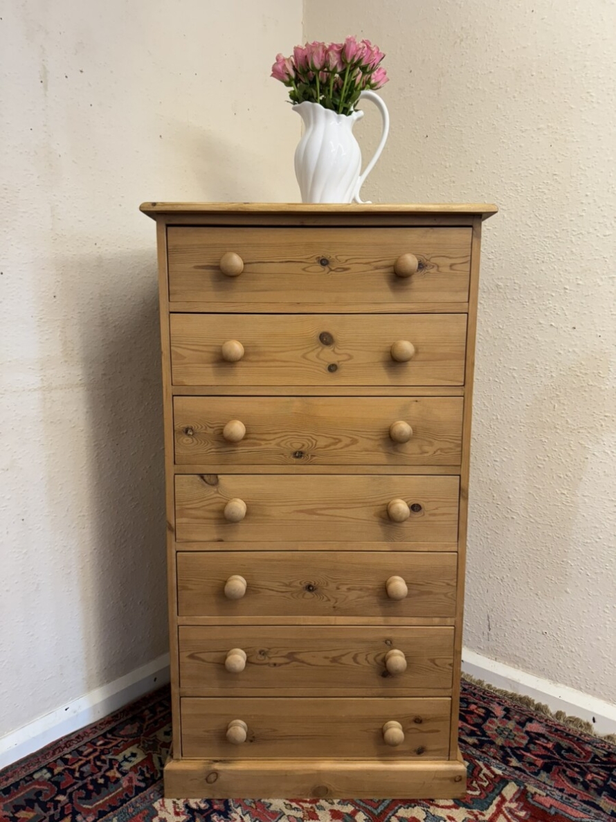 This great chest is in excellent condition. Oversailing top sits above seven drawers, each drawer having a pair of turned handles. The chest sits on a platform plinth.