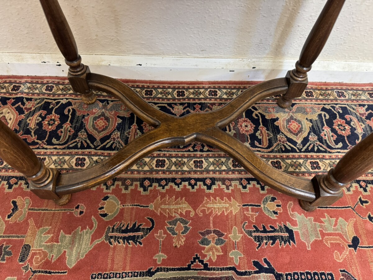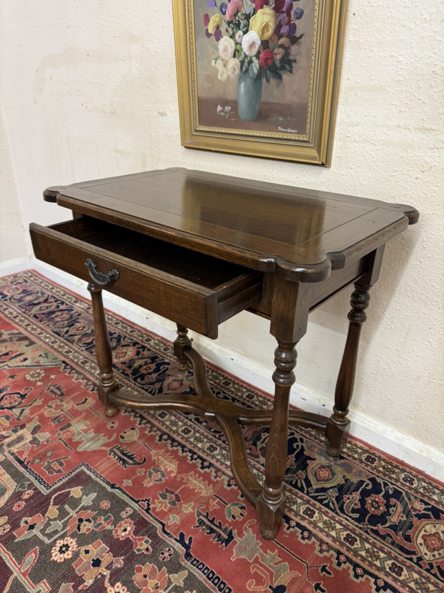 The shaped top sits above a drawer, the drawer having a brass handle. Four turned legs, curved stretchered supports and standing on turned feet.