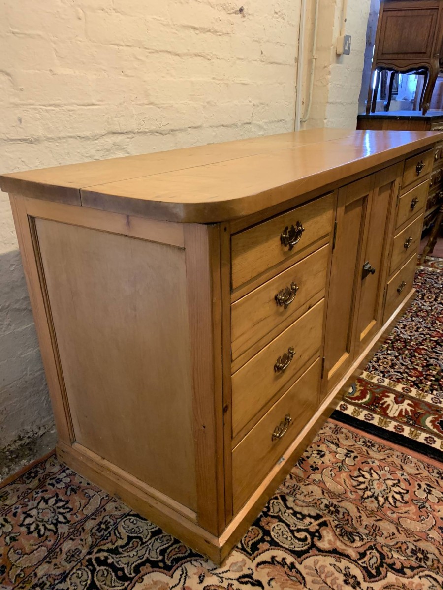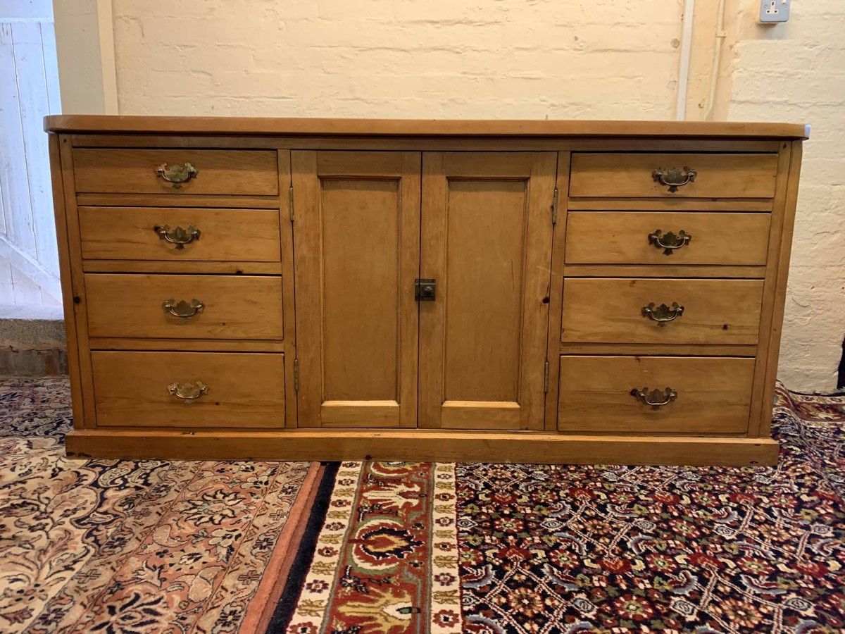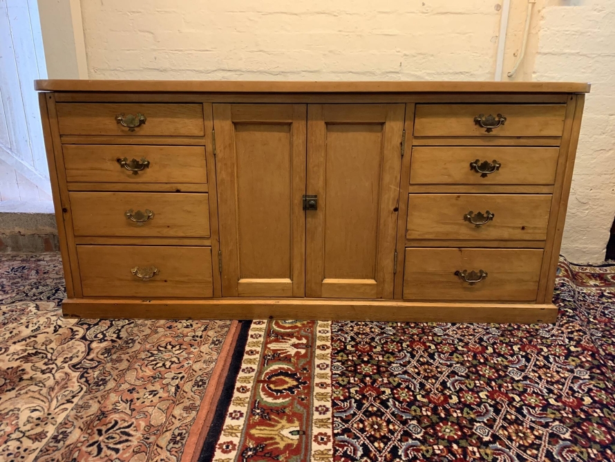 The dresser dates circa 1890. Having a thick pine top, pair of recessed panelled central cupboard doors, the doors opening to reveal a slatted shelf. The central pair of doors are flanked by two banks of four graduated drawers, each drawer having a brass handle. The dresser sits on a platform base.