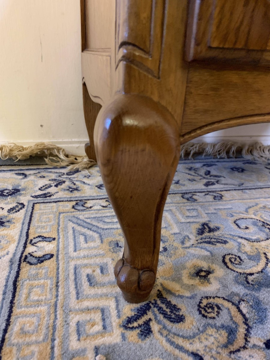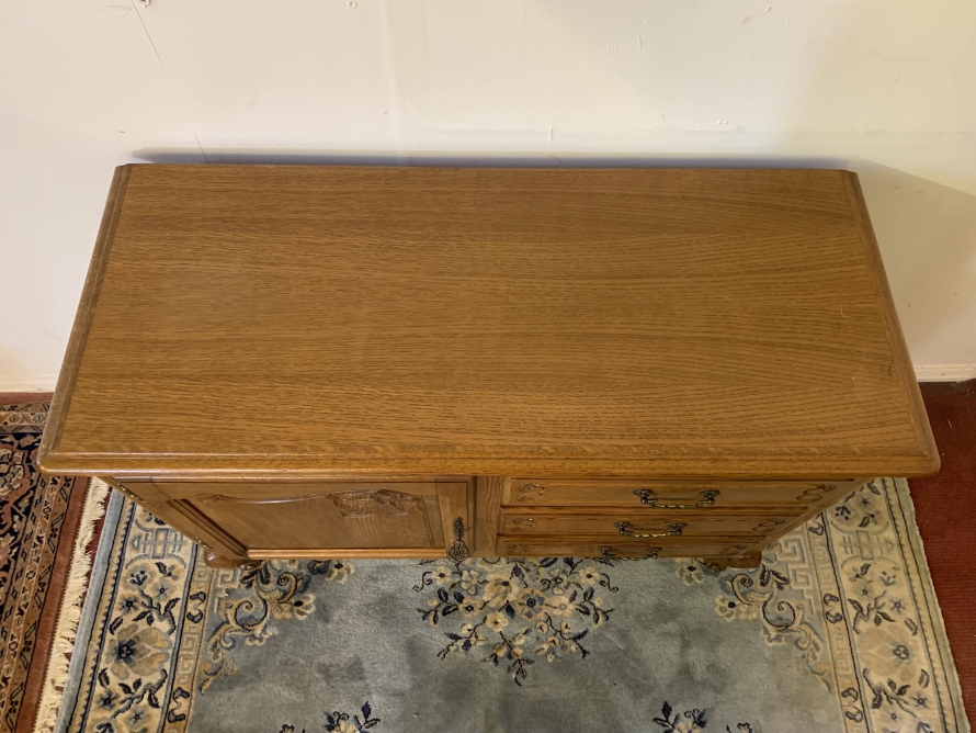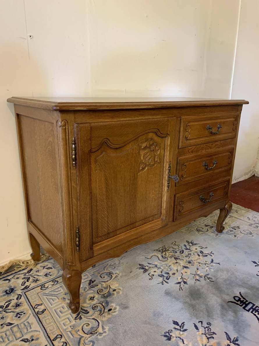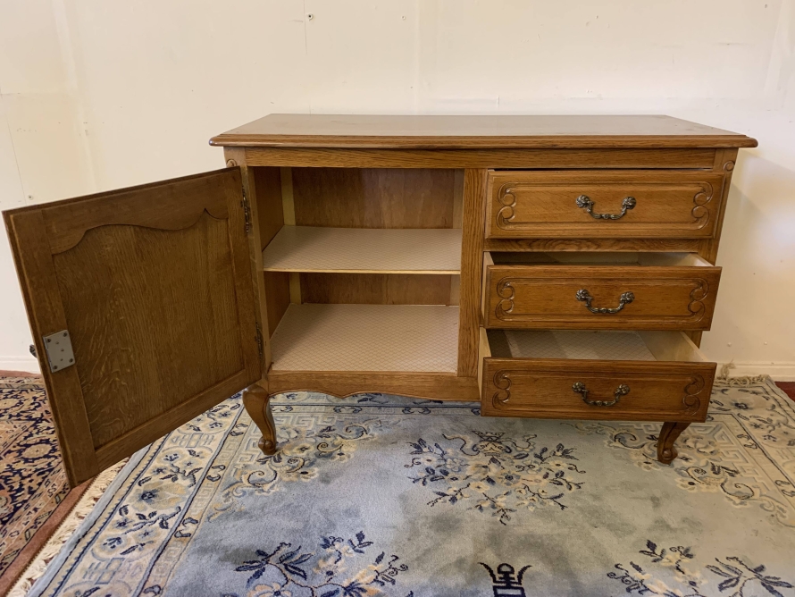 The oversailing top sits above a bank of three carved drawers, each drawer having decorative brass handle. To the side of the drawers is a carved recessed panelled lockable cupboard door, the door having brass hinges decorative brass escutcheon and key. The door opens to reveal a removable shelf. This fantastic cabinet stands on four carved cabriole shaped legs.