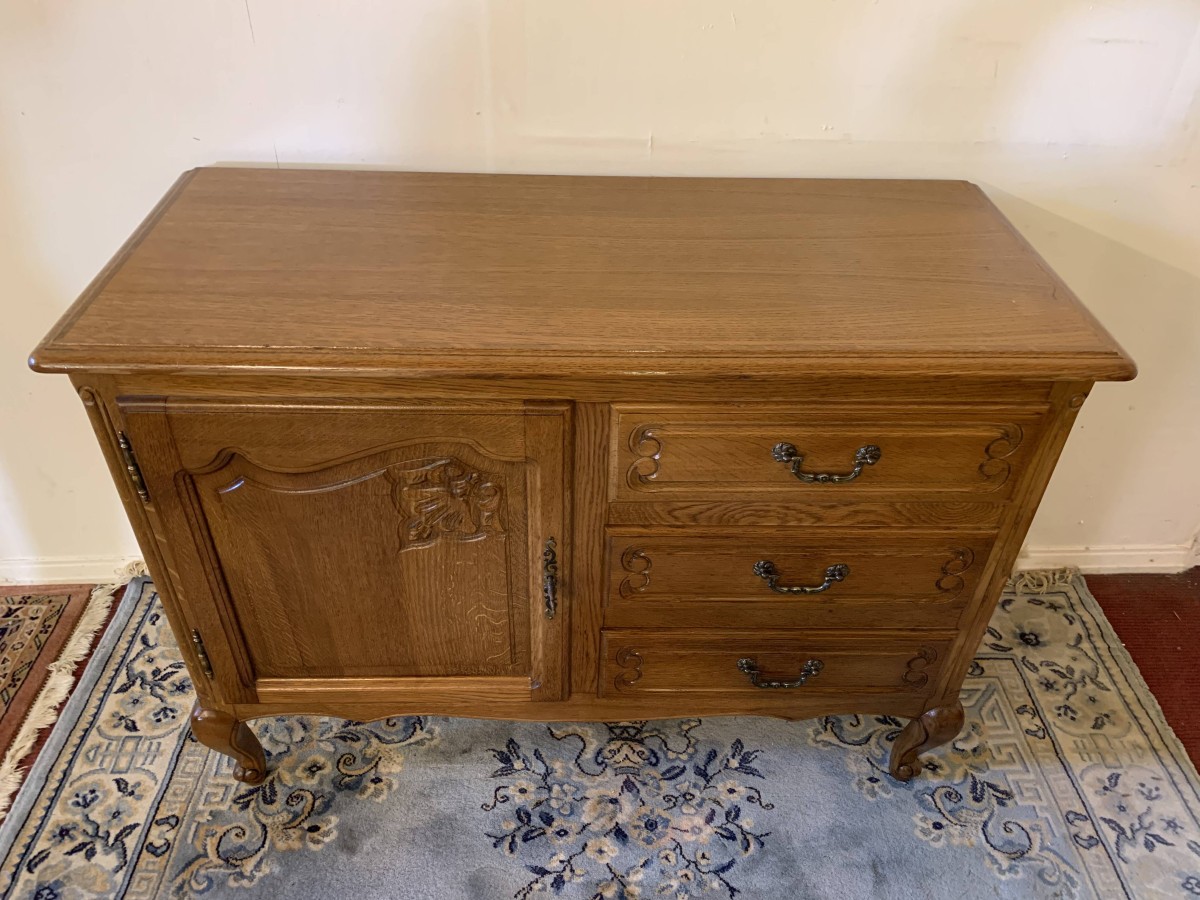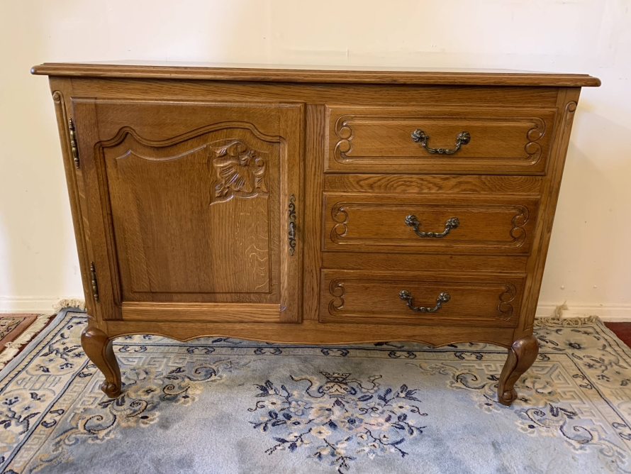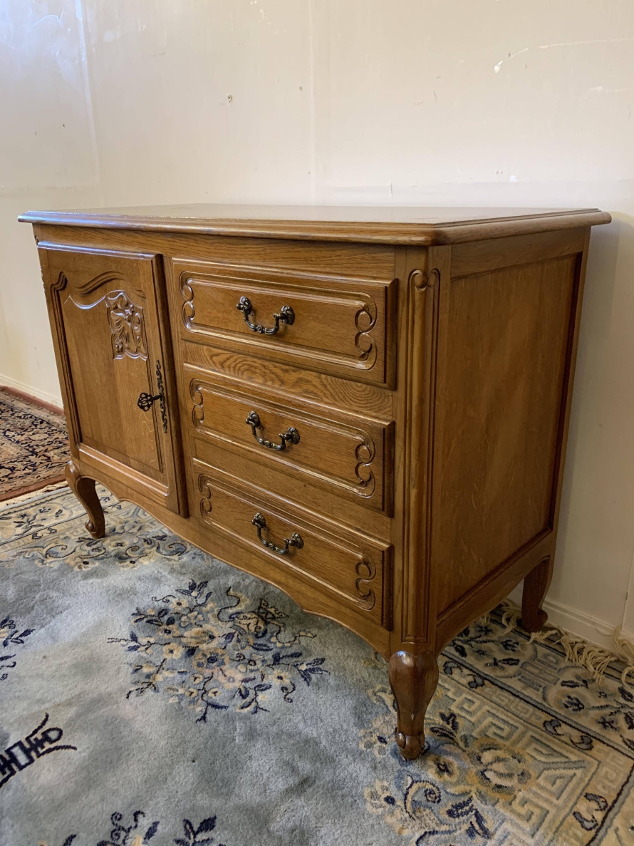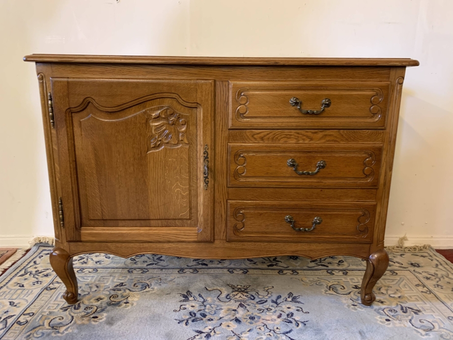The oversailing top sits above a bank of three carved drawers, each drawer having decorative brass handle. To the side of the drawers is a carved recessed panelled lockable cupboard door, the door having brass hinges decorative brass escutcheon and key. The door opens to reveal a removable shelf. This fantastic cabinet stands on four carved cabriole shaped legs.