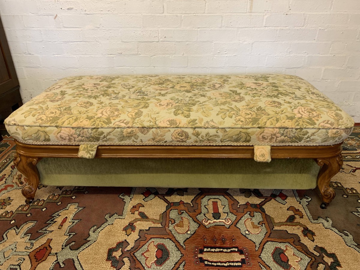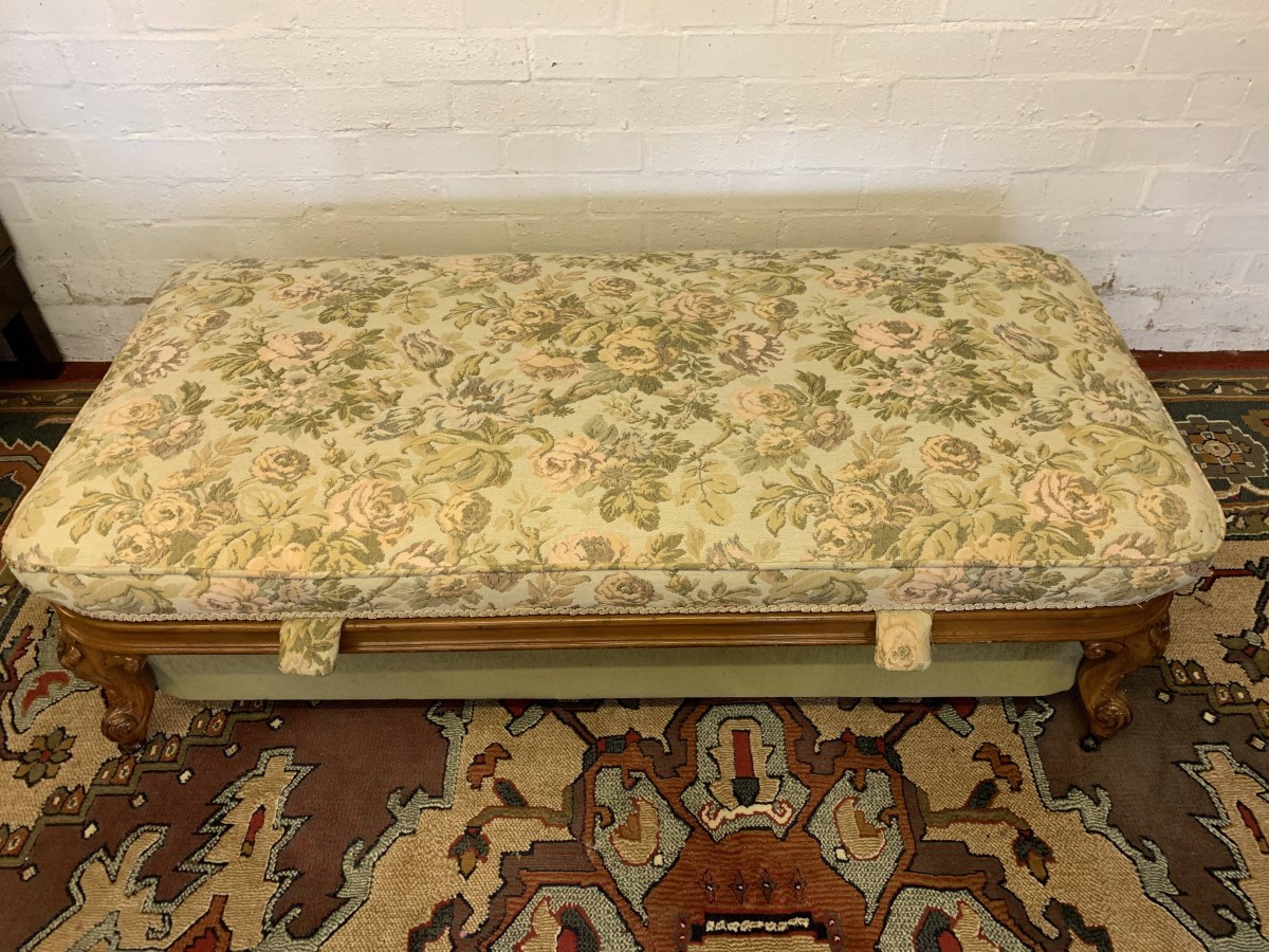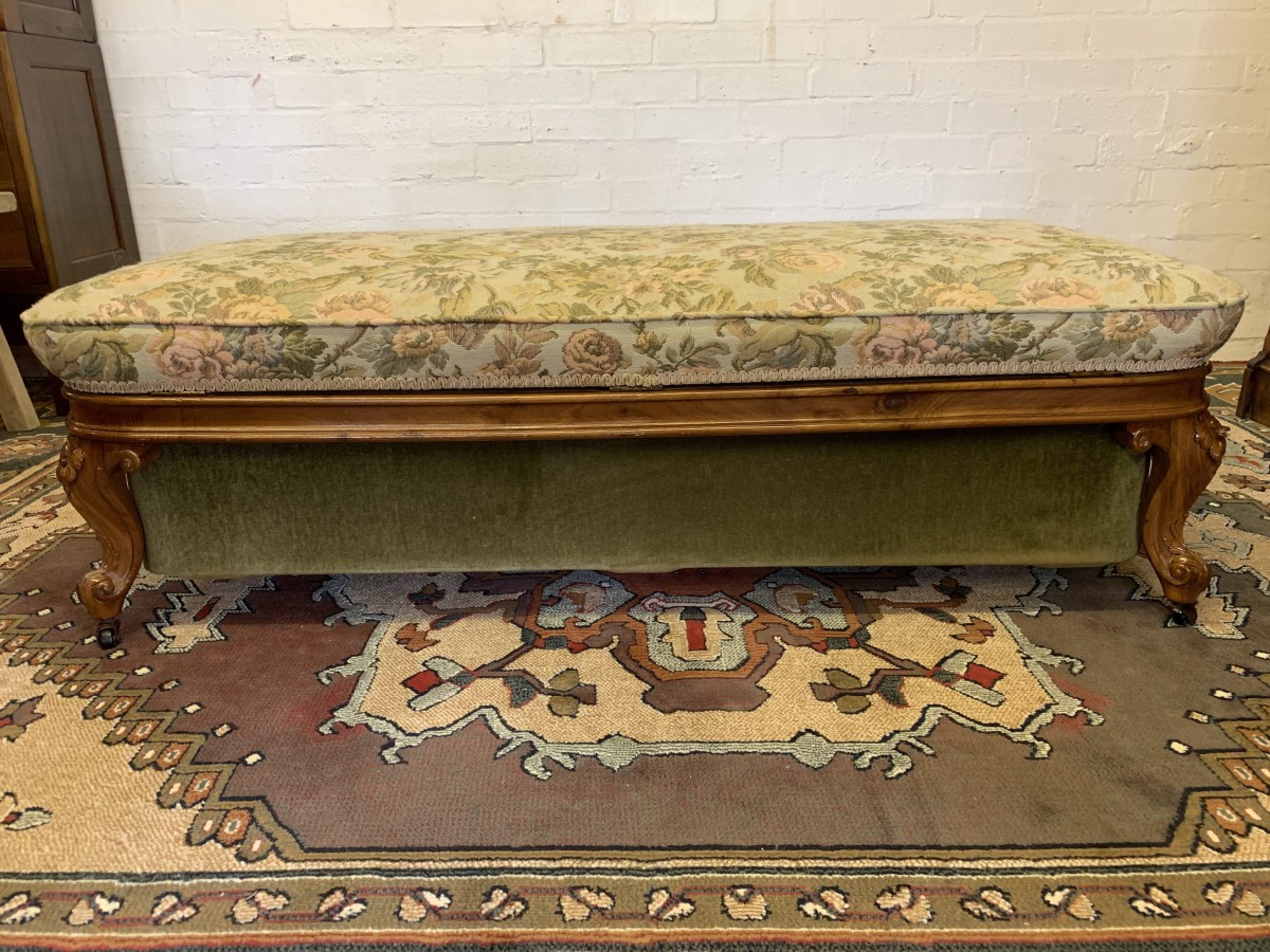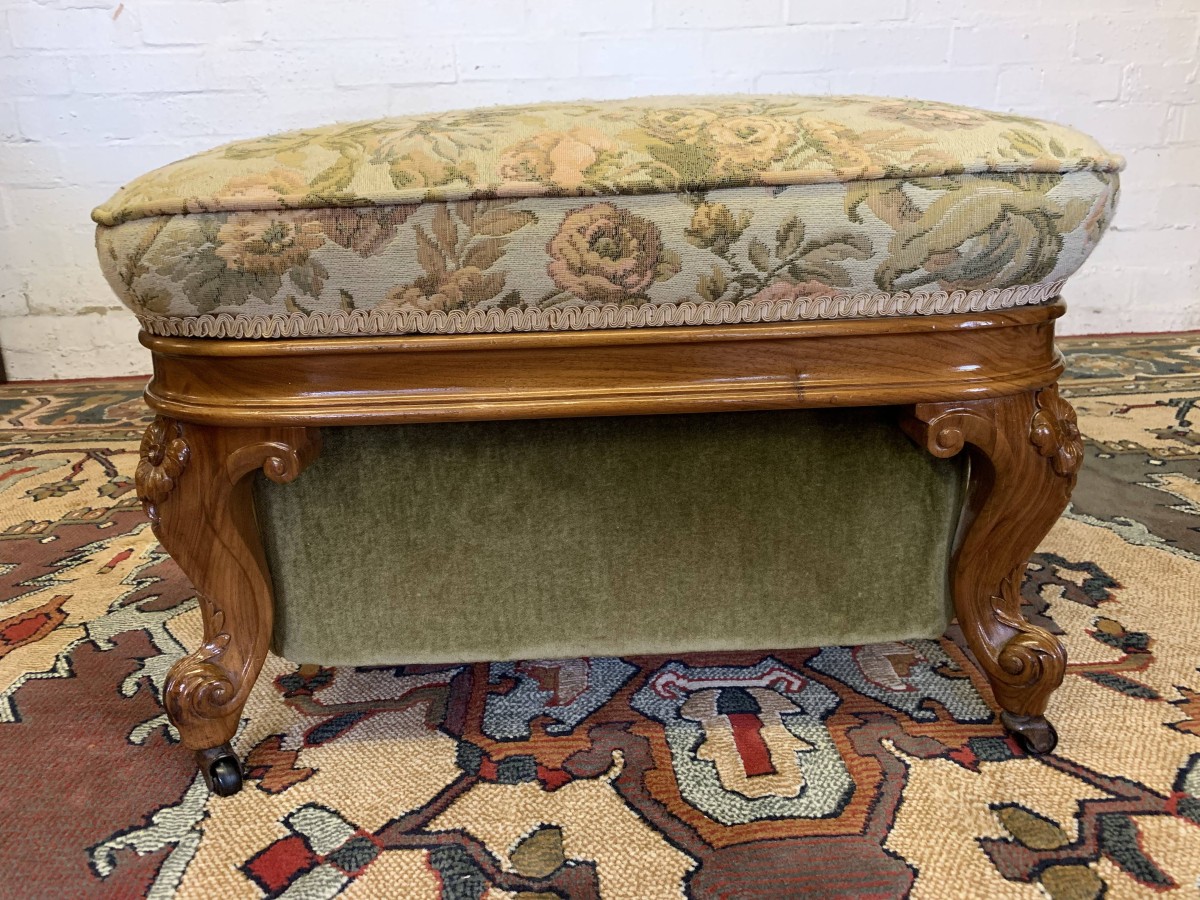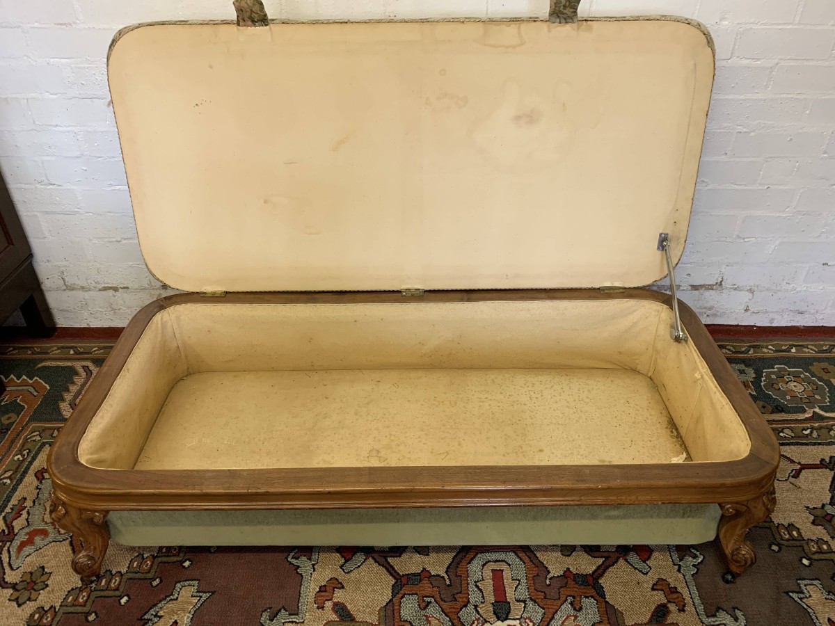 The lift up lid has a cushioned upholstered top. The lid lifts up to offer a generous storage space. The frame of the ottoman is made in walnut and the ottoman sits on four beautiful carved cabriole shaped legs with original casters. An exceptional item of functional furniture.