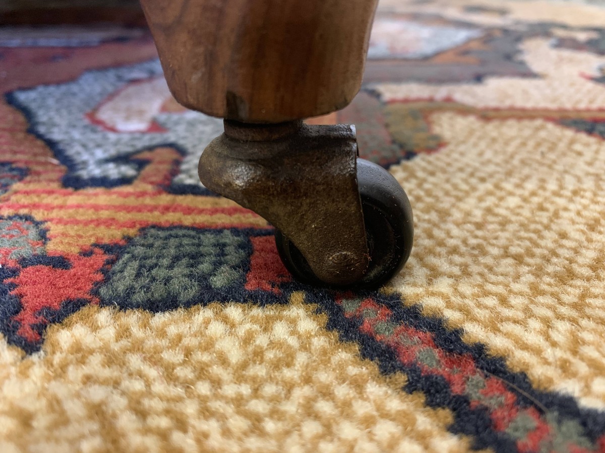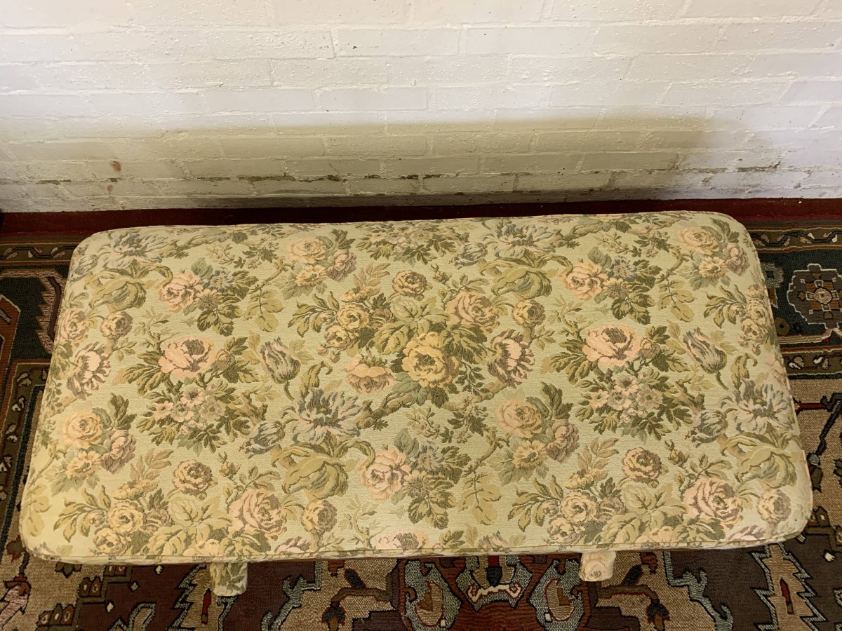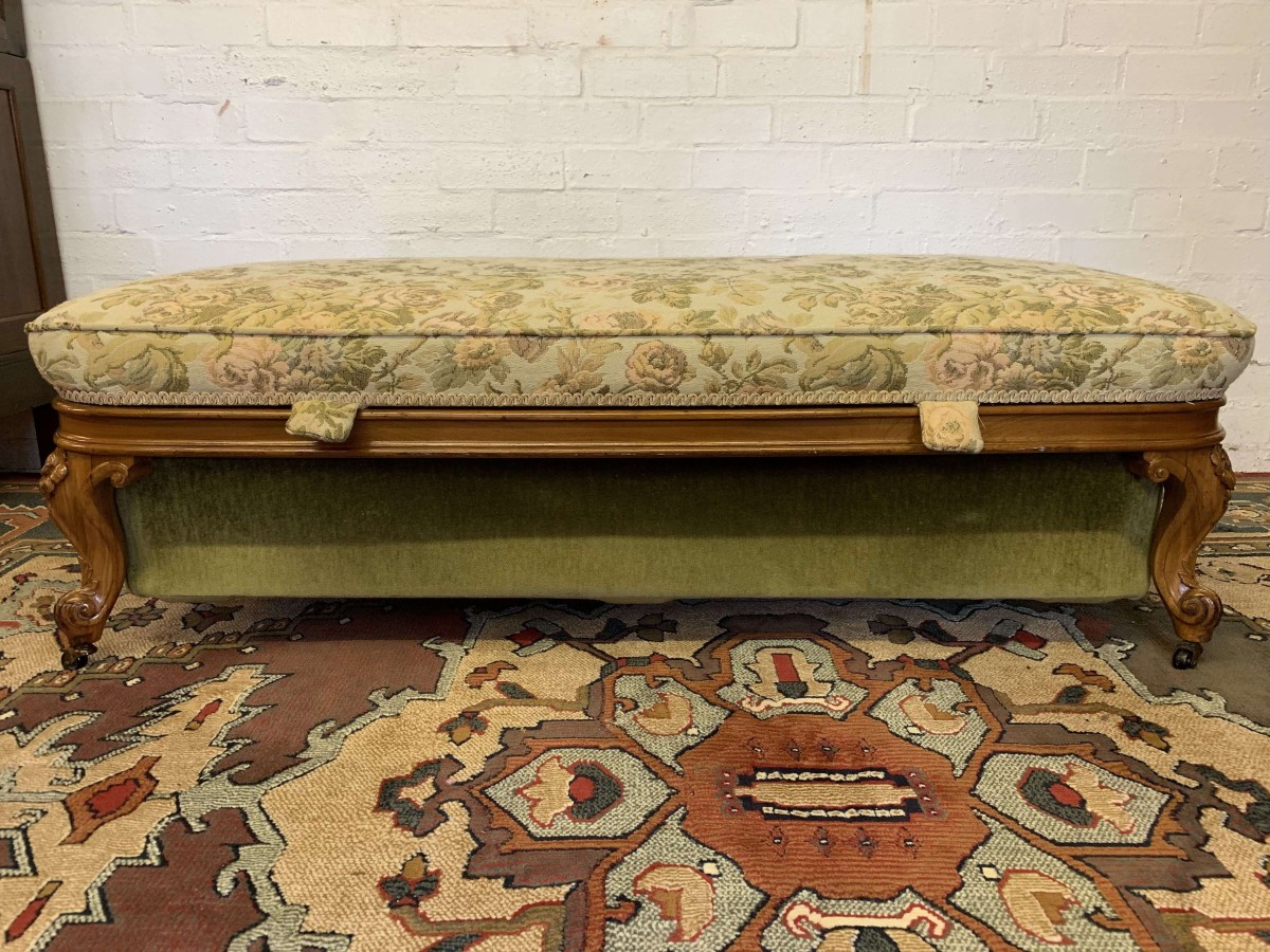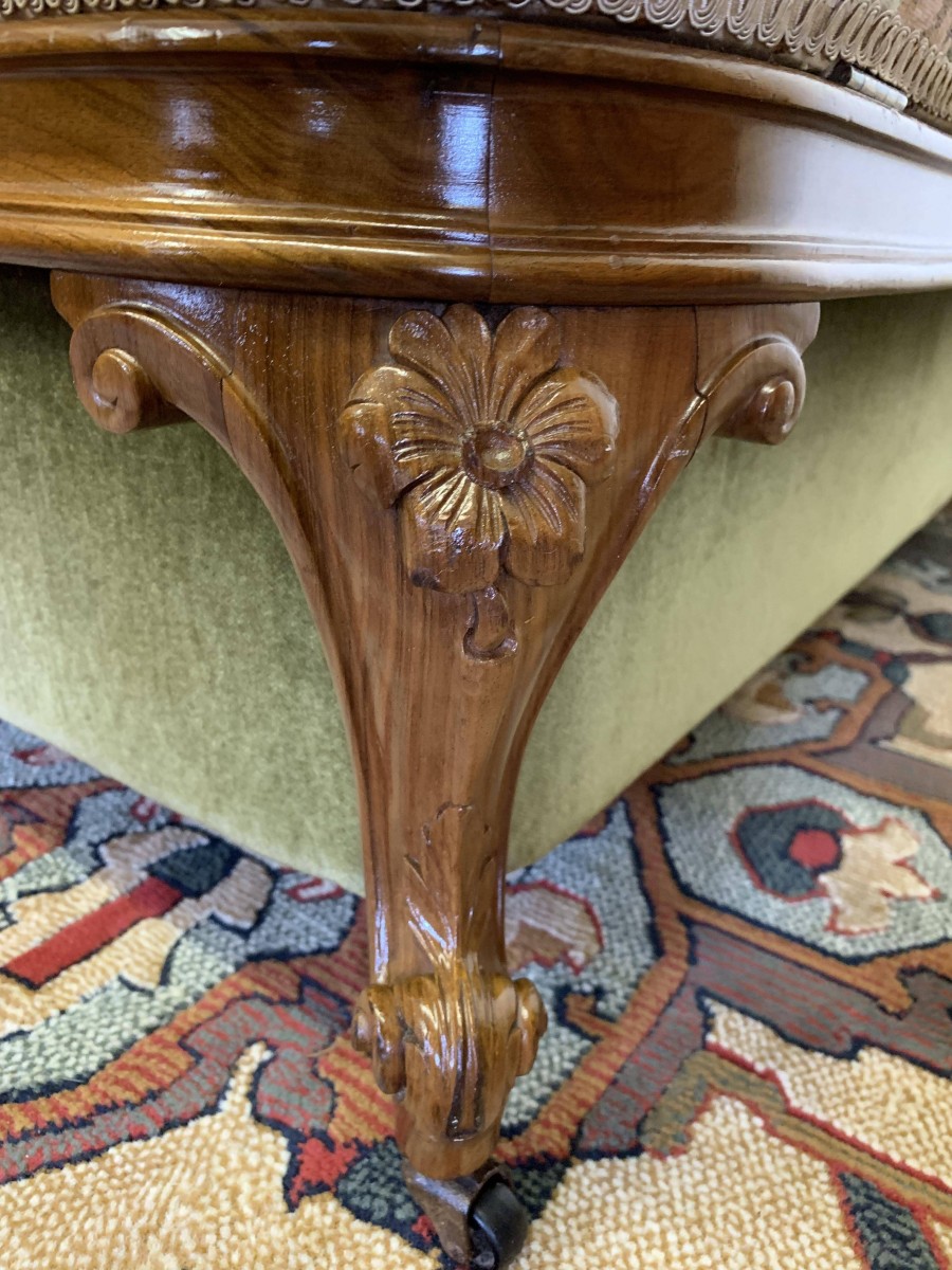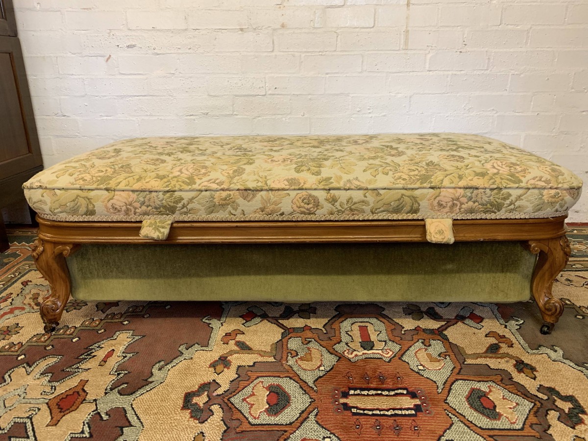 The lift up lid has a cushioned upholstered top. The lid lifts up to offer a generous storage space. The frame of the ottoman is made in walnut and the ottoman sits on four beautiful carved cabriole shaped legs with original casters. An exceptional item of functional furniture.