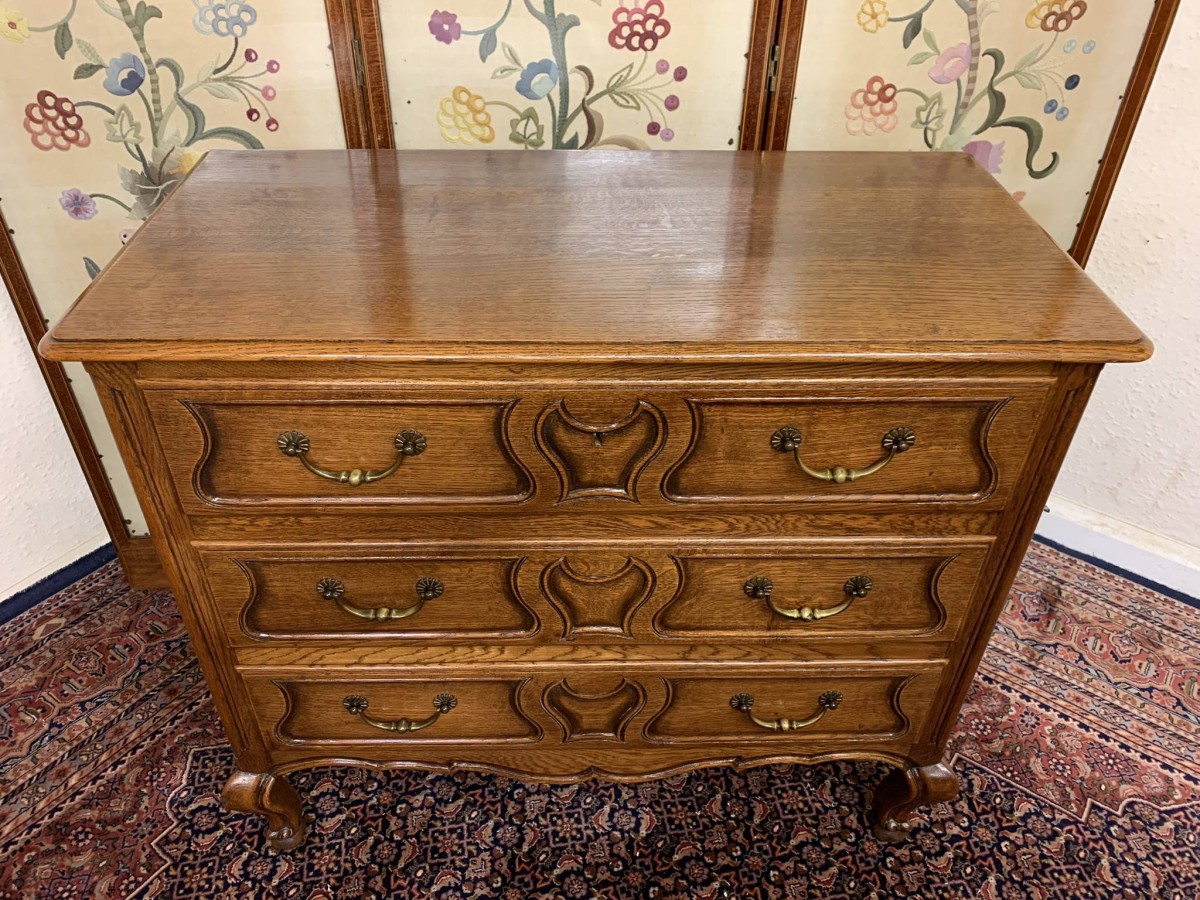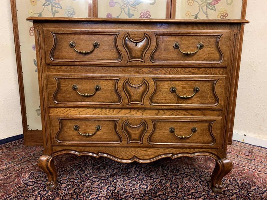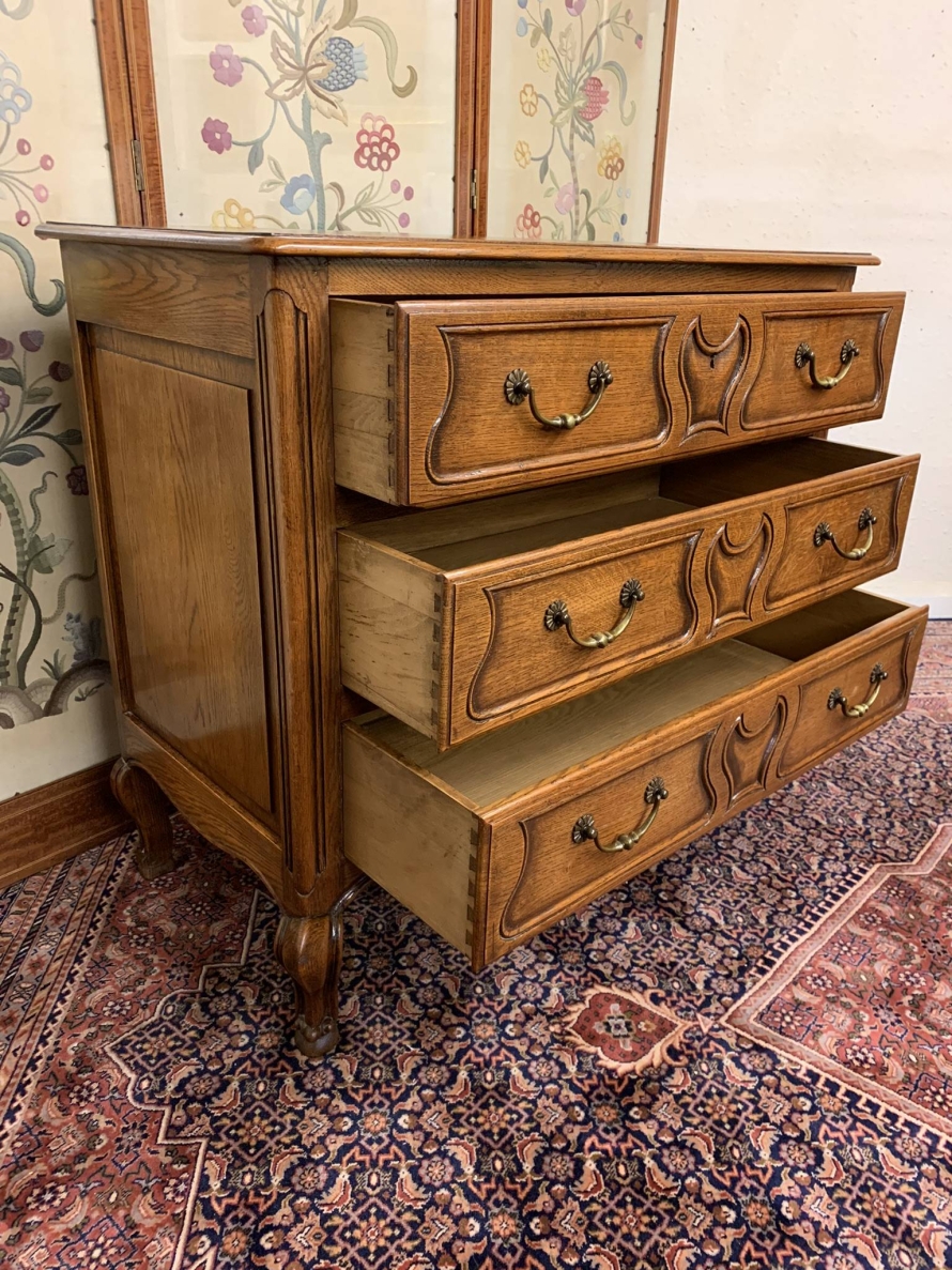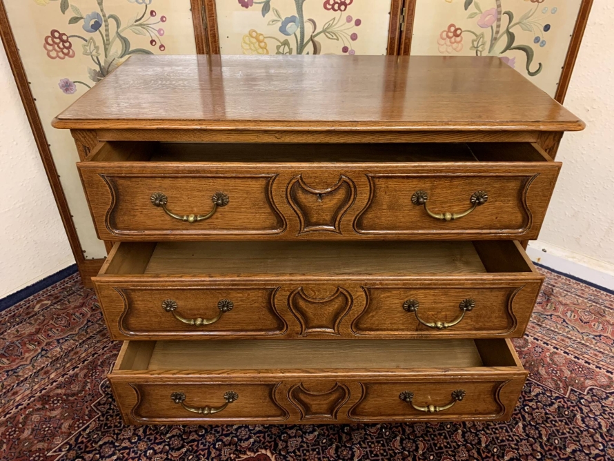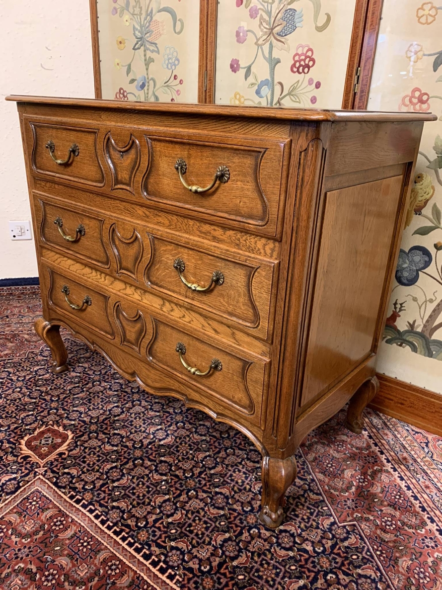 Made entirely in solid oak and in excellent condition the chest dates circa 1920. The oversailing top has rounded corners to the front. Below are three carved drawers, each drawer having a pair of brass handles. Recessed panelled sides, shaped skirt this fabulous chest of drawers stands on four carved cabriole legs.
