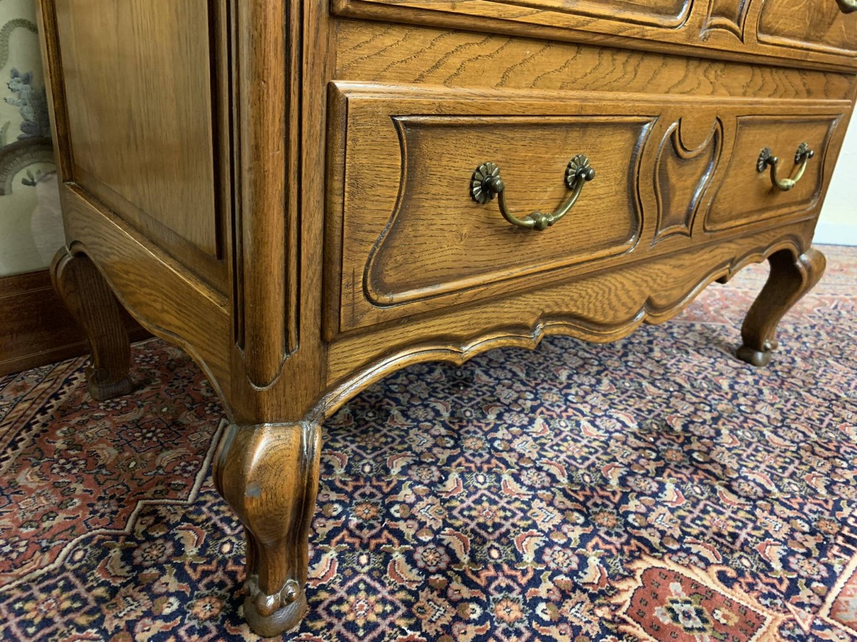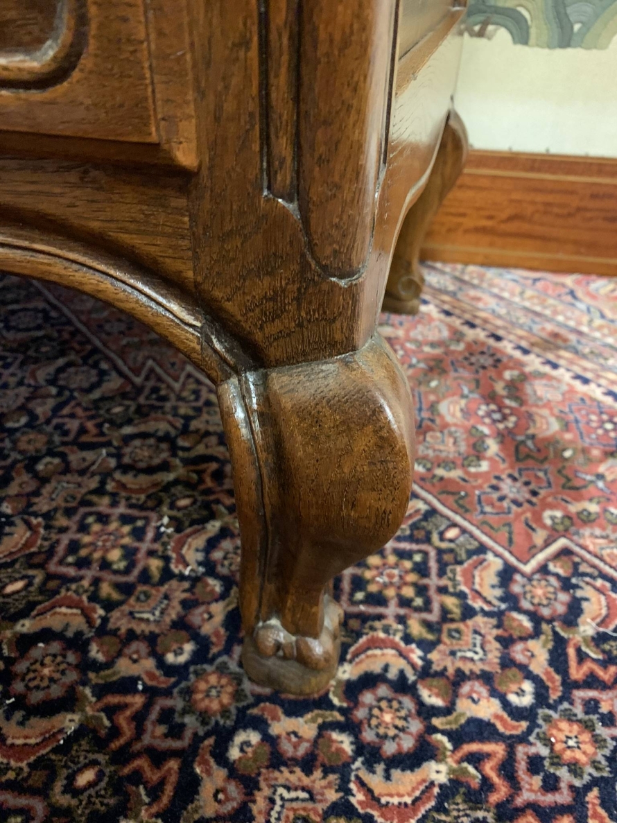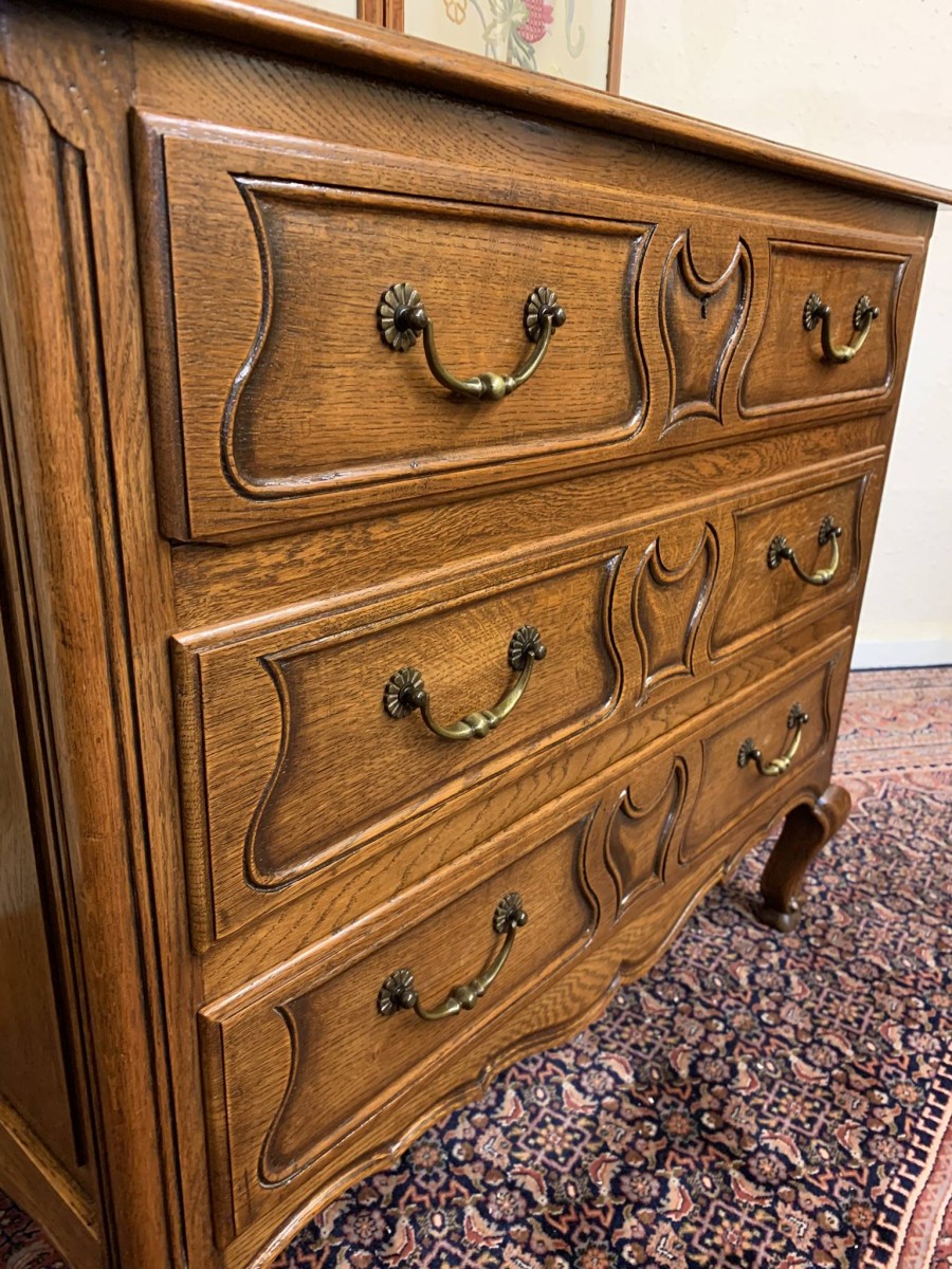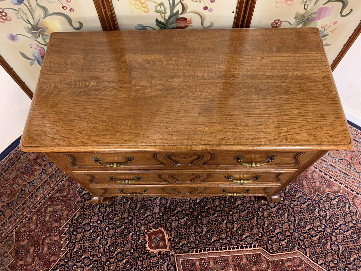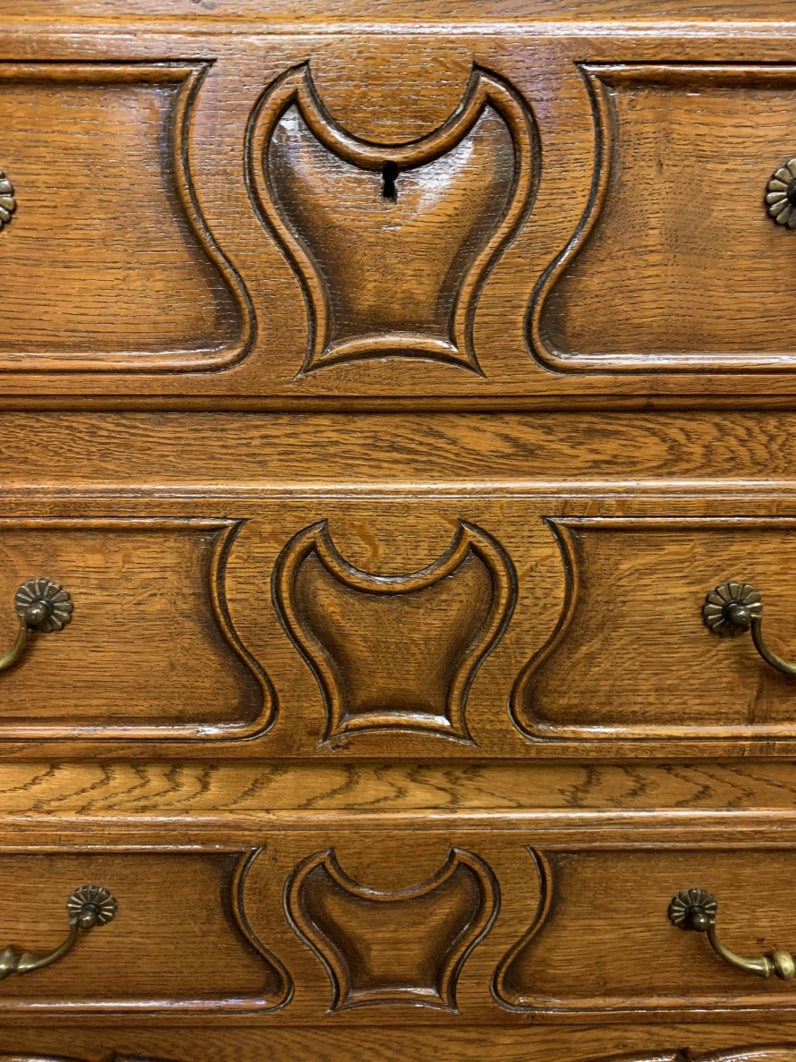 Made entirely in solid oak and in excellent condition the chest dates circa 1920. The oversailing top has rounded corners to the front. Below are three carved drawers, each drawer having a pair of brass handles. Recessed panelled sides, shaped skirt this fabulous chest of drawers stands on four carved cabriole legs.