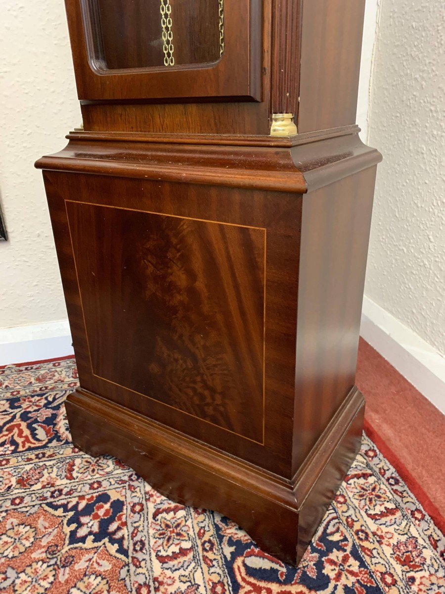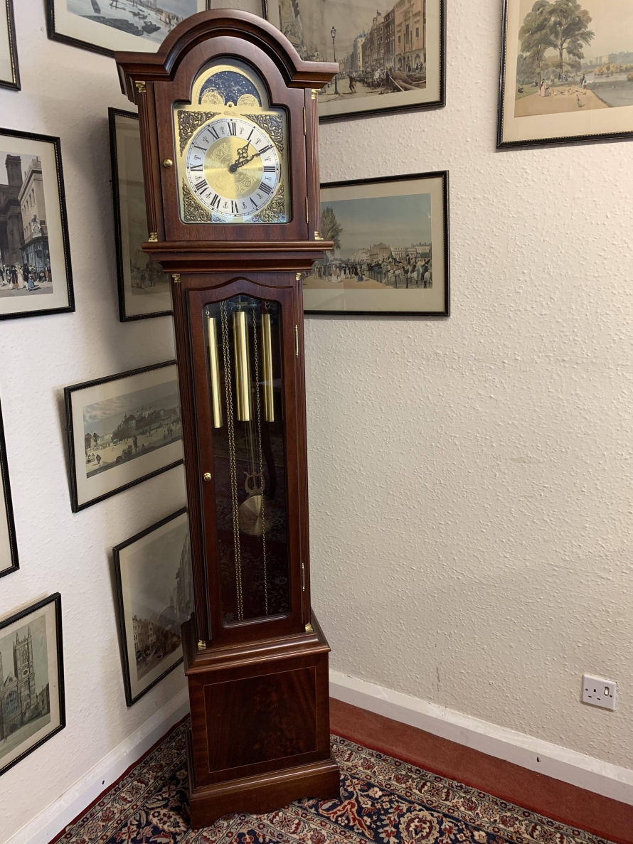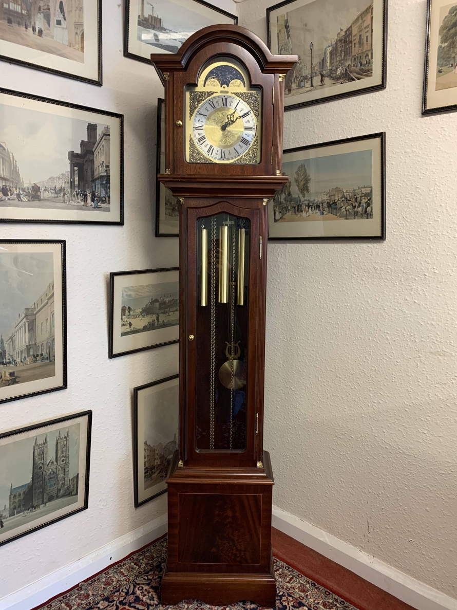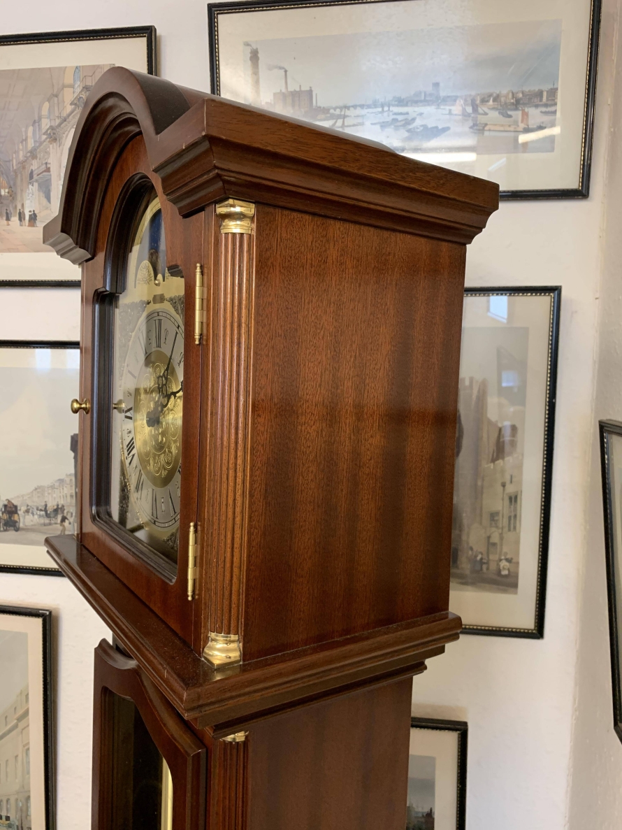 The glazed arched hood has reeded columns with brass mounts. The brass break arch dial has a lovely rolling moon feature to the top. The long glazed door also has reeded column sides with brass mounts. the eight day movement is driven by three brass weights on chains. The clock has a triple chime movement, Westminster, Whittington and St Michael. The clarity of the chime is crystal clear. There is aslo a scilent chime feature. The clock has an attractive brass lyra pendulum. Inlaid panel beneath the door, the clock has a shaped bracket plinth.