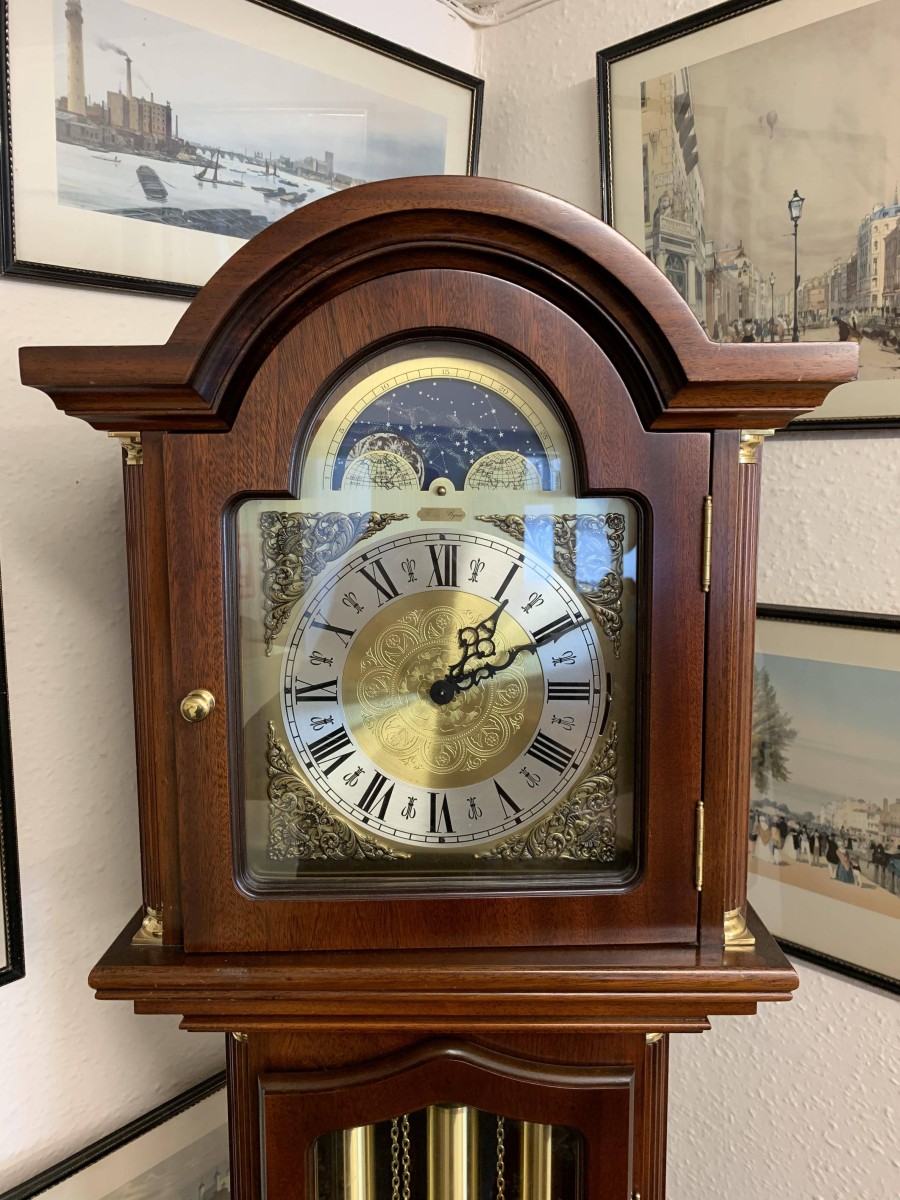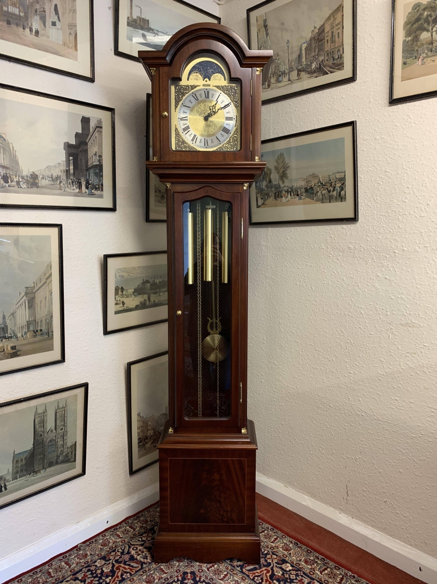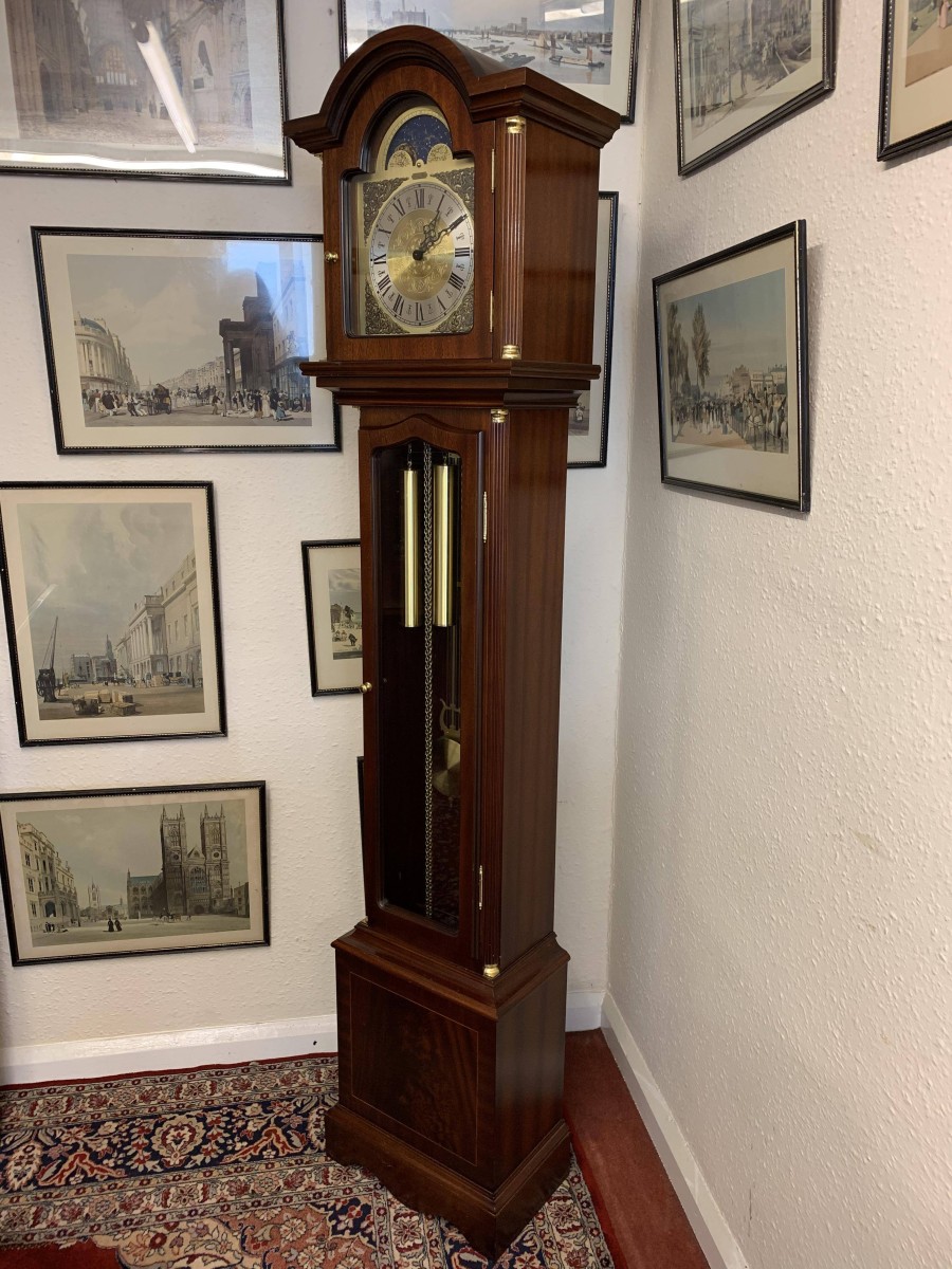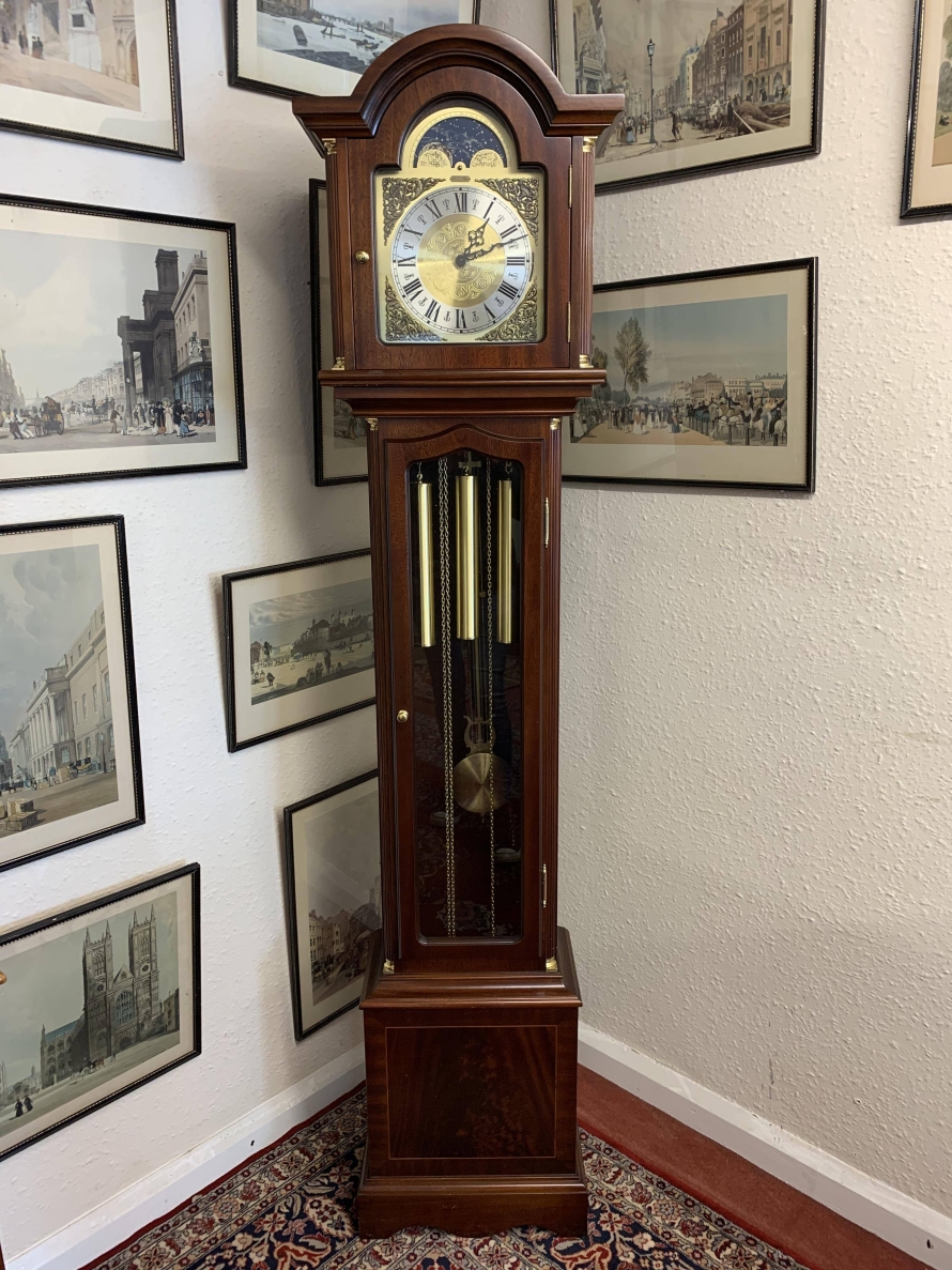 The glazed arched hood has reeded columns with brass mounts. The brass break arch dial has a lovely rolling moon feature to the top. The long glazed door also has reeded column sides with brass mounts. the eight day movement is driven by three brass weights on chains. The clock has a triple chime movement, Westminster, Whittington and St Michael. The clarity of the chime is crystal clear. There is aslo a scilent chime feature. The clock has an attractive brass lyra pendulum. Inlaid panel beneath the door, the clock has a shaped bracket plinth.