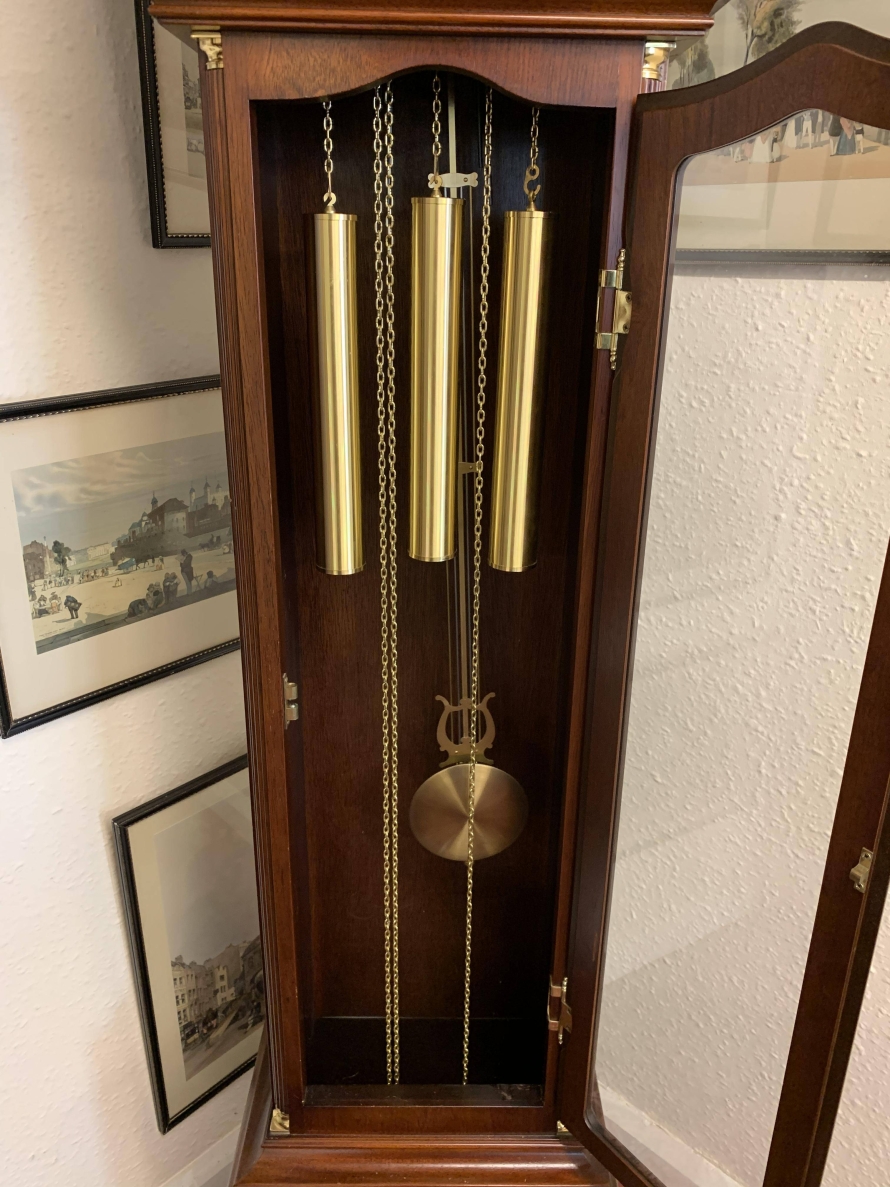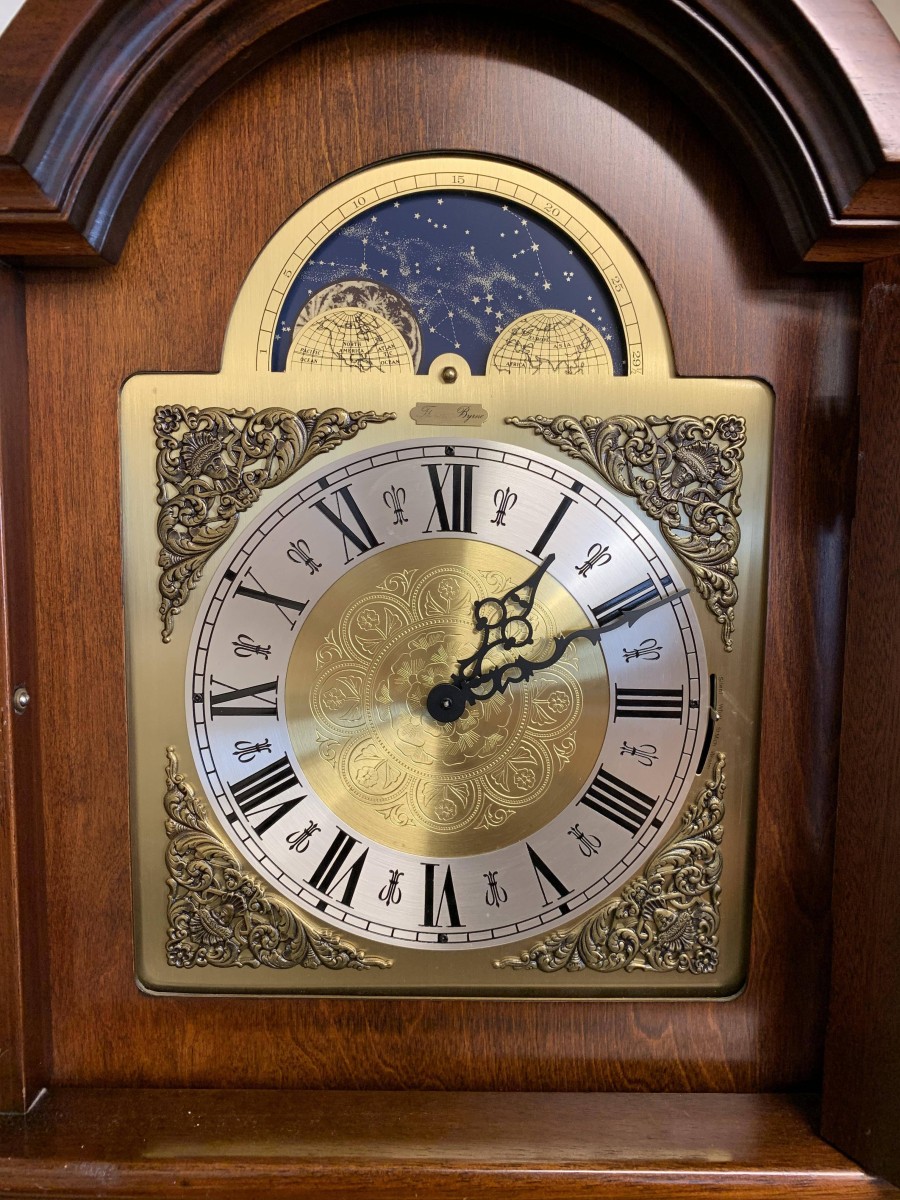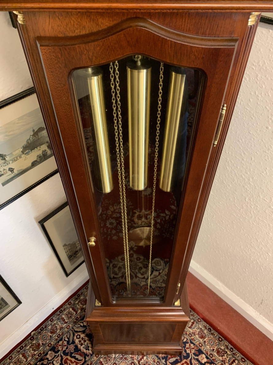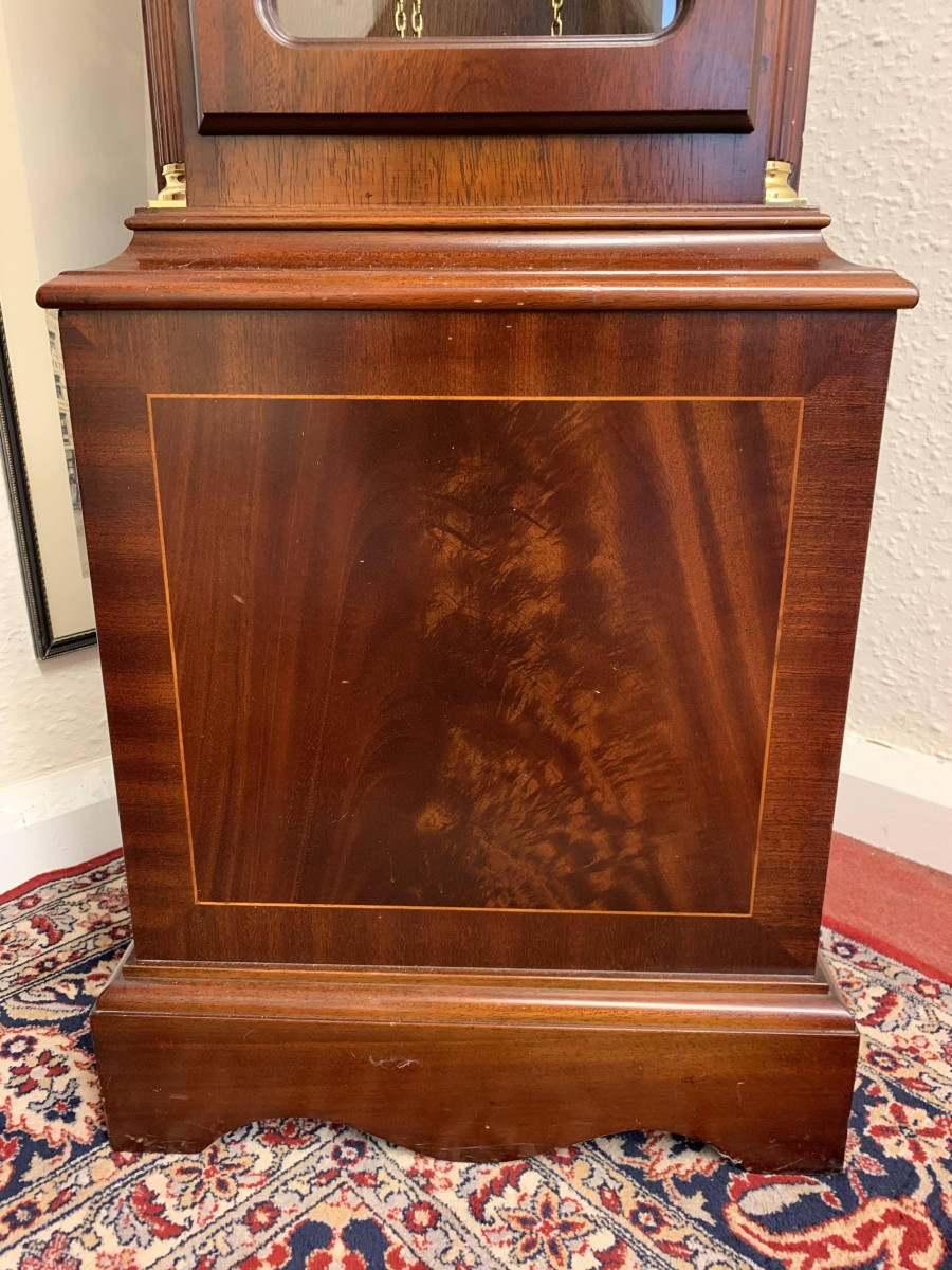 The glazed arched hood has reeded columns with brass mounts. The brass break arch dial has a lovely rolling moon feature to the top. The long glazed door also has reeded column sides with brass mounts. the eight day movement is driven by three brass weights on chains. The clock has a triple chime movement, Westminster, Whittington and St Michael. The clarity of the chime is crystal clear. There is aslo a scilent chime feature. The clock has an attractive brass lyra pendulum. Inlaid panel beneath the door, the clock has a shaped bracket plinth.