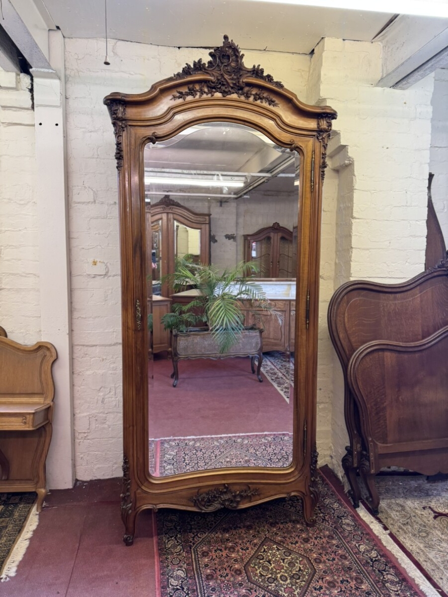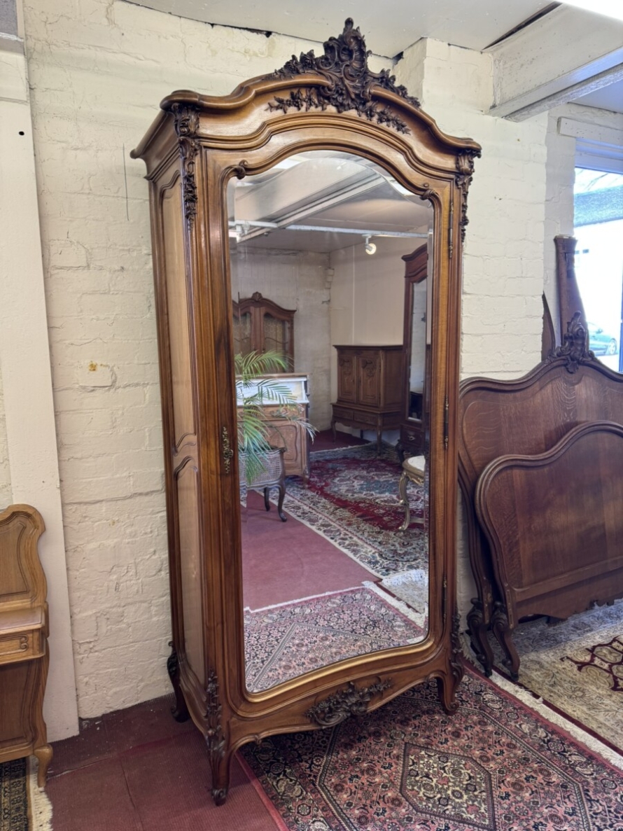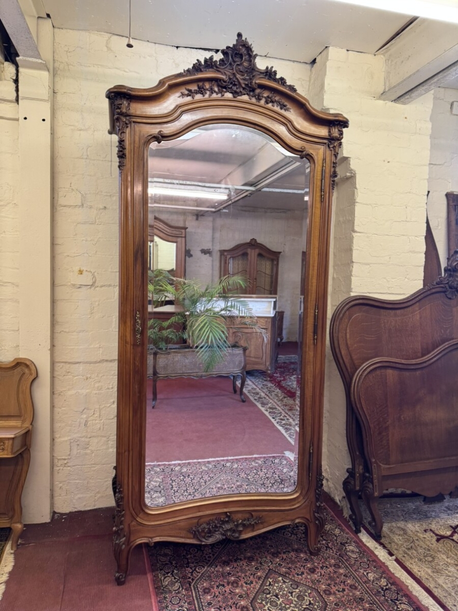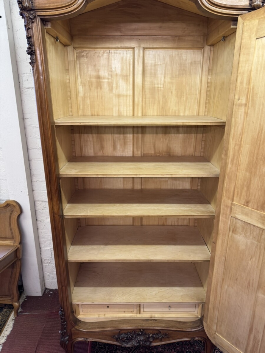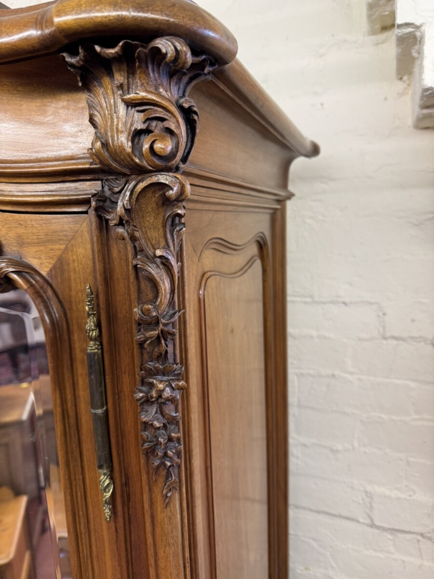 This stunning French armoire dates circa 1880 and is of the highest quality. The shaped oversailing top has wonderful life like carving, as does the entire armoire. The bevel edged shaped full length mirror door has ornate brass hinges and escutcheon. The door opens to reveal an outstanding maple interior consisting of four adjustable and removable shelves with two lockable drawers below. Shaped recessed panelled sides, shaped skirt with central carving and standing on four elegant carved cabriole shaped legs. Please note this armoire completely splits down for easy transportation and delivery into any home.