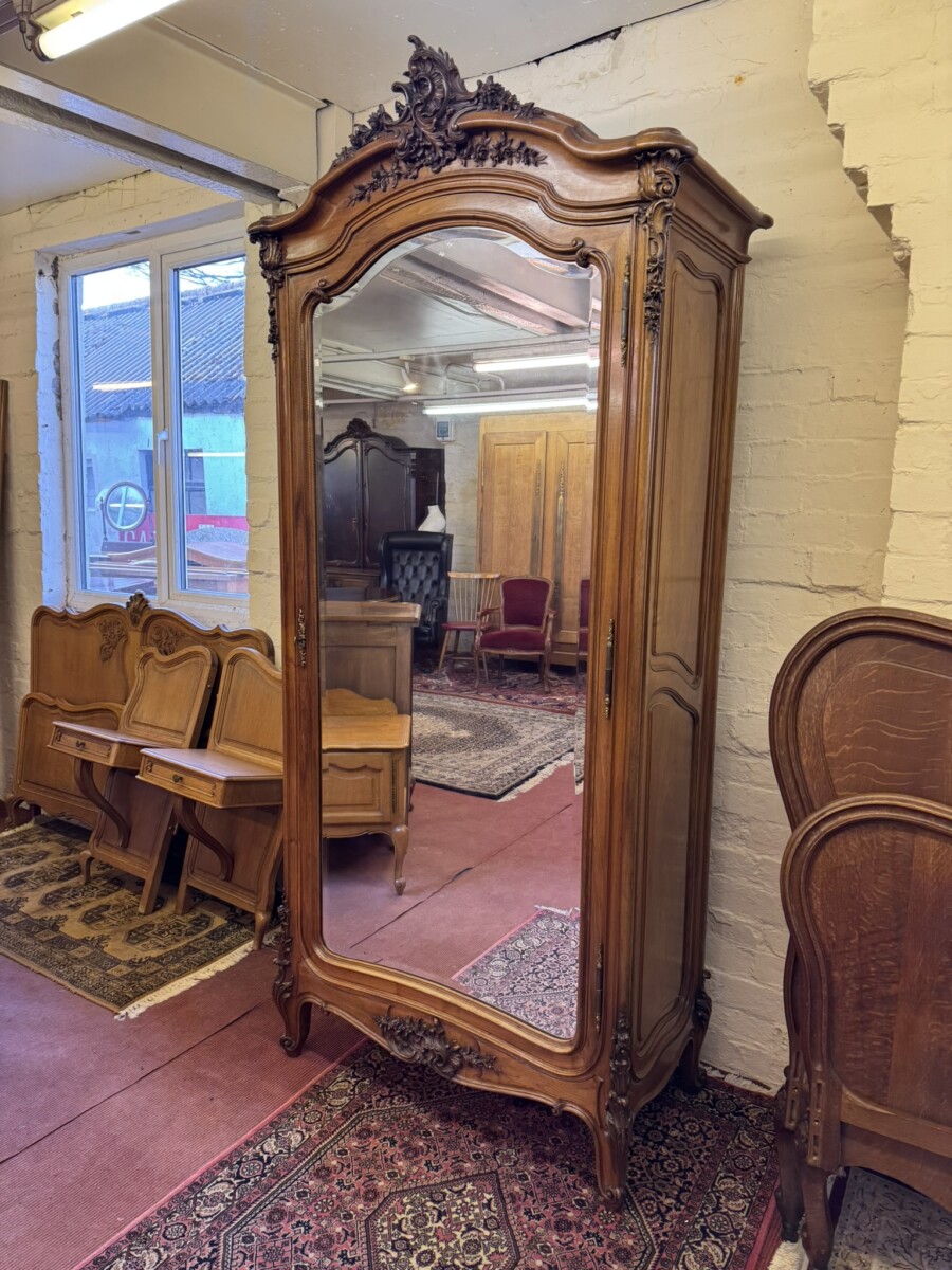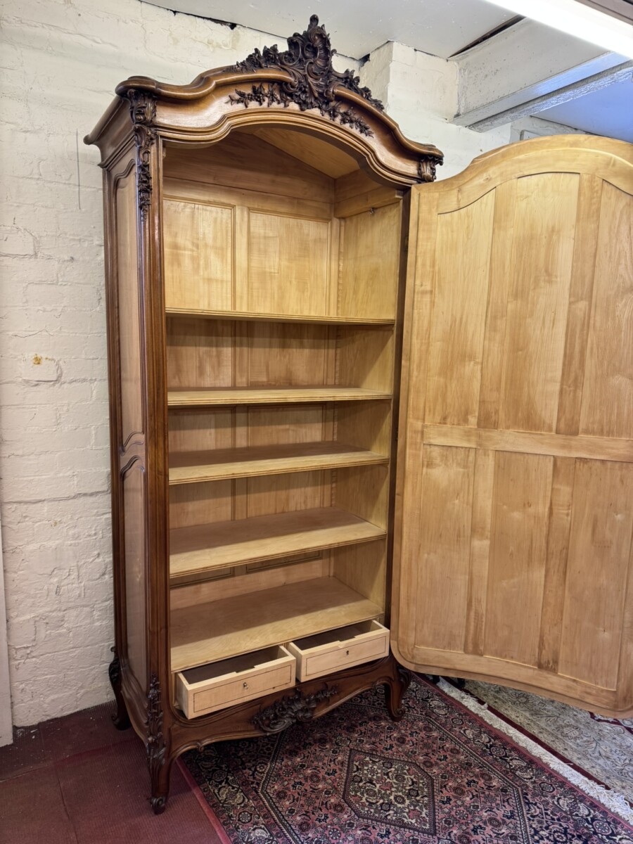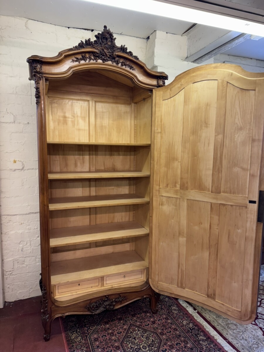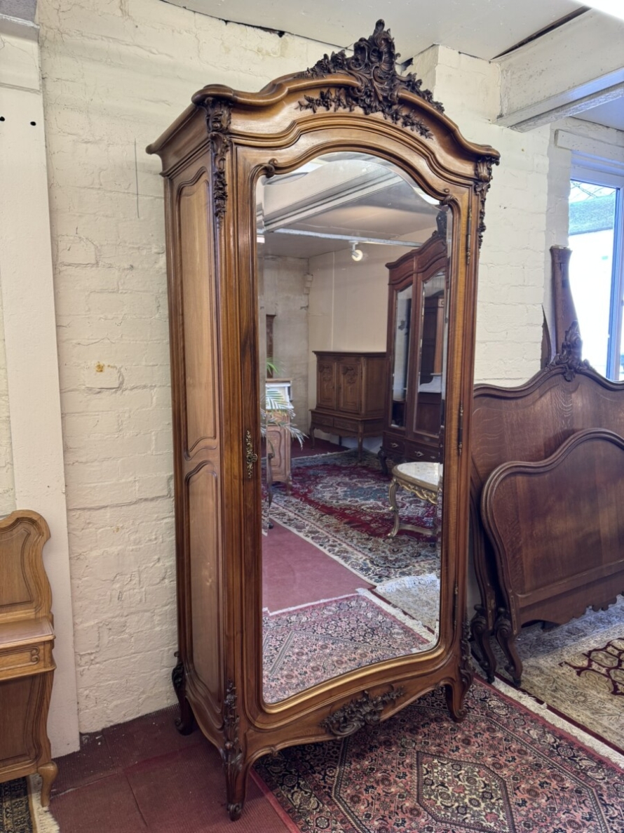 This stunning French armoire dates circa 1880 and is of the highest quality. The shaped oversailing top has wonderful life like carving, as does the entire armoire. The bevel edged shaped full length mirror door has ornate brass hinges and escutcheon. The door opens to reveal an outstanding maple interior consisting of four adjustable and removable shelves with two lockable drawers below. Shaped recessed panelled sides, shaped skirt with central carving and standing on four elegant carved cabriole shaped legs. Please note this armoire completely splits down for easy transportation and delivery into any home.