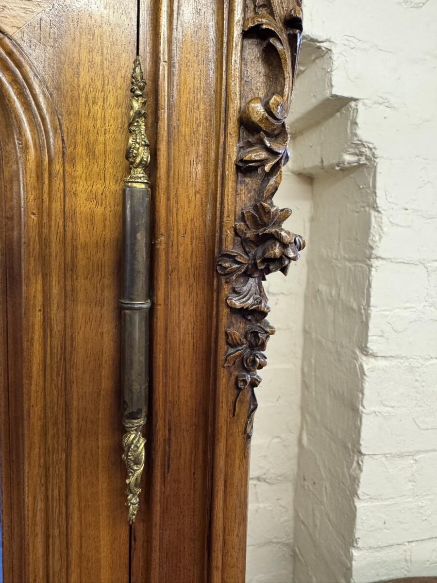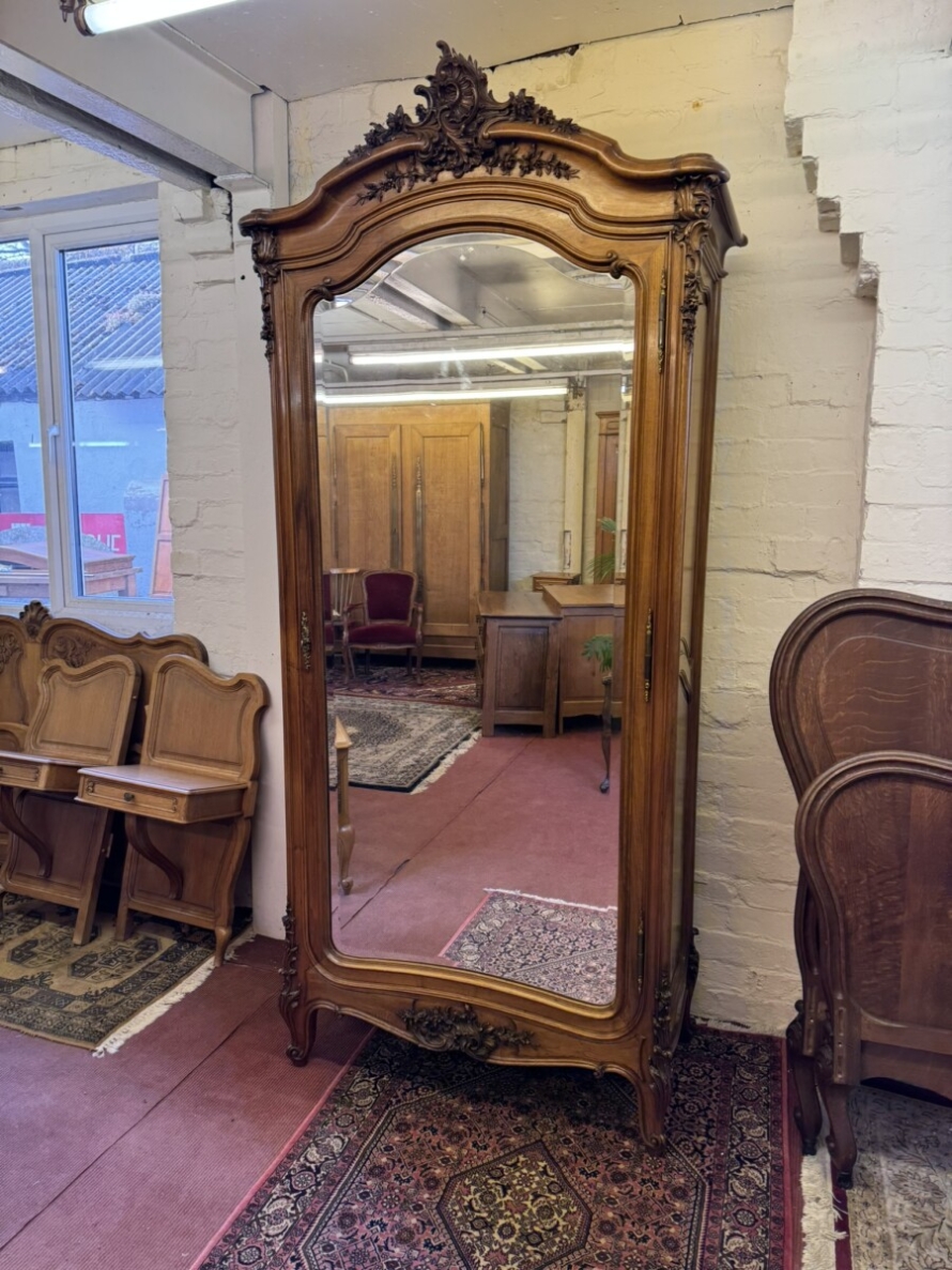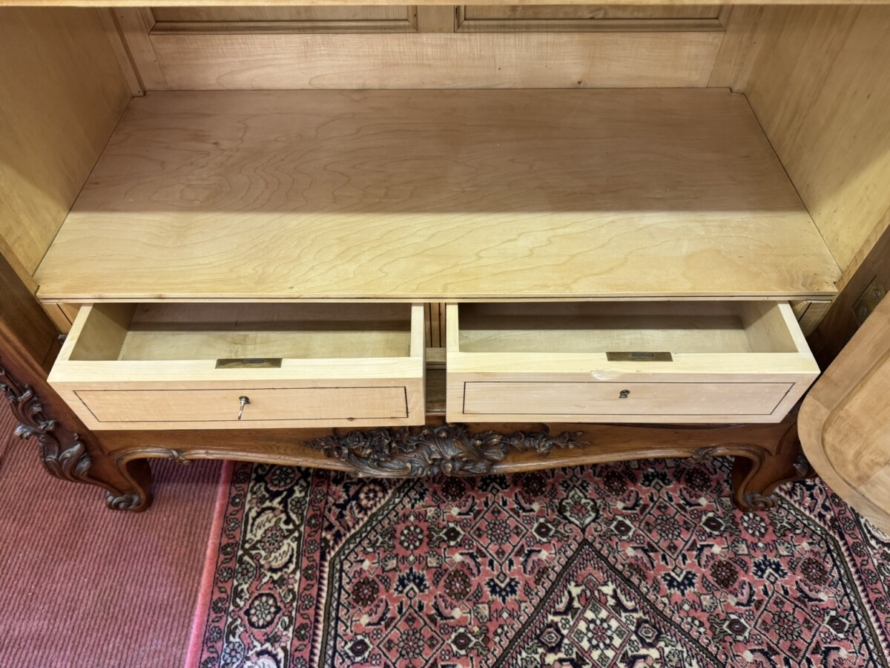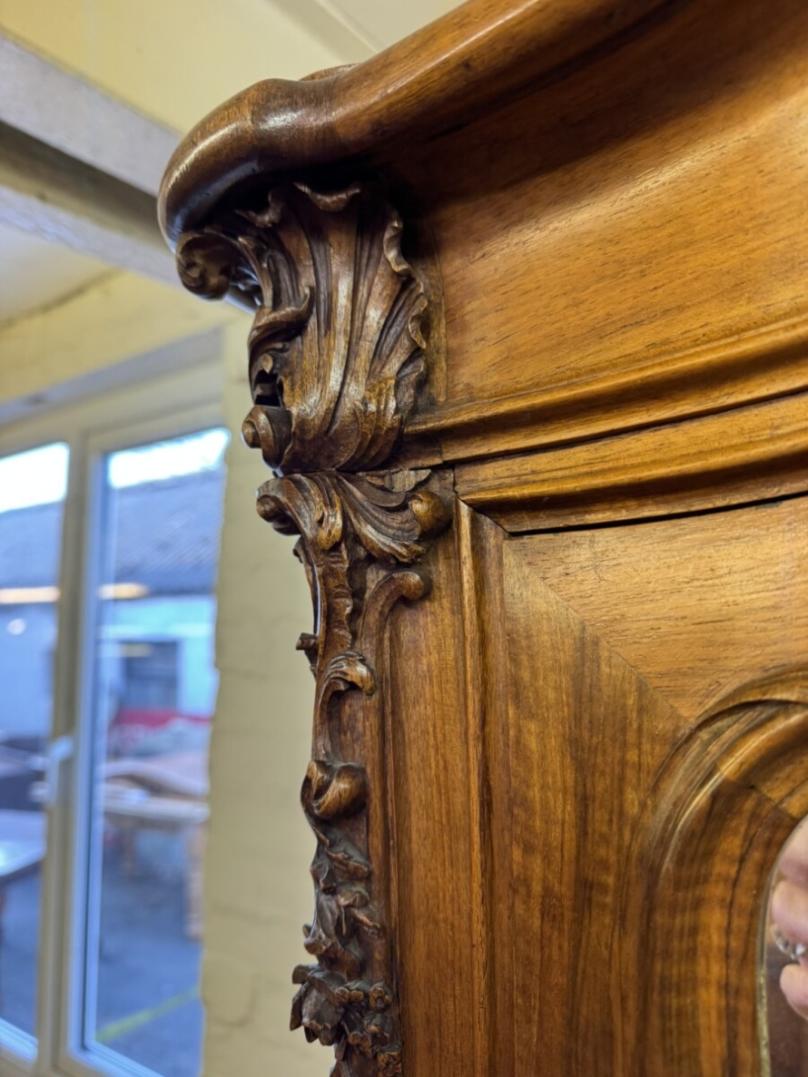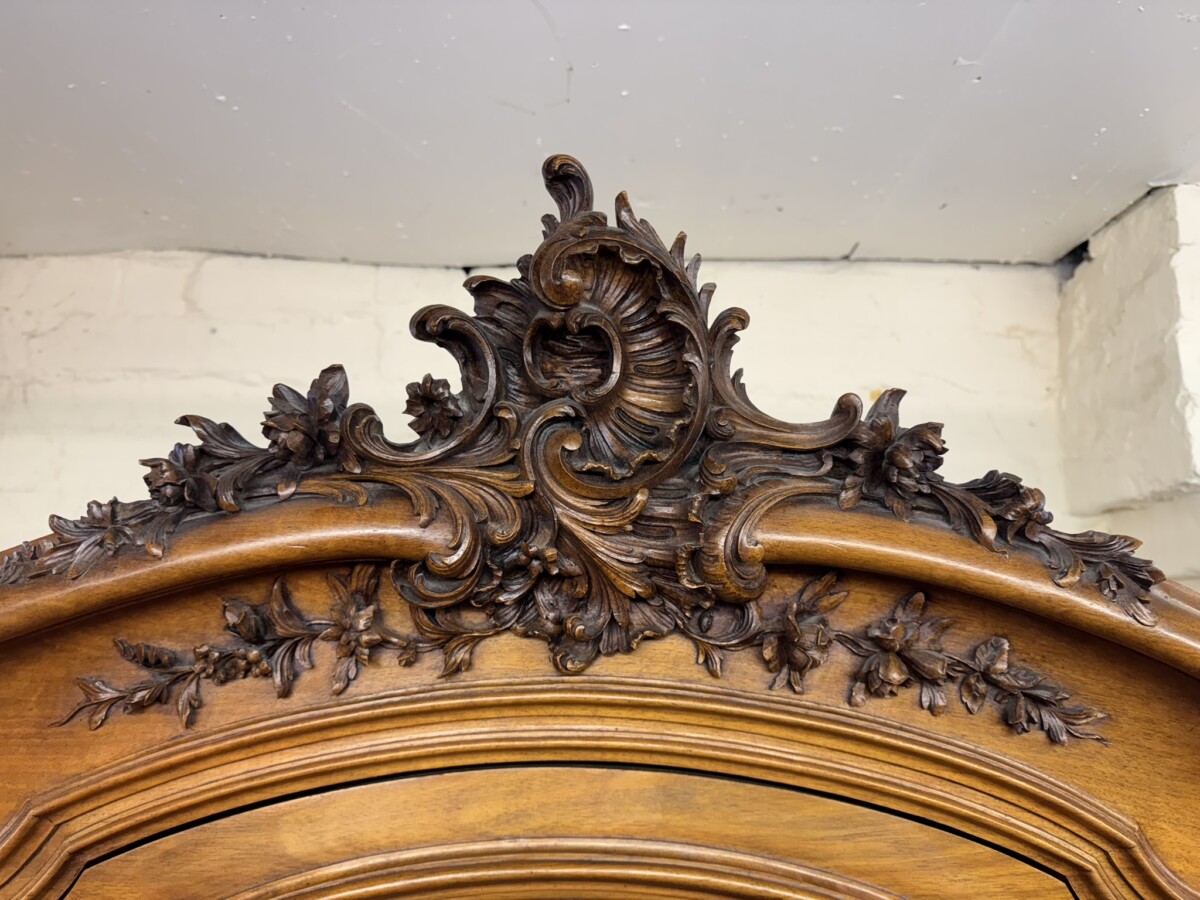 This stunning French armoire dates circa 1880 and is of the highest quality. The shaped oversailing top has wonderful life like carving, as does the entire armoire. The bevel edged shaped full length mirror door has ornate brass hinges and escutcheon. The door opens to reveal an outstanding maple interior consisting of four adjustable and removable shelves with two lockable drawers below. Shaped recessed panelled sides, shaped skirt with central carving and standing on four elegant carved cabriole shaped legs. Please note this armoire completely splits down for easy transportation and delivery into any home.