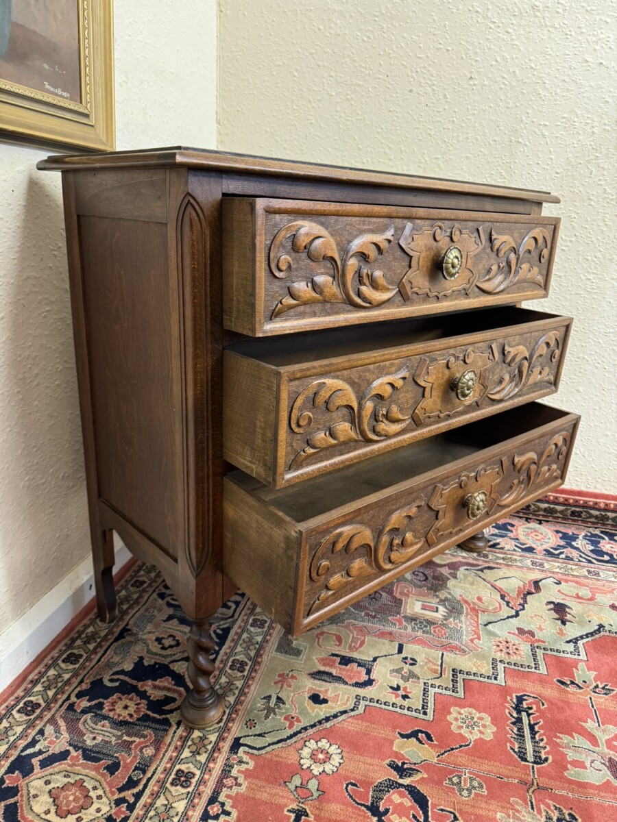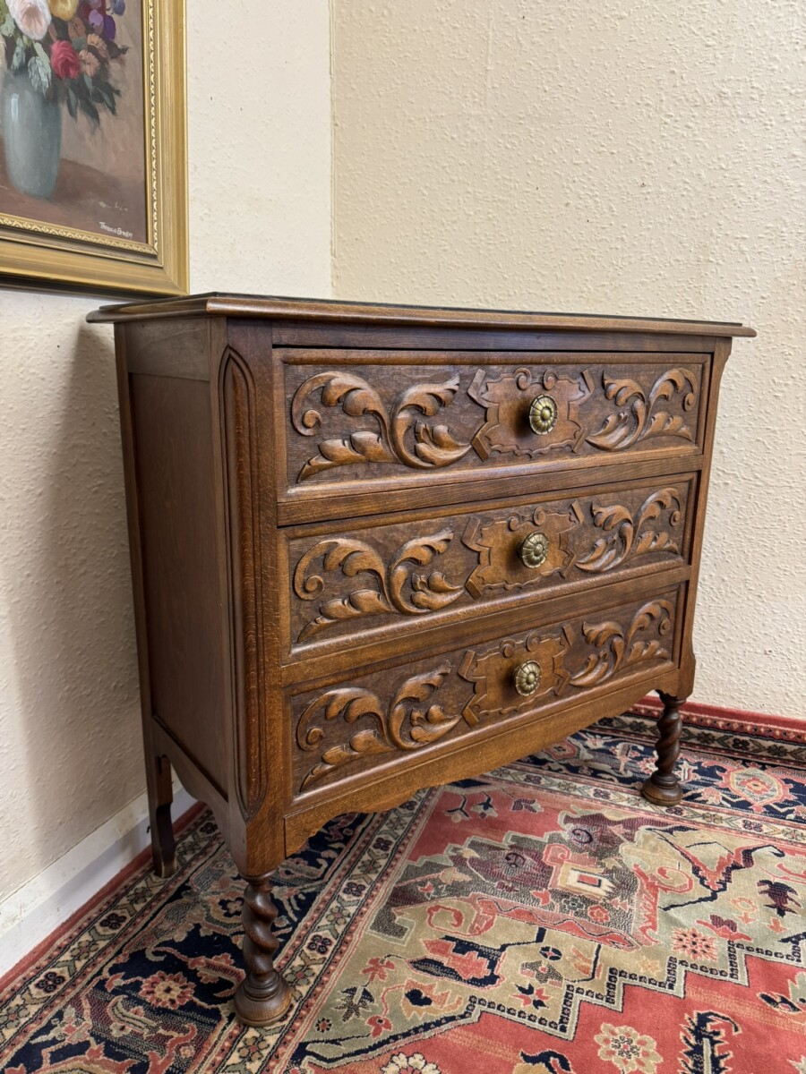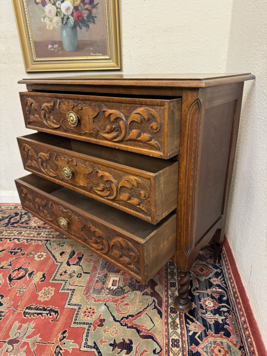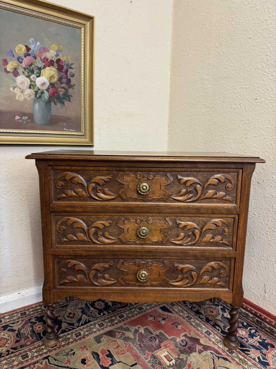 The over sailing top sits above three carved drawers, each drawer having a decorative brass handle. Recessed panelled sides and standing on two barley twist legs to the front with turned feet.