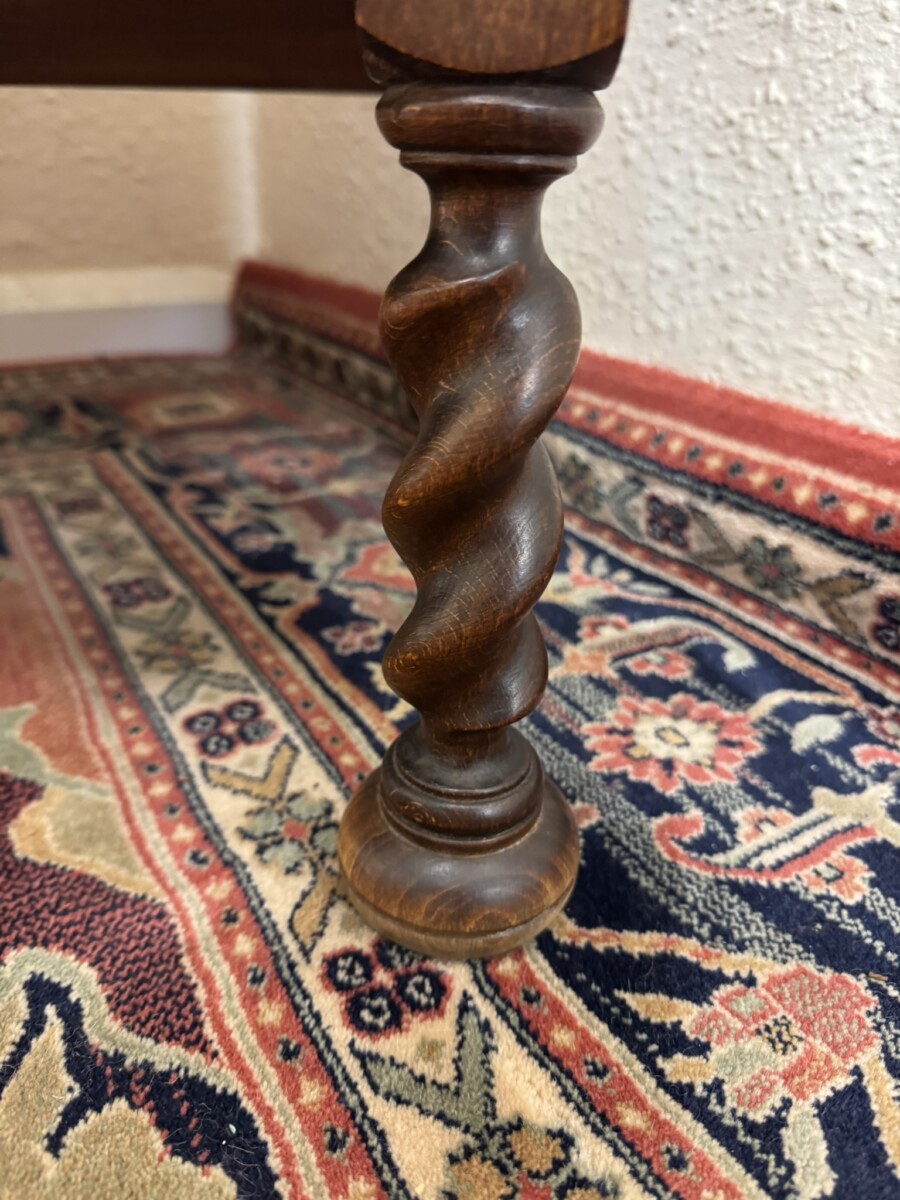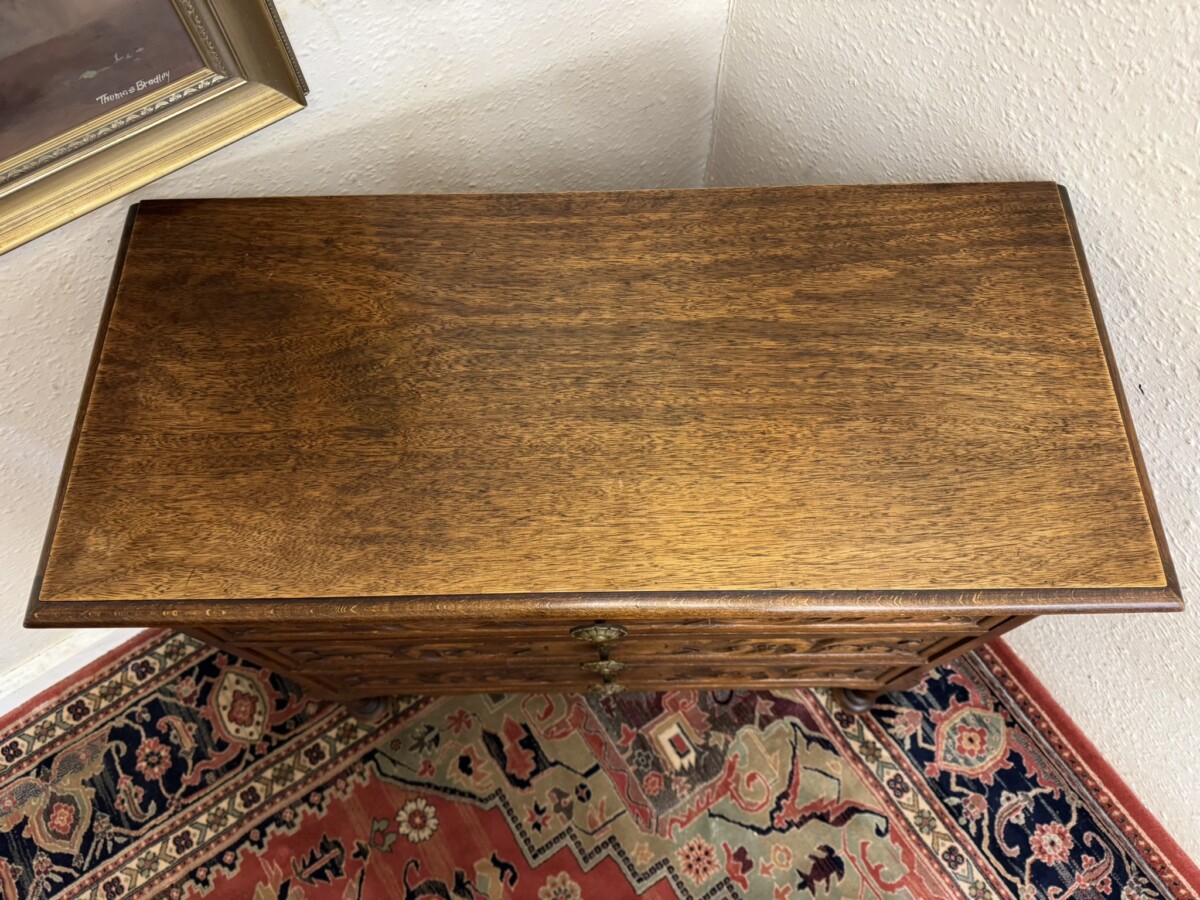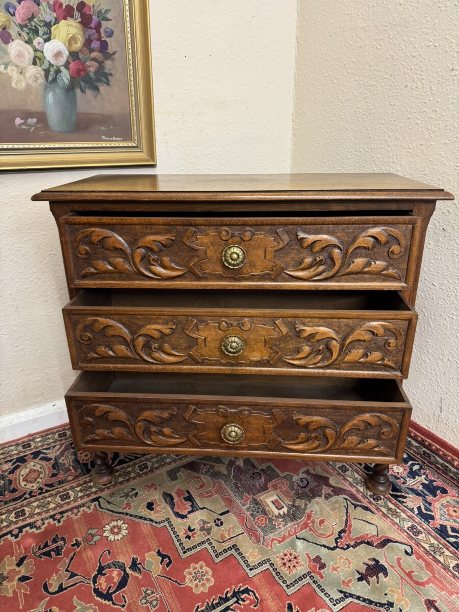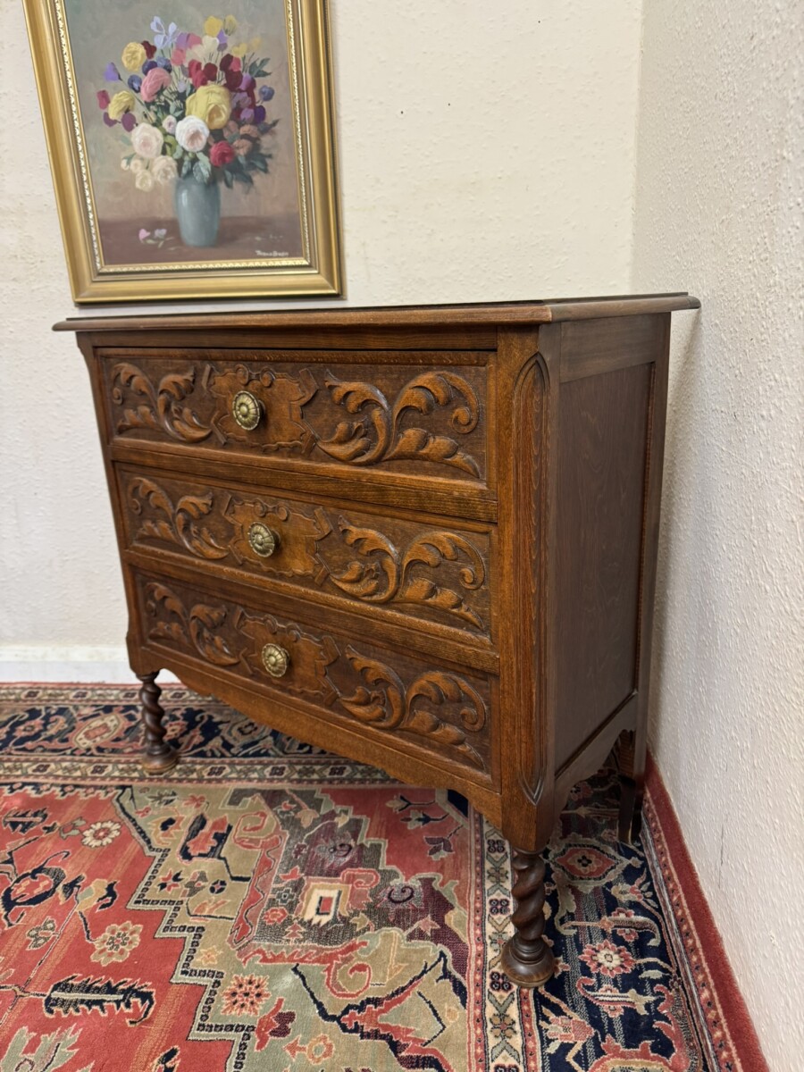 The over sailing top sits above three carved drawers, each drawer having a decorative brass handle. Recessed panelled sides and standing on two barley twist legs to the front with turned feet.