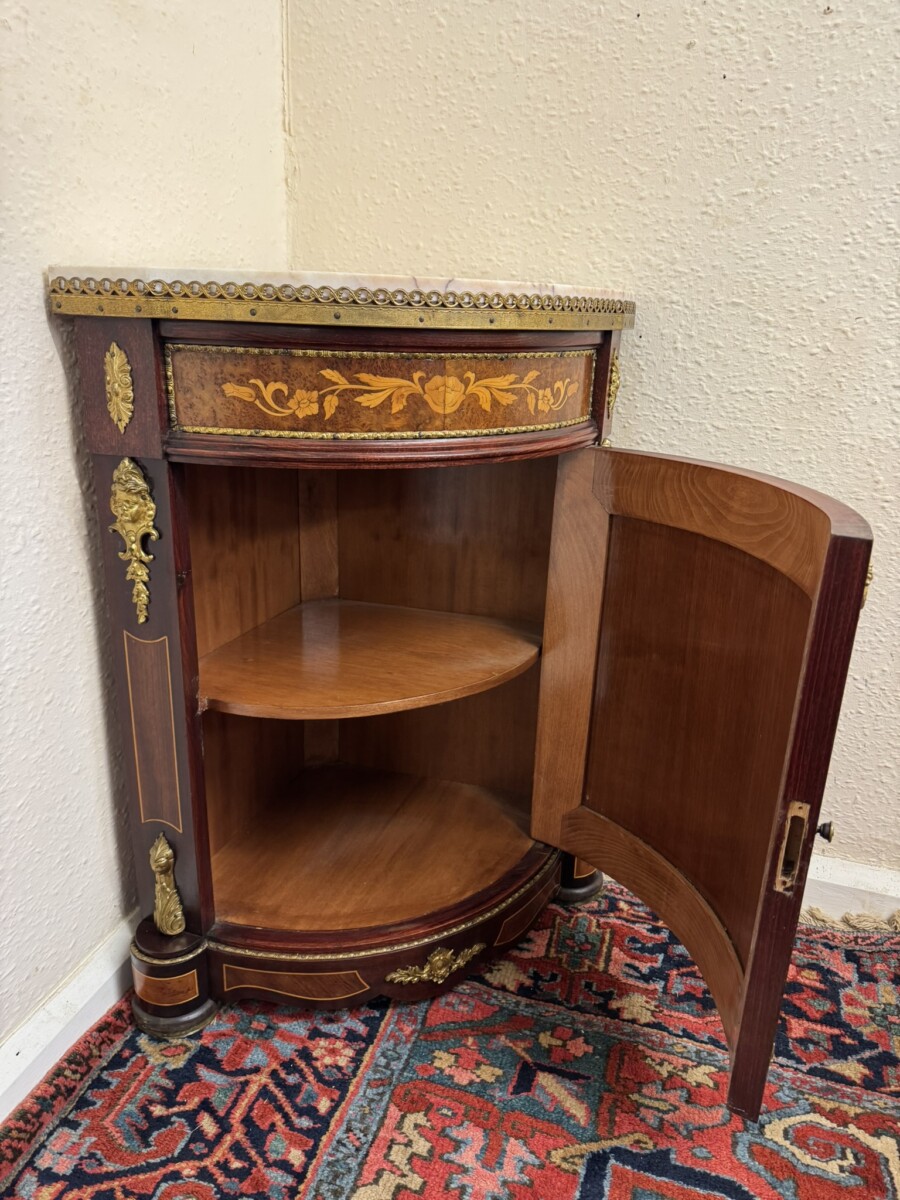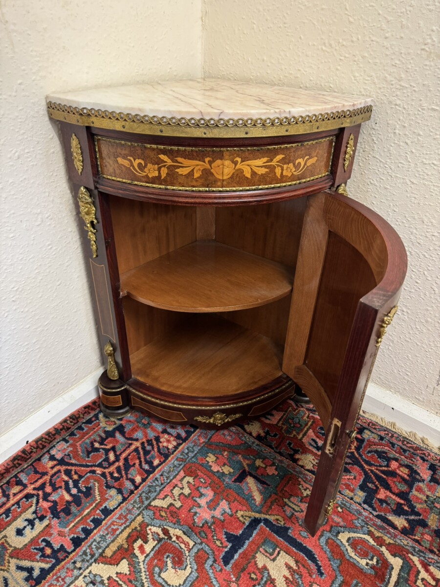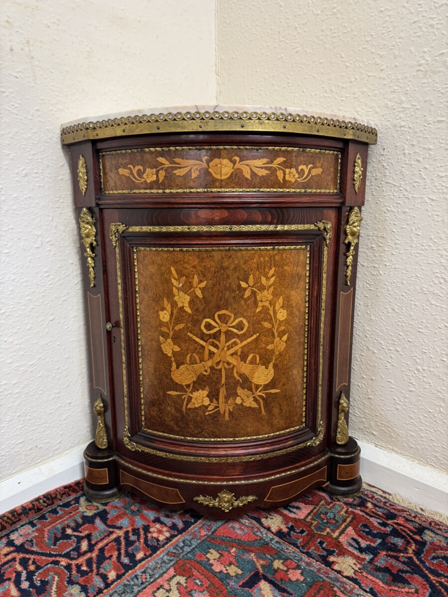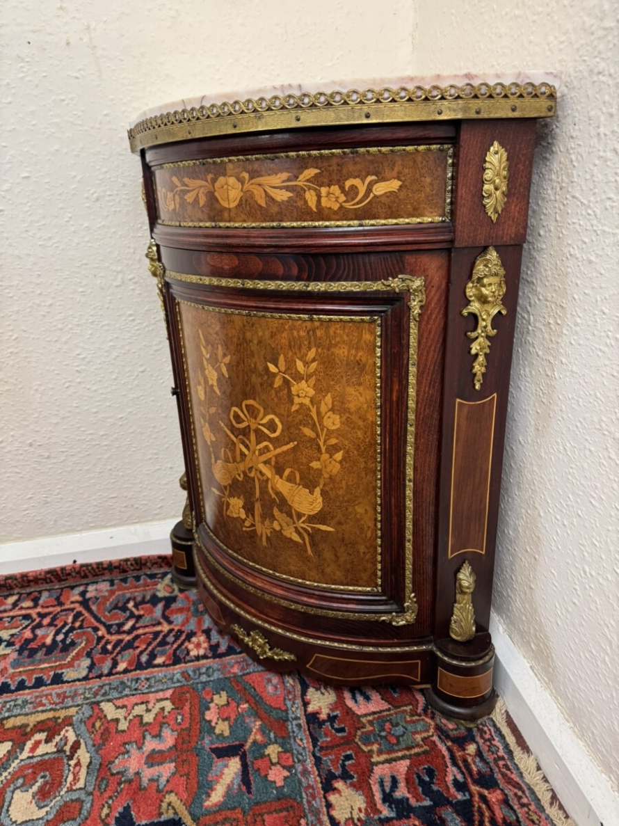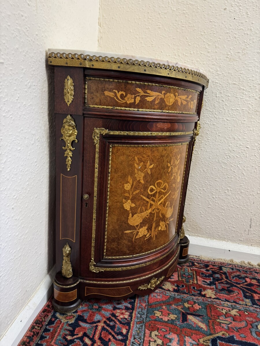 Shaped marble top gilt brass decoration throughout, shaped marquetry inlaid door, gilt mounts and turned feet.