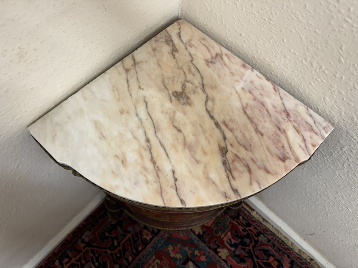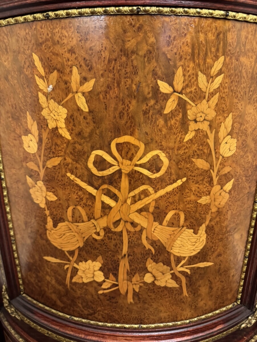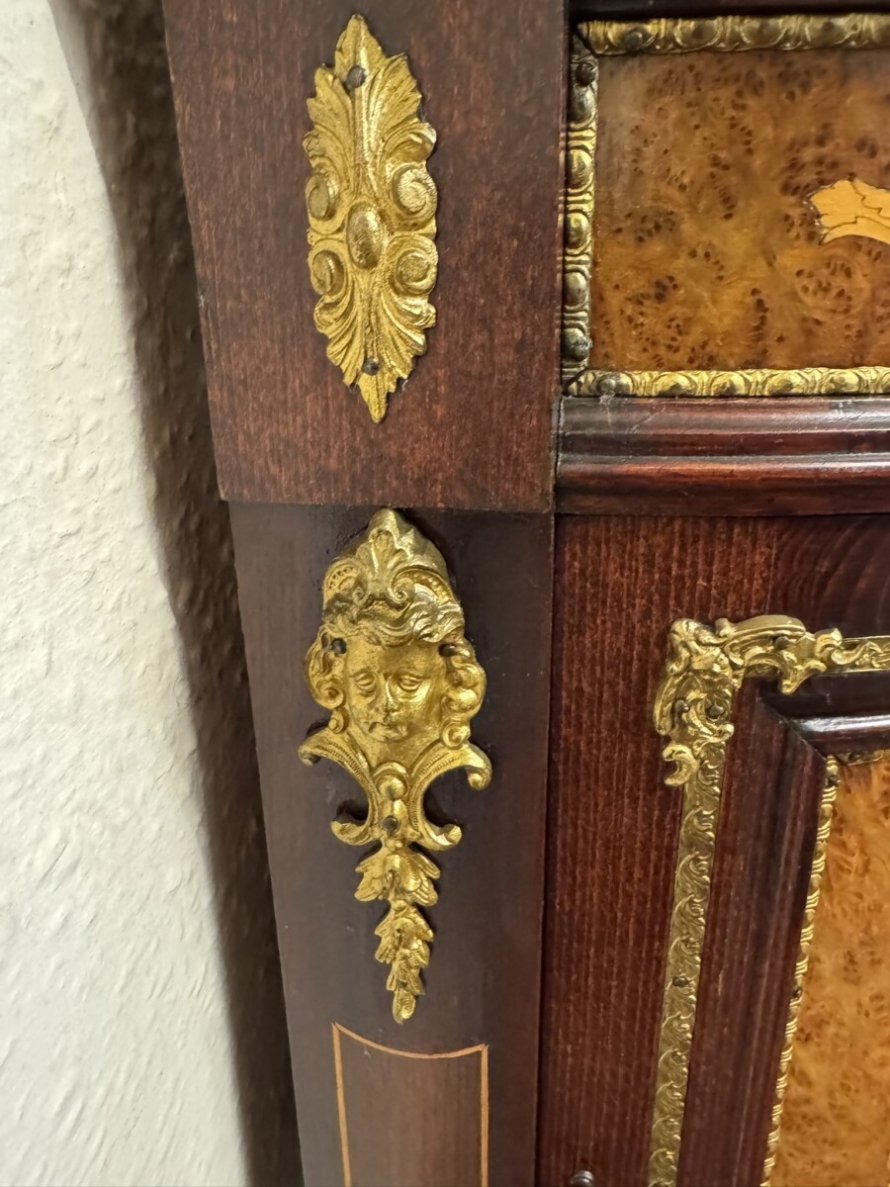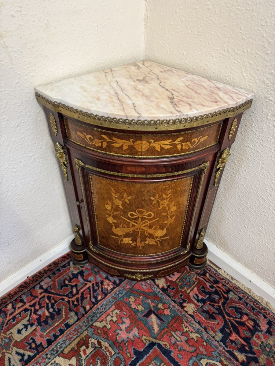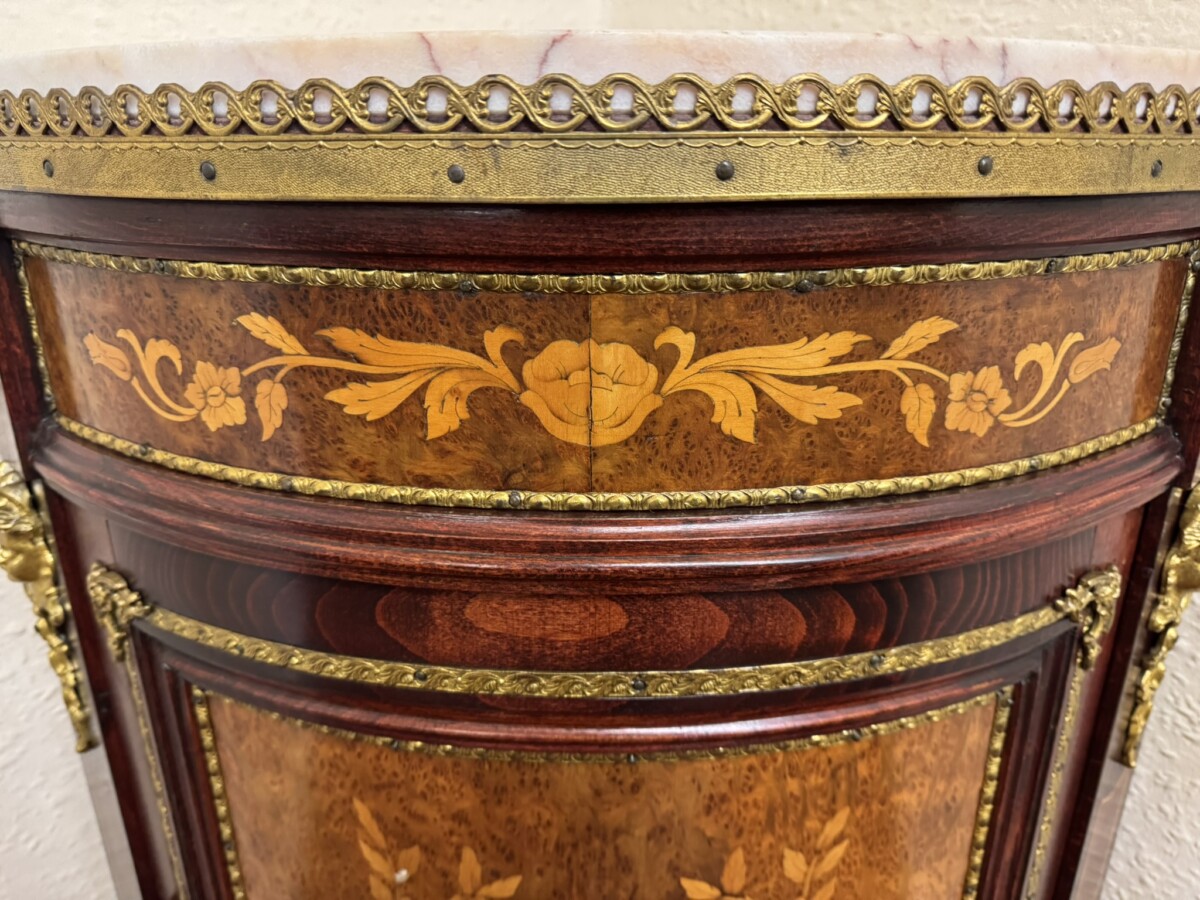 Shaped marble top gilt brass decoration throughout, shaped marquetry inlaid door, gilt mounts and turned feet.