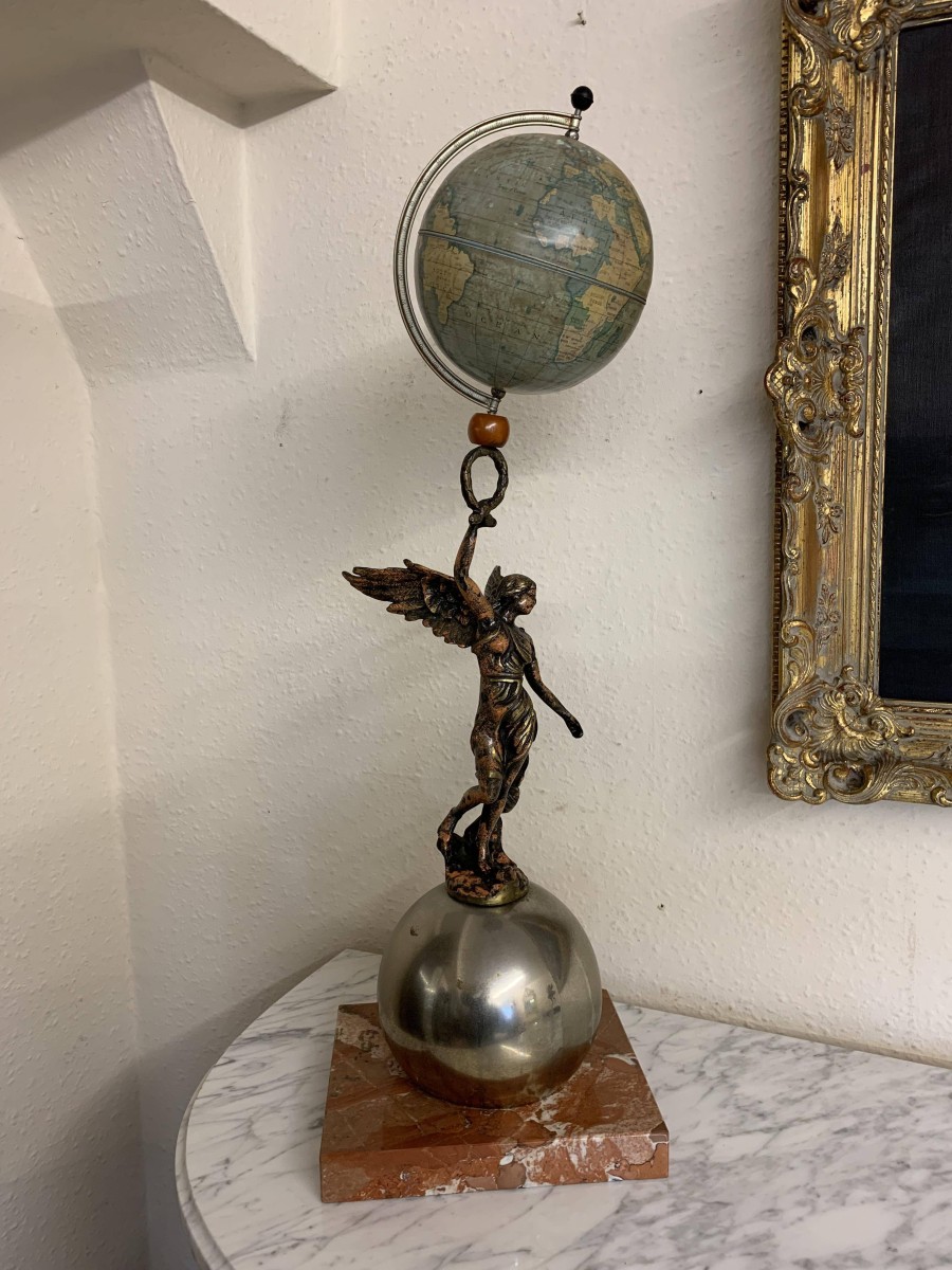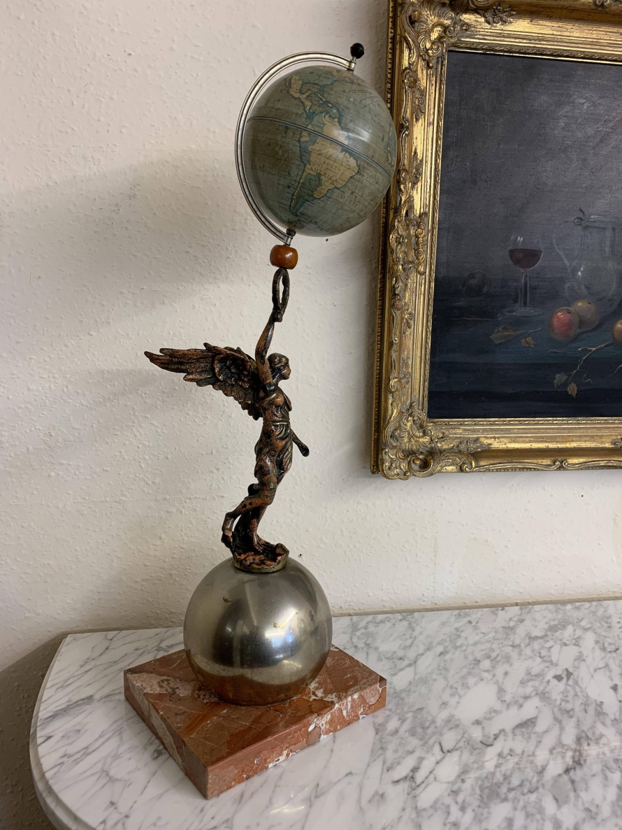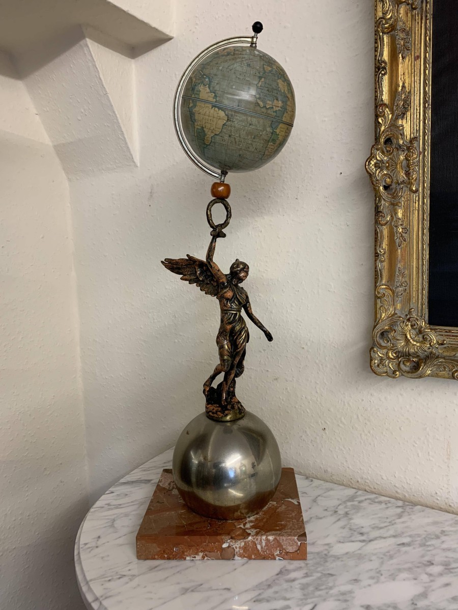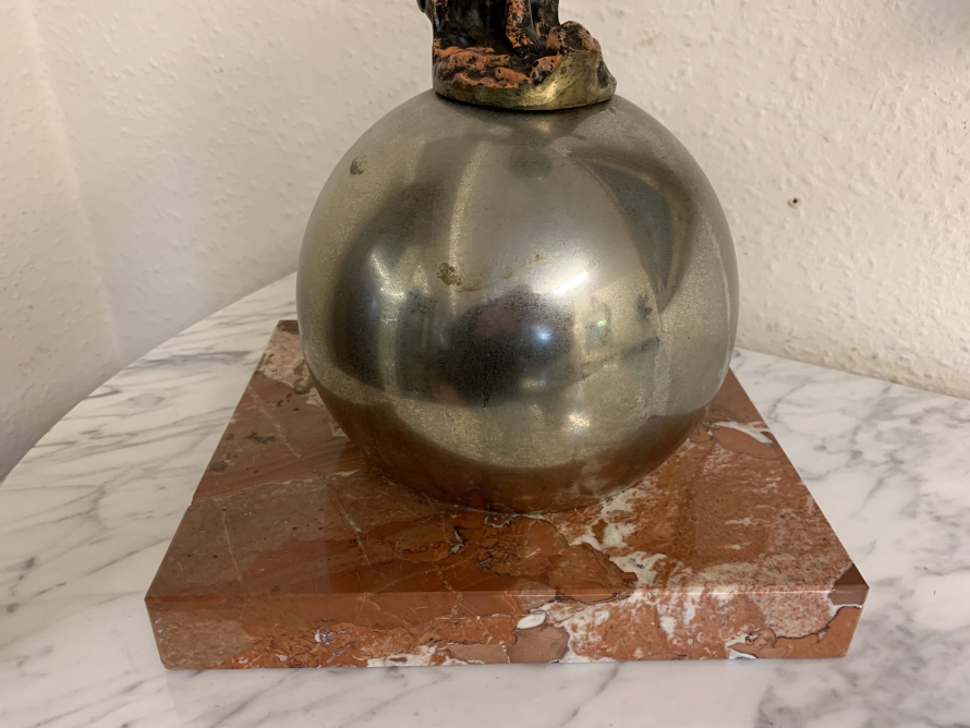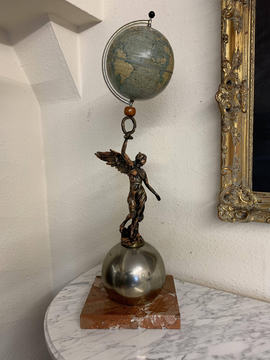 An unusual item having a revolving globe which sits above an ornate brass figure whiich sits above a brass sphere and marble base.