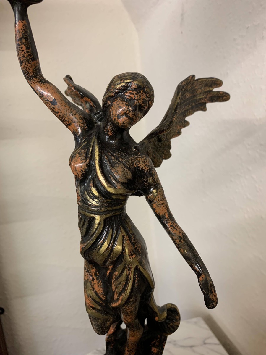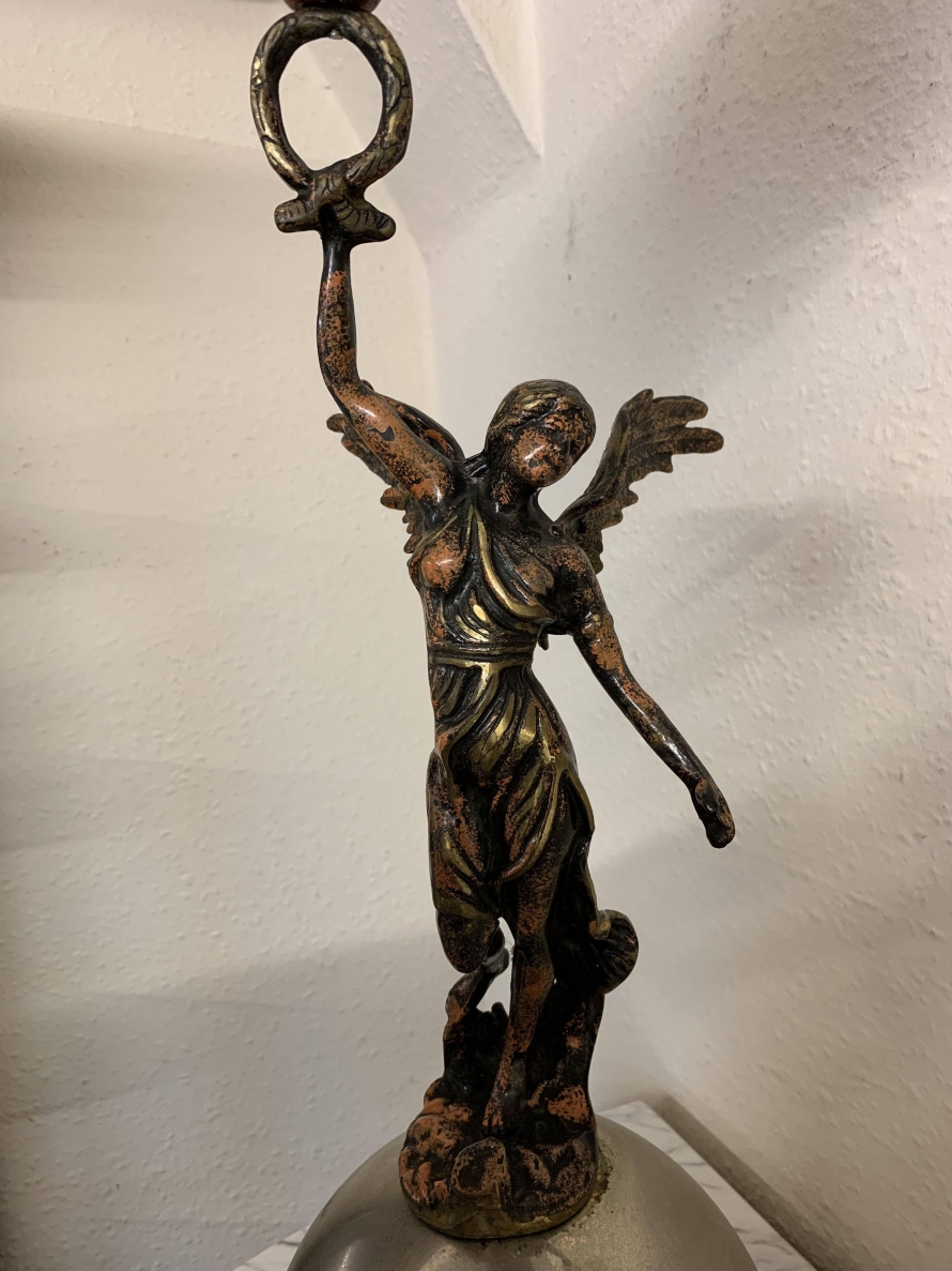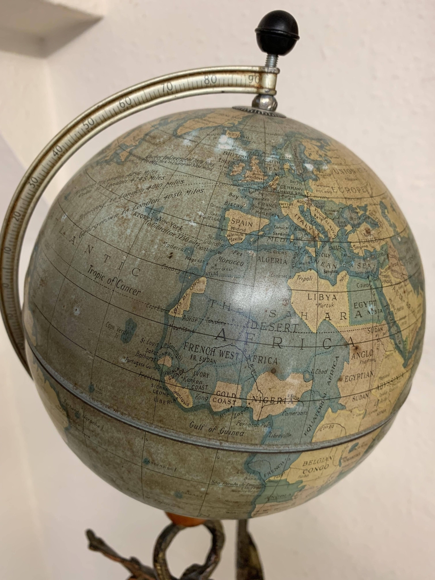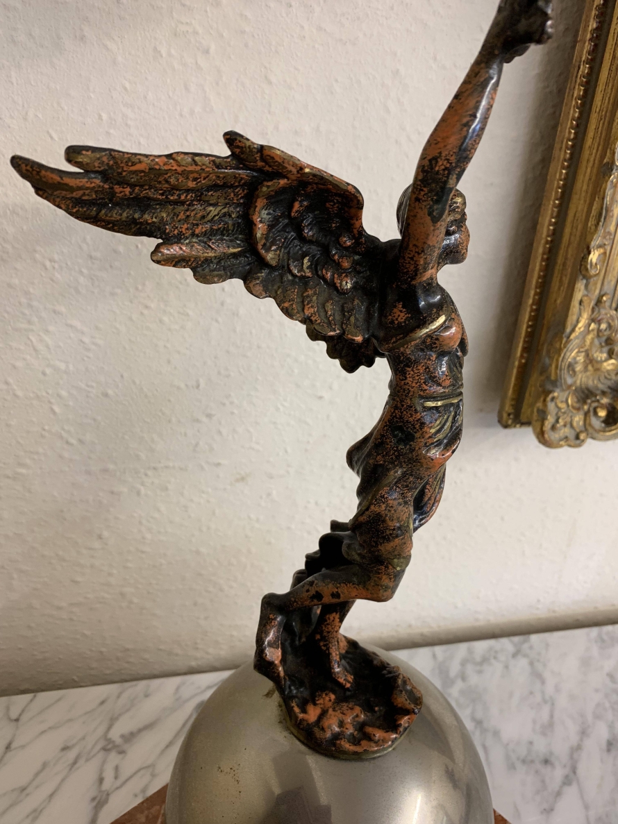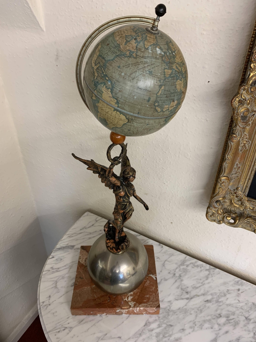 An unusual item having a revolving globe which sits above an ornate brass figure whiich sits above a brass sphere and marble base.