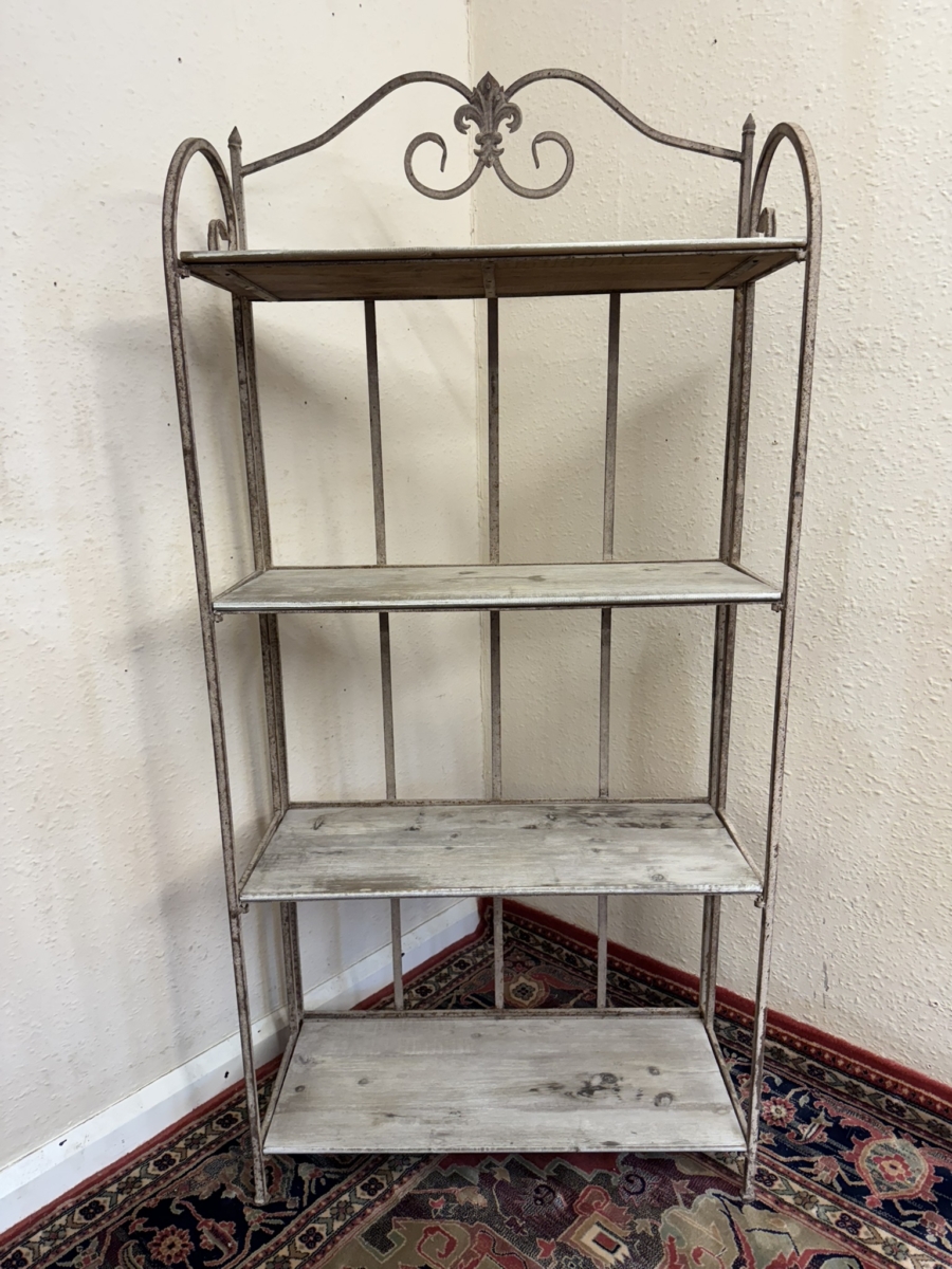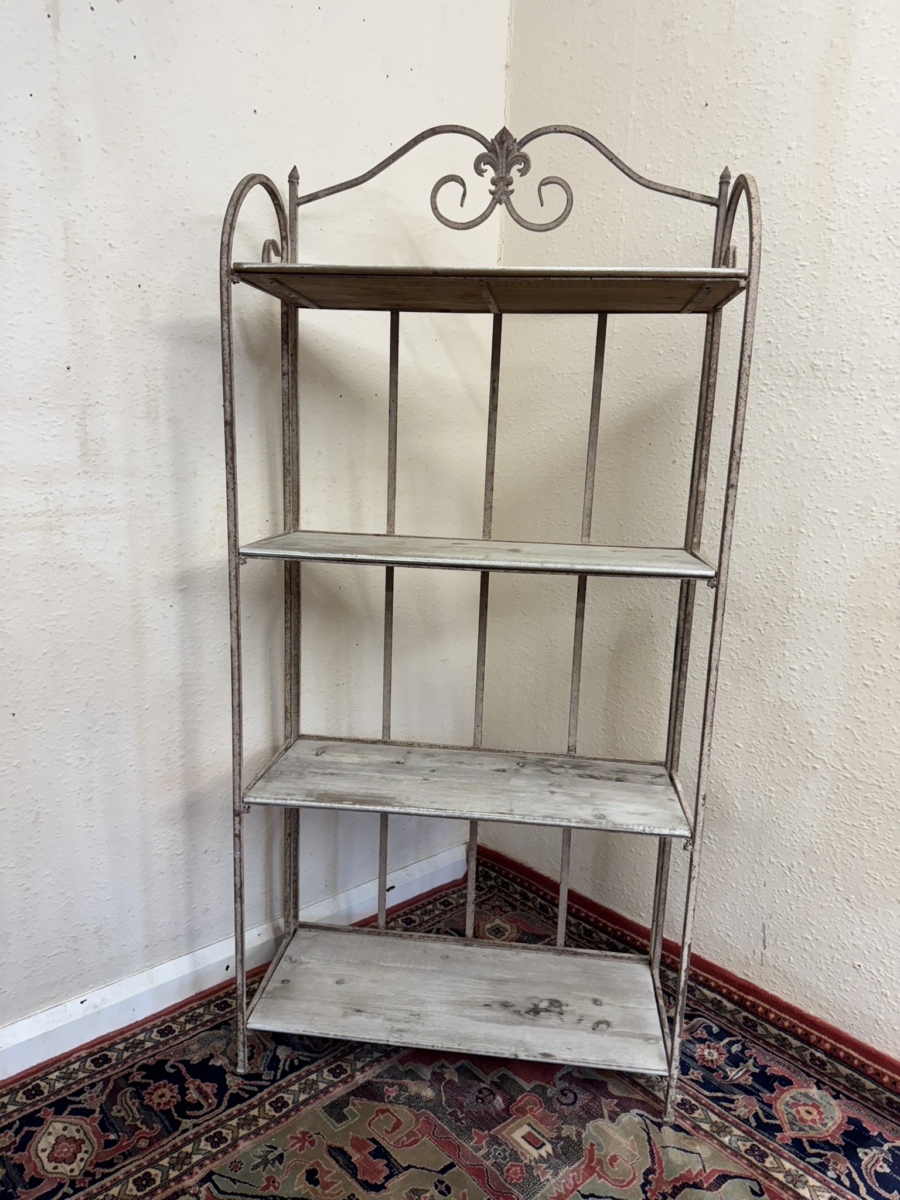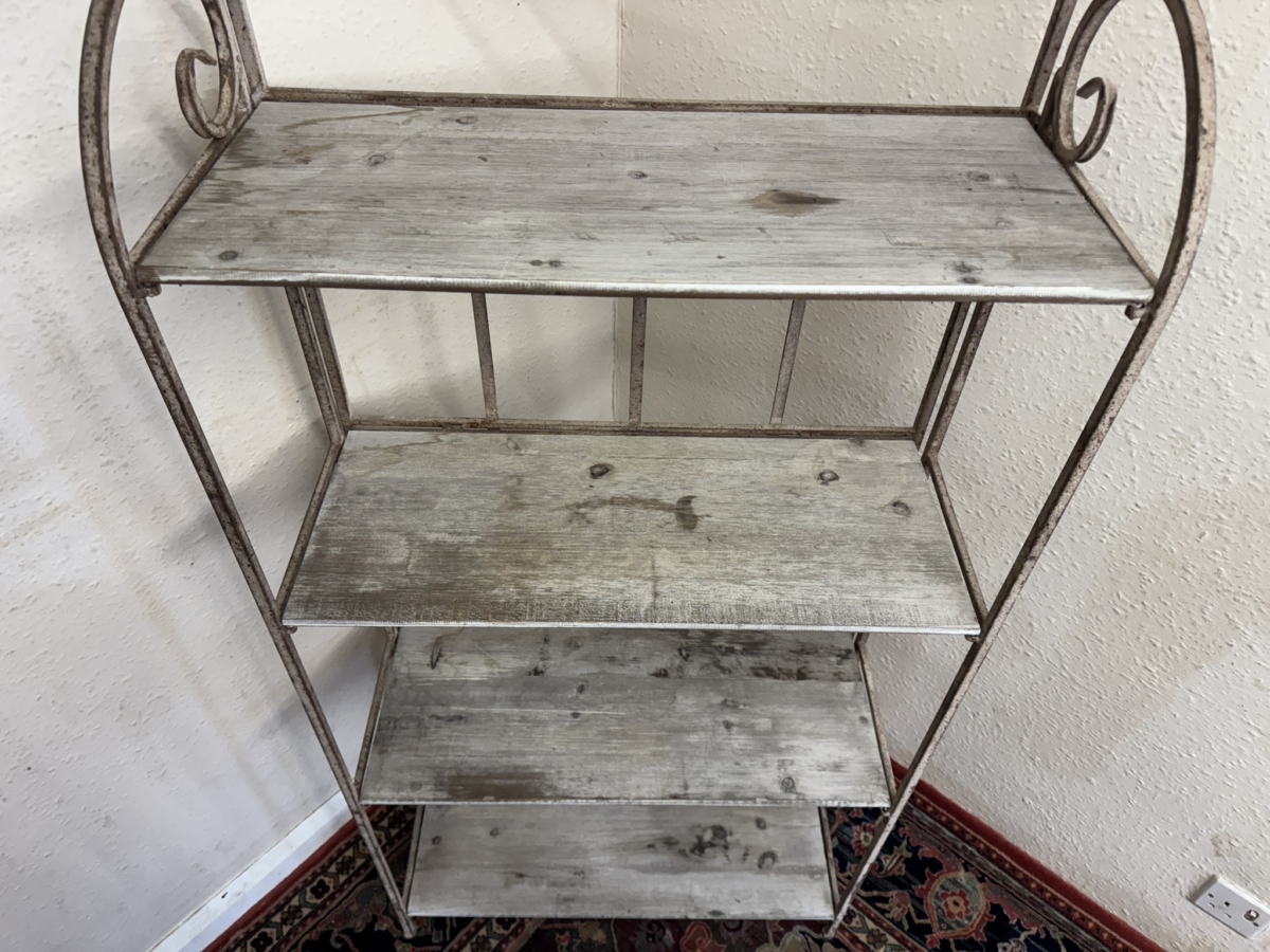 The metal frame has an ornate shaped top, below are four white washed wooden shelves. The stand folds for easy storage.