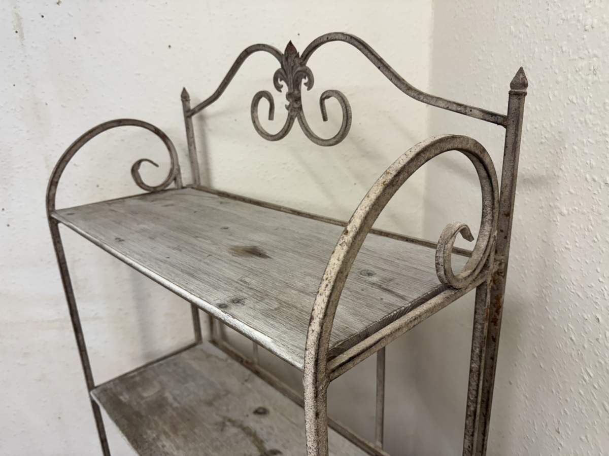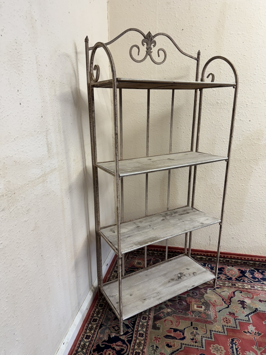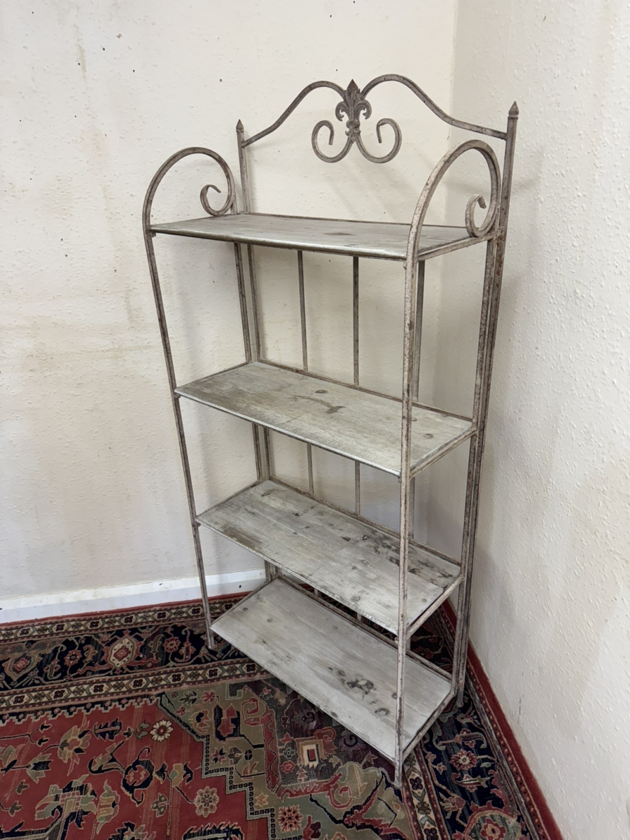 The metal frame has an ornate shaped top, below are four white washed wooden shelves. The stand folds for easy storage.