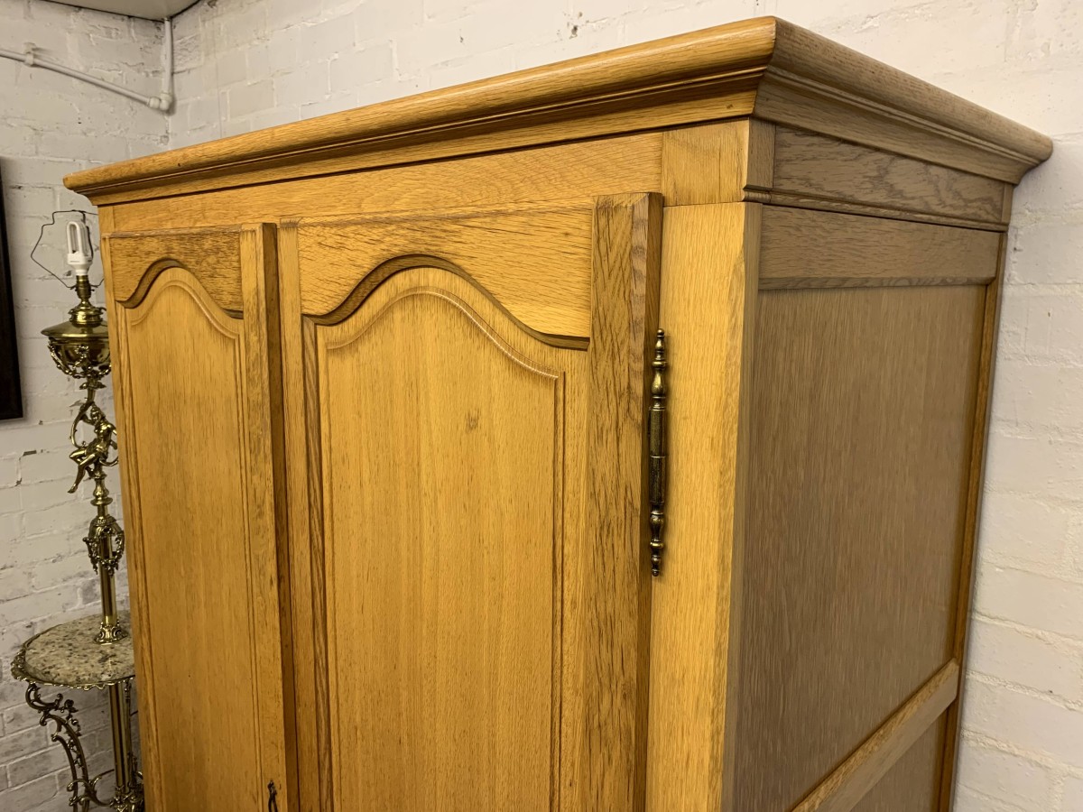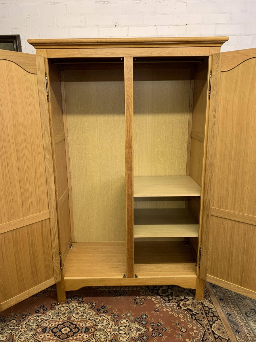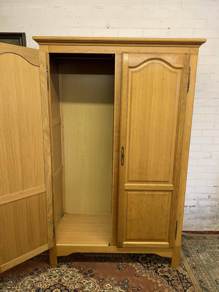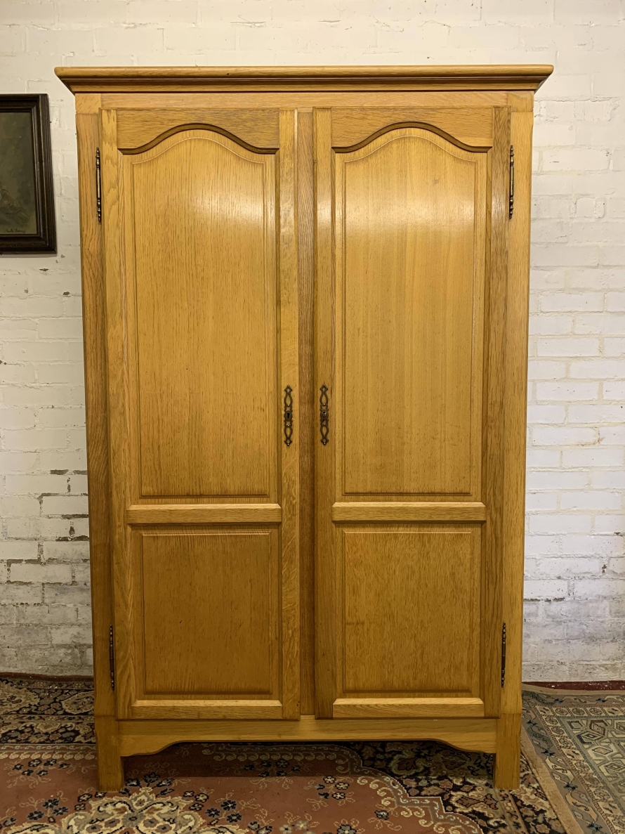 The oversailing top sits above a pair of shaped recessed panelled lockable doors, each door having brass hinges and decorative escutcheon. The left-hand door opens to reveal a hanging rail. The right-hand door opens to reveal a hanging rail above two removable shelves. Recessed panelled sides, shaped skirt and standing on four block feet. Please note this armoire completely splits down for easy transportation and delivery into any home.
