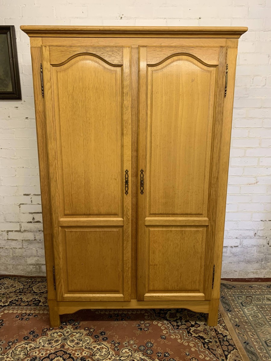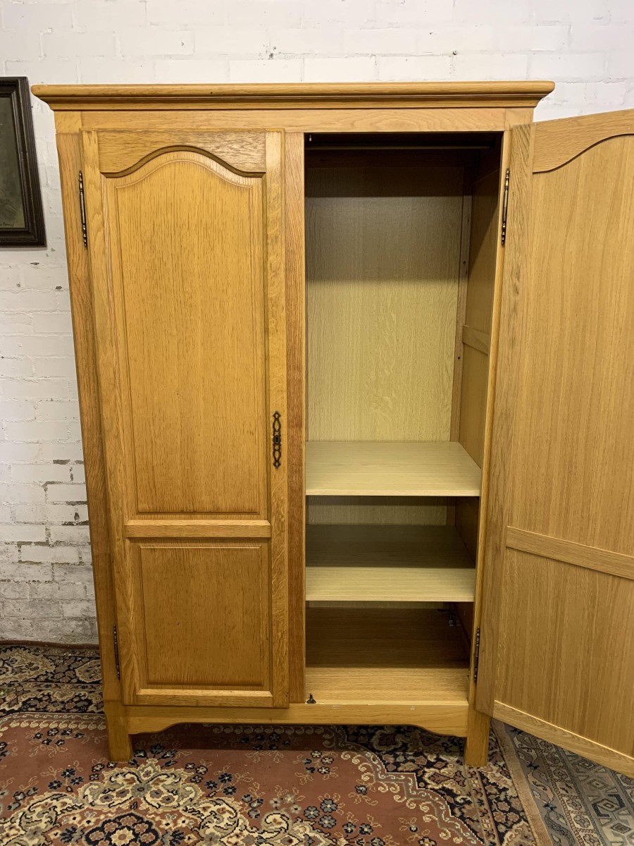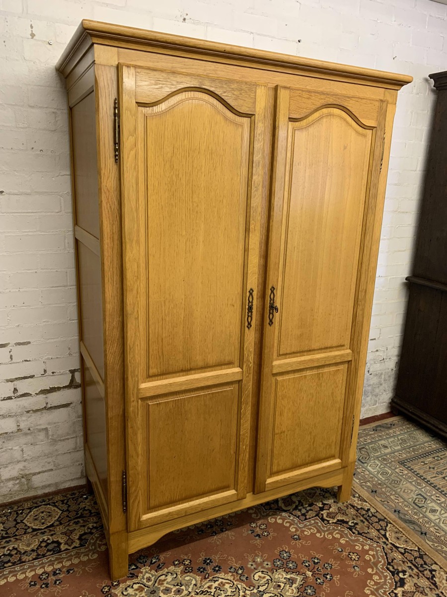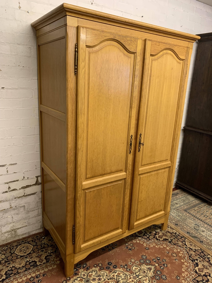 The oversailing top sits above a pair of shaped recessed panelled lockable doors, each door having brass hinges and decorative escutcheon. The left-hand door opens to reveal a hanging rail. The right-hand door opens to reveal a hanging rail above two removable shelves. Recessed panelled sides, shaped skirt and standing on four block feet. Please note this armoire completely splits down for easy transportation and delivery into any home.