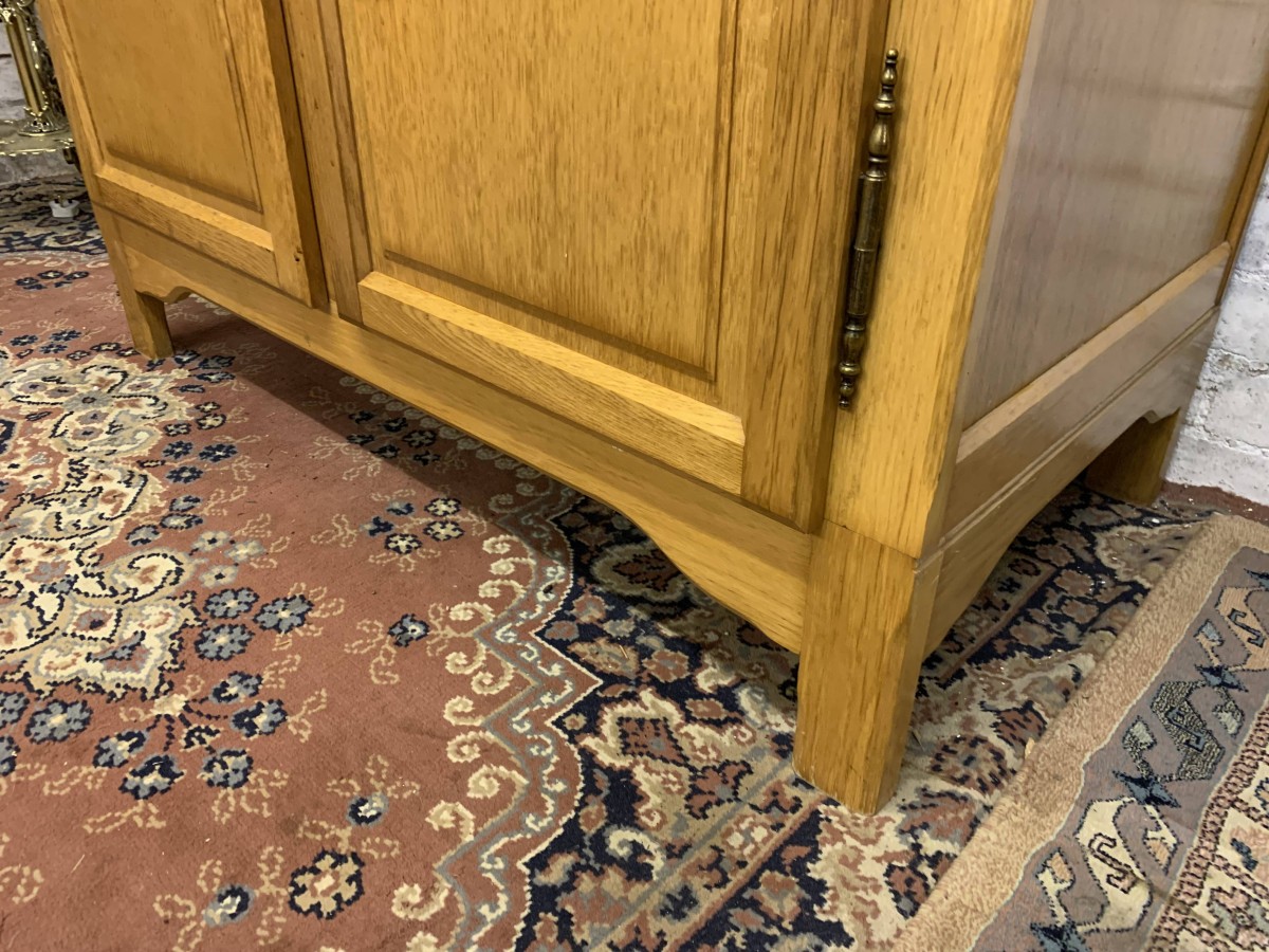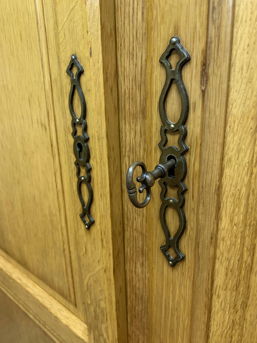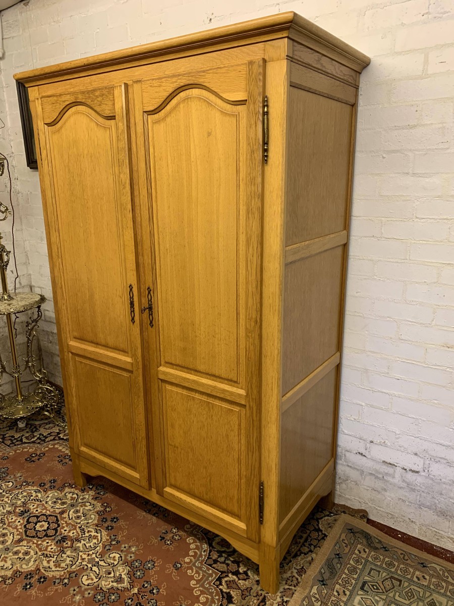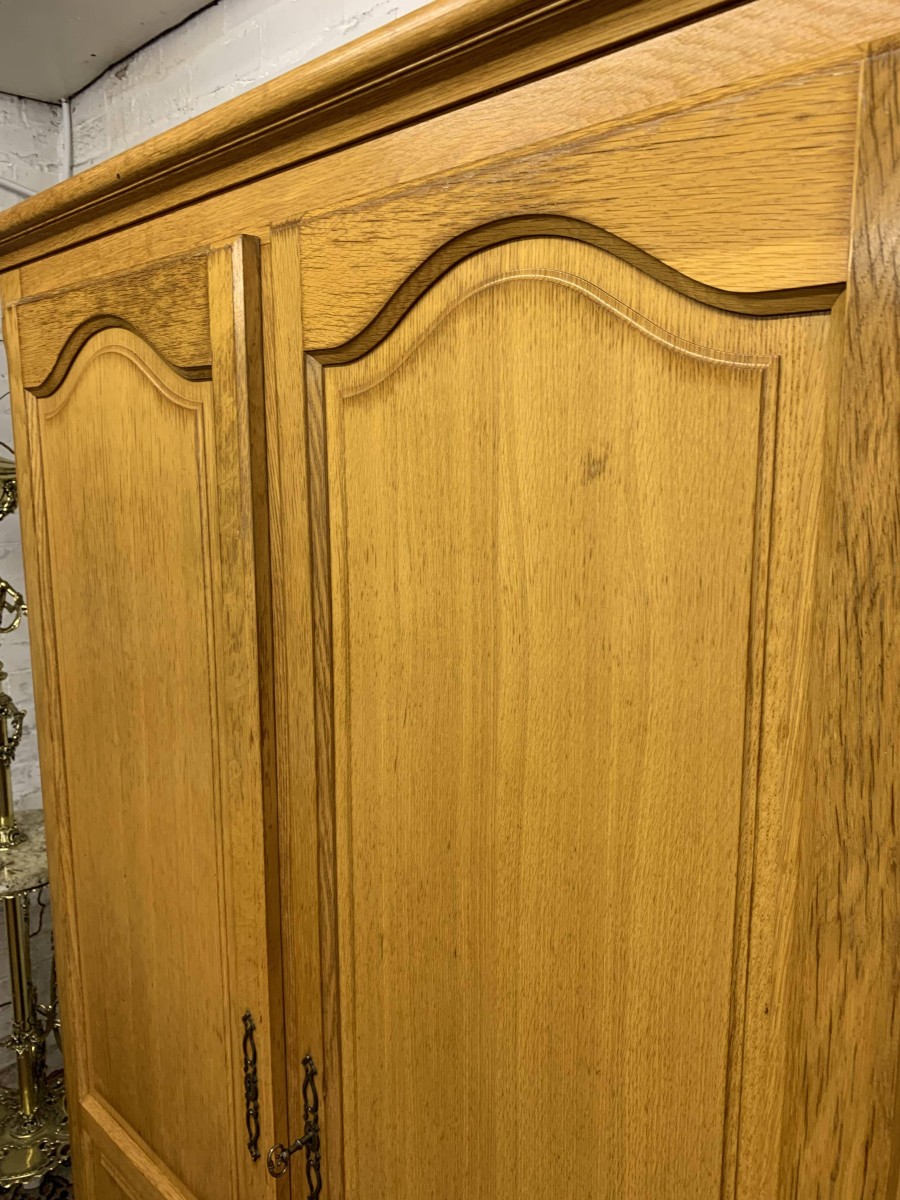 The oversailing top sits above a pair of shaped recessed panelled lockable doors, each door having brass hinges and decorative escutcheon. The left-hand door opens to reveal a hanging rail. The right-hand door opens to reveal a hanging rail above two removable shelves. Recessed panelled sides, shaped skirt and standing on four block feet. Please note this armoire completely splits down for easy transportation and delivery into any home.