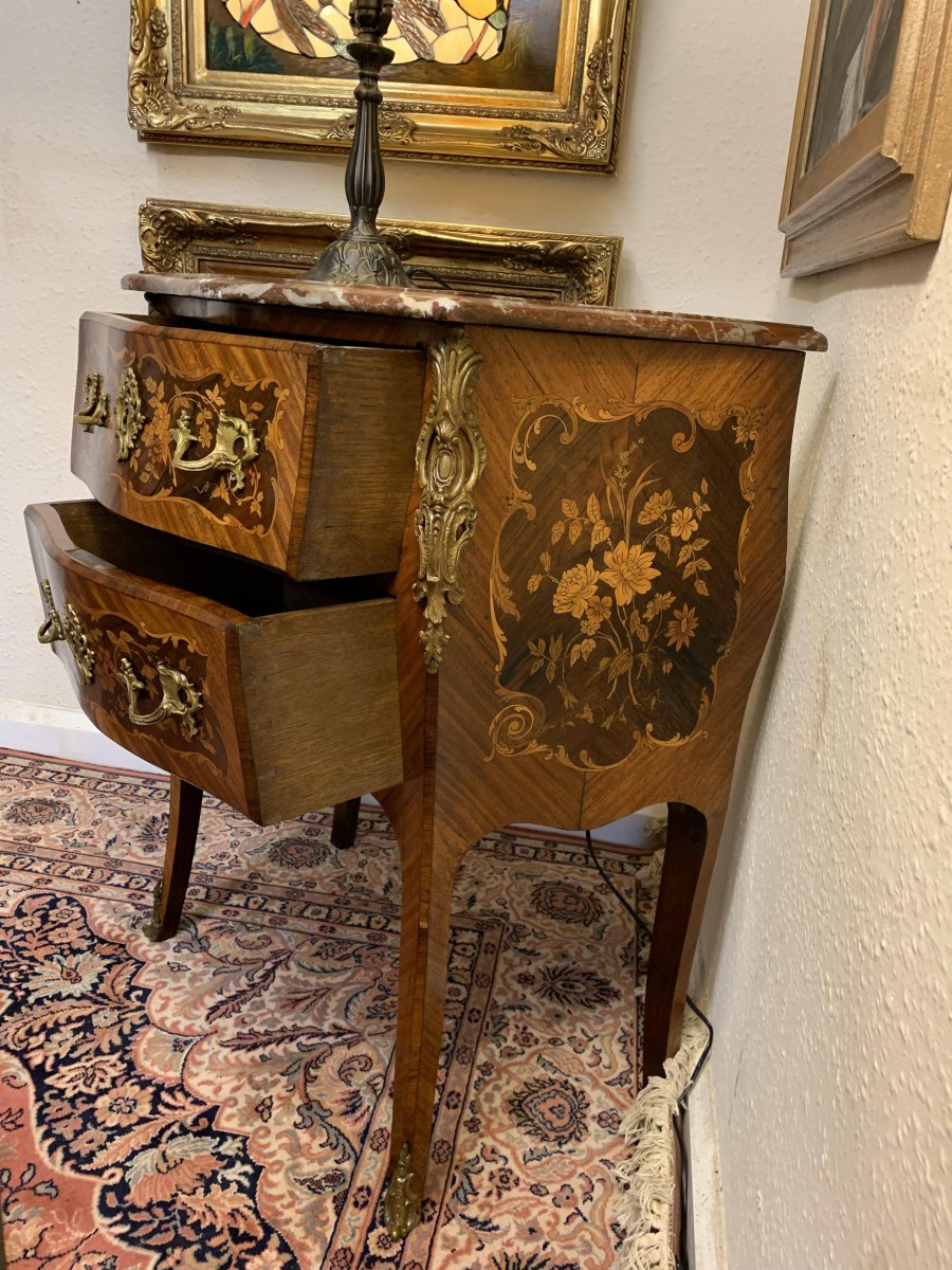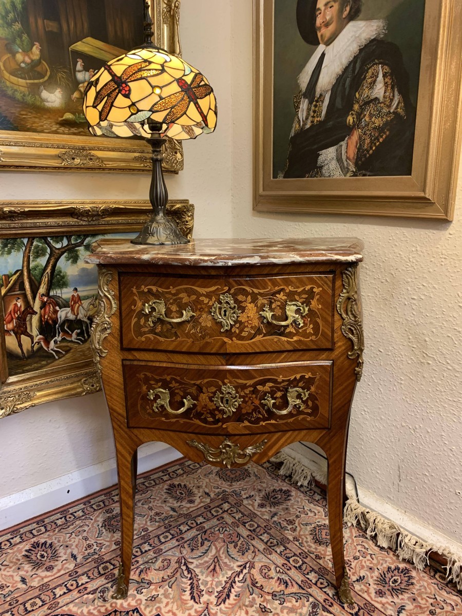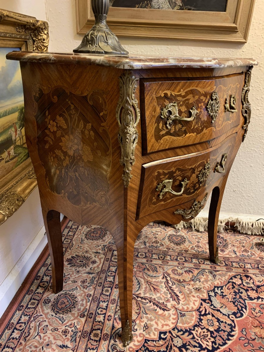 This fabulous French chest is in excellent condition. The shaped marble top sits above a pair of shaped marquetry inlaid drawers, each drawer having gilt handles and escutcheon with a gilt decoration below. The sides of the drawers also have gilt mounts. Shaped marquetry inlaid sides – this stunning commode sits on two out swept legs to the front each with decorative gilt mounts.